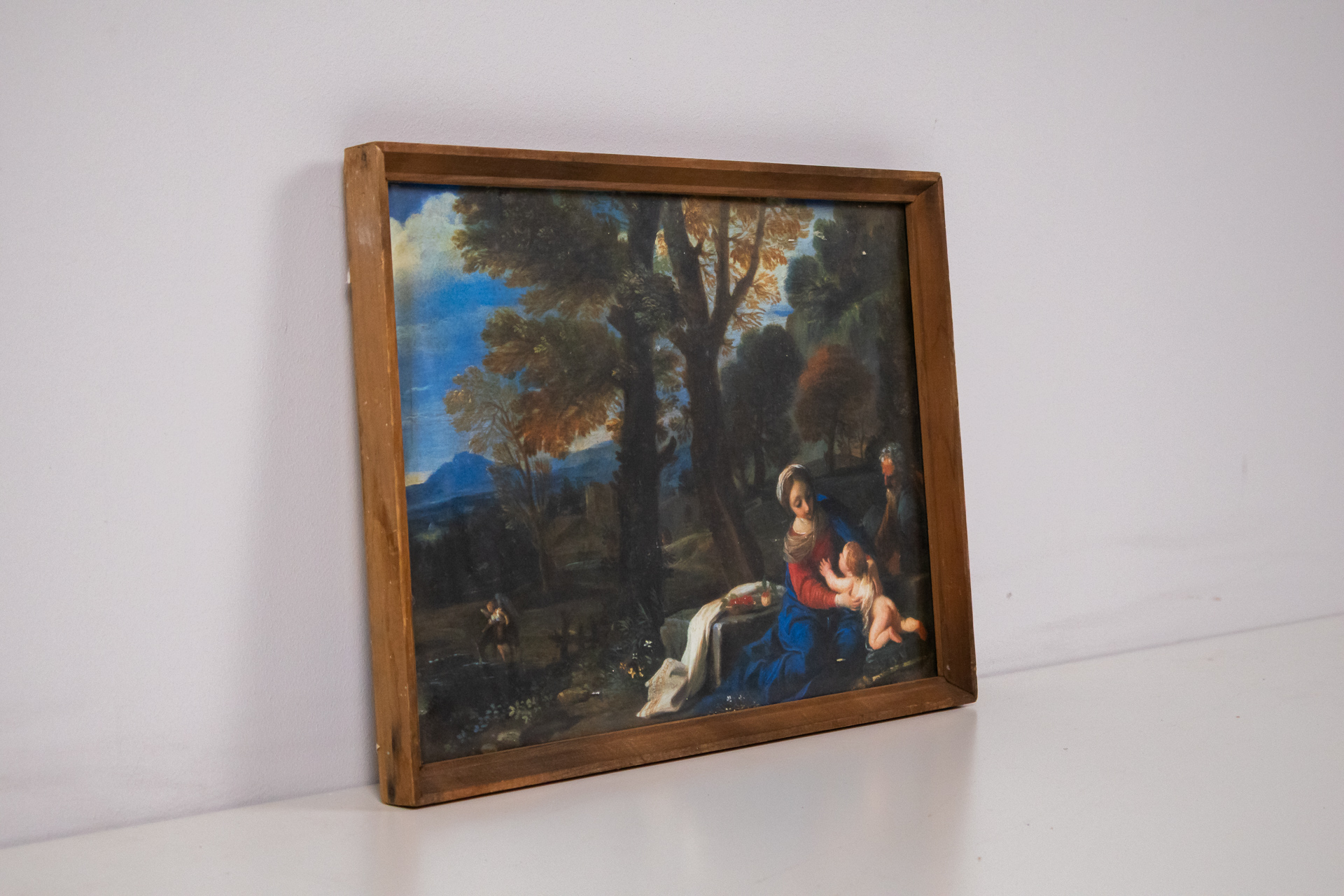 A kép egy szent családot ábrázol, ahol Szűz Mária a gyermek Jézust tartja az ölében, míg egy idős férfi és egy táj látható a háttérben. A festmény lágy színekkel készült, dominálnak a kék és zöld árnyalatok, a...