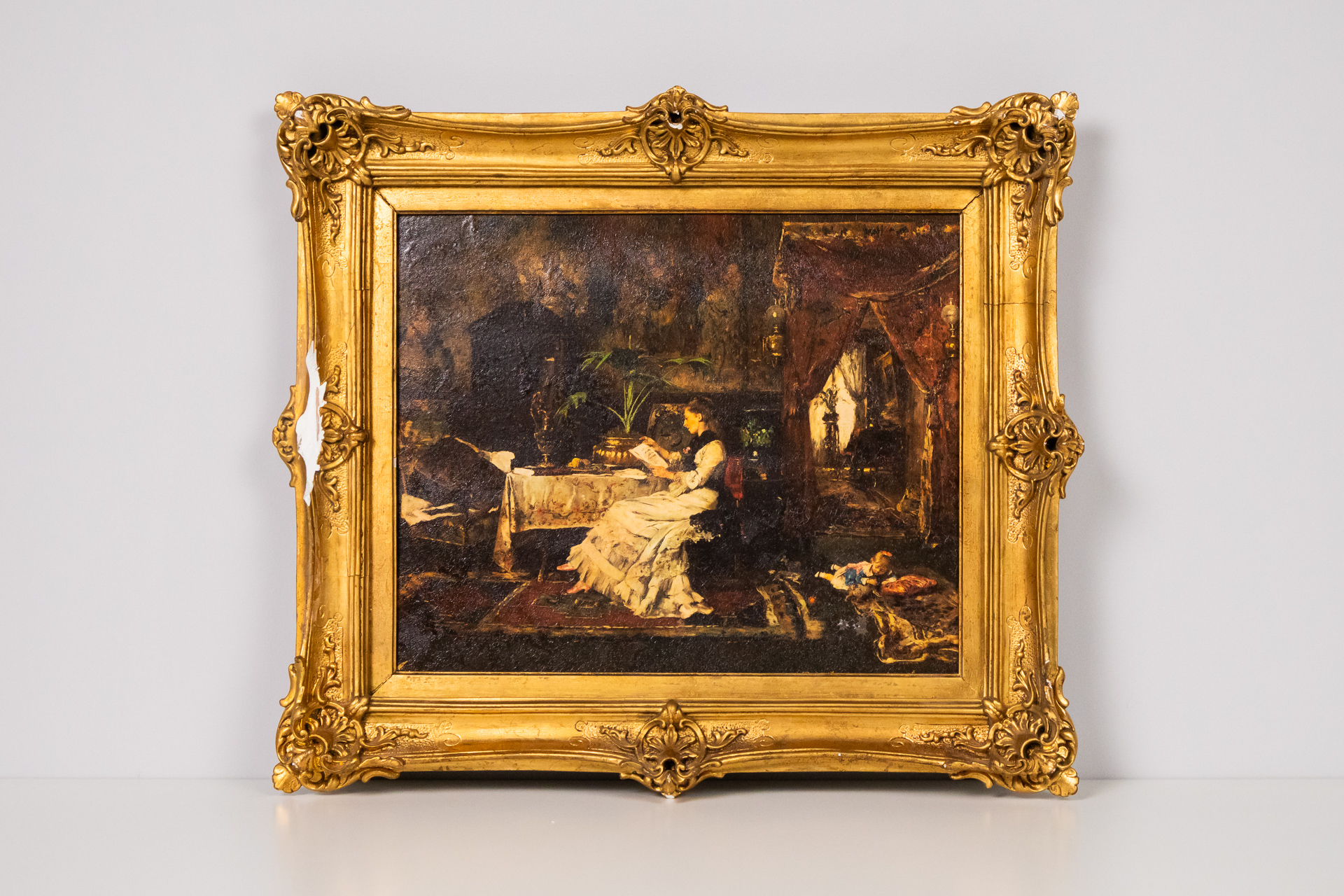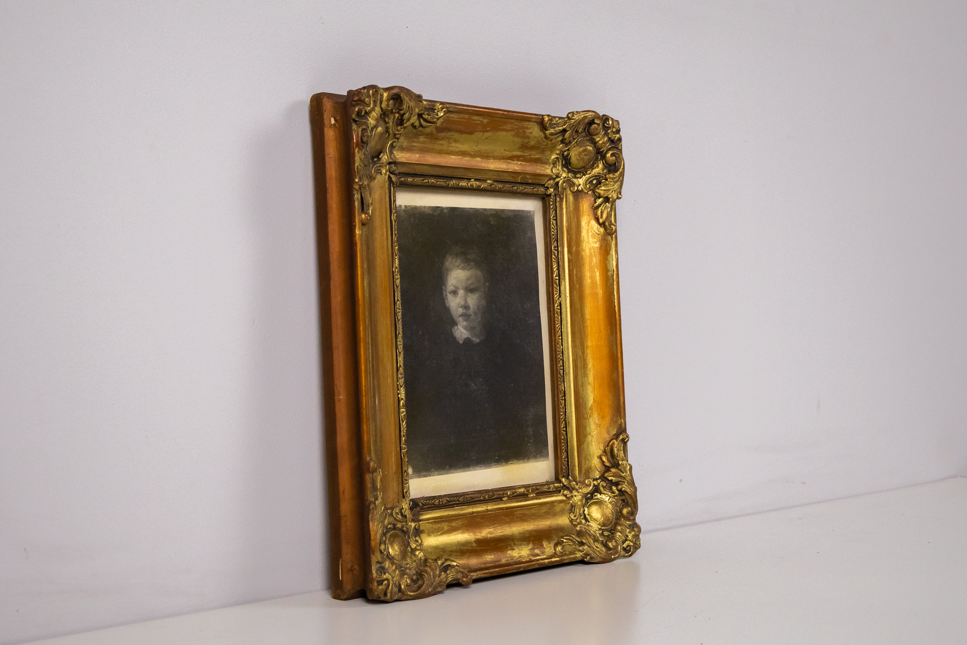 A kép egy fiatal gyermek portréját ábrázolja, akinek arca homályos, sötét háttér előtt. A festmény technikája valószínűleg olajfestés, a stílus pedig a klasszikus portréábrázolás. Az aranyozott keret díszes, faragott...