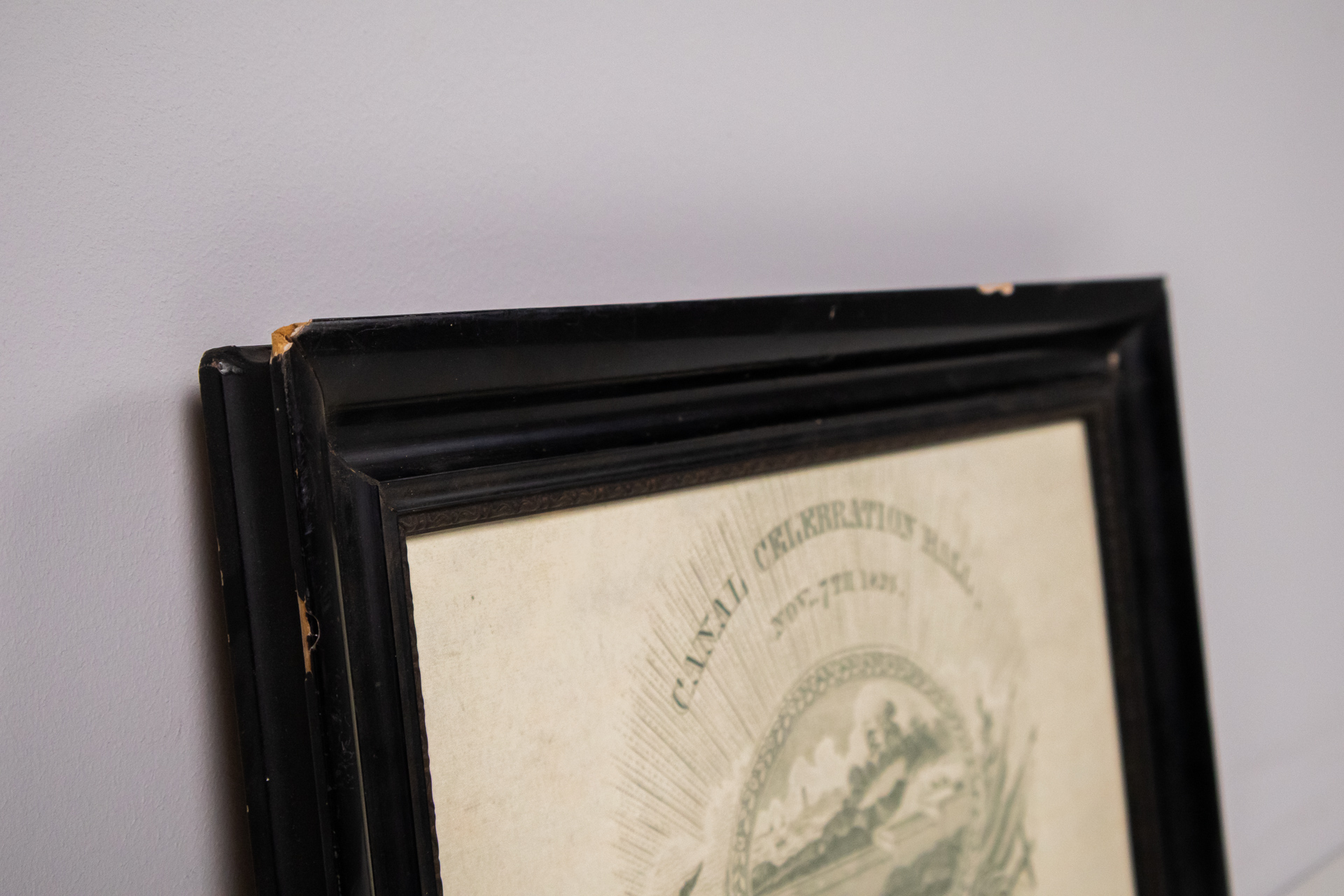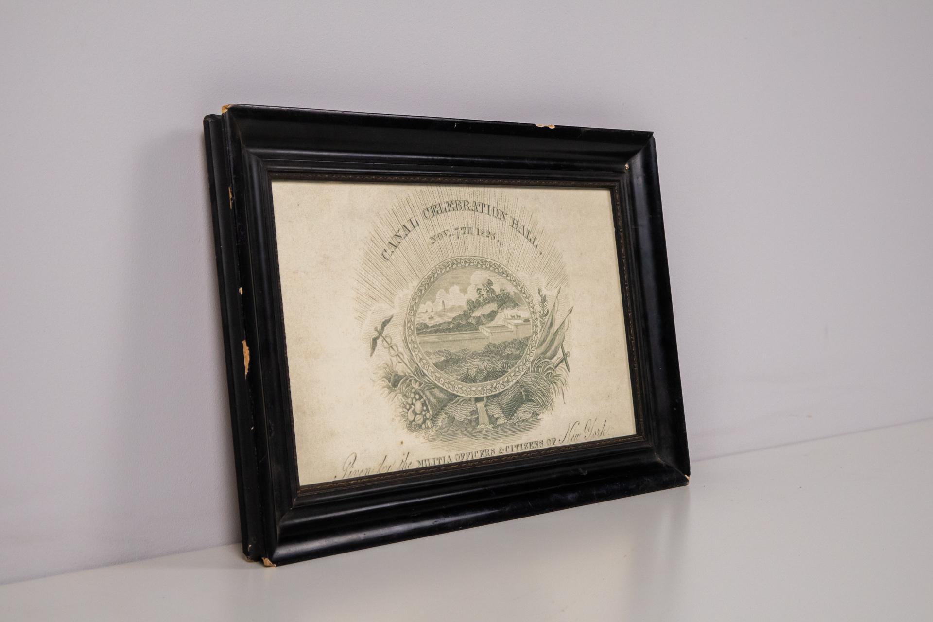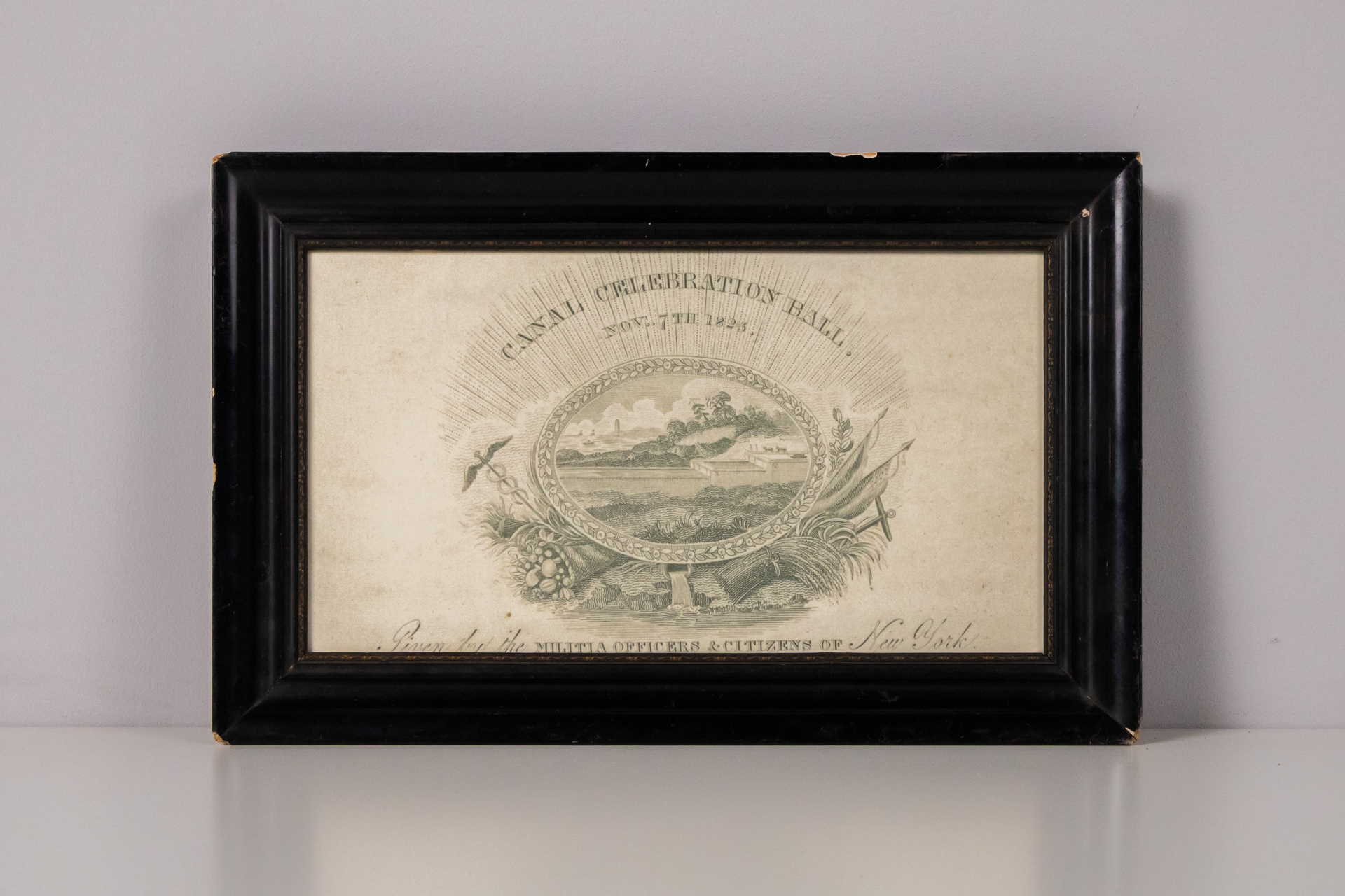 A kép egy régi ünnepi meghívót ábrázol, amely a 'Canal Celebration Hall' felirattal rendelkezik, 1825-ből származik. Az illusztráció középpontjában egy tájképi jelenet látható, amely dombokat, folyót és növényeket...