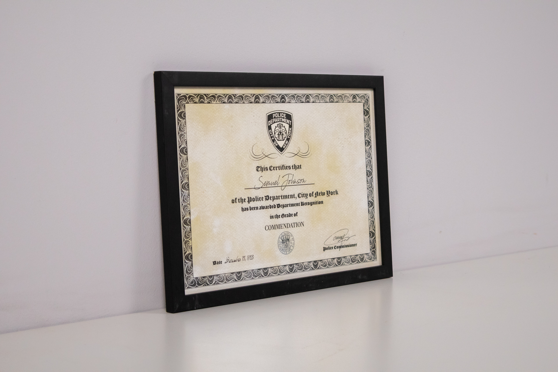 Hivatalos elismerő oklevél, amely a New York-i Rendőrség által kiadott, Samuel Johnson részére, a 'Commendation' fokozatban. Az oklevél elegáns, antikolt papíron készült, díszes kerettel, amely fekete színű és modern...
