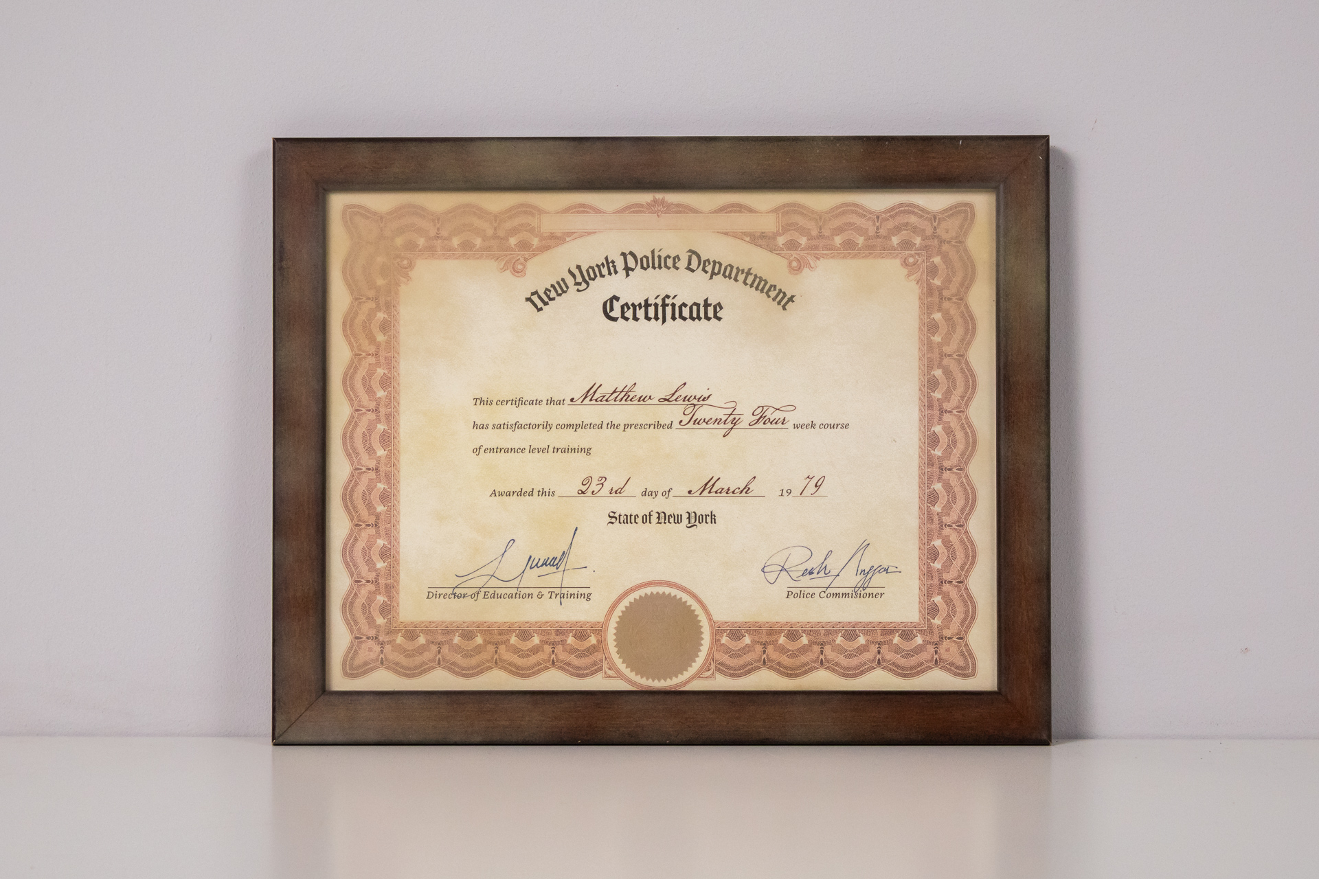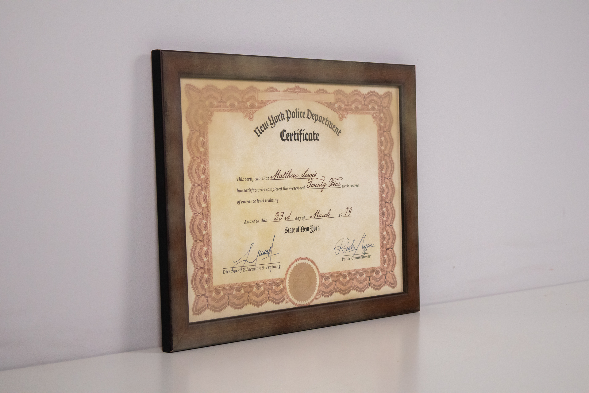 A New York Police Department által kiadott oklevél, amely tanúsítja, hogy a címzett sikeresen teljesítette a huszonnégy hetes belépő szintű képzést. Az oklevél díszes kerettel rendelkezik, amely barna színű, fa...