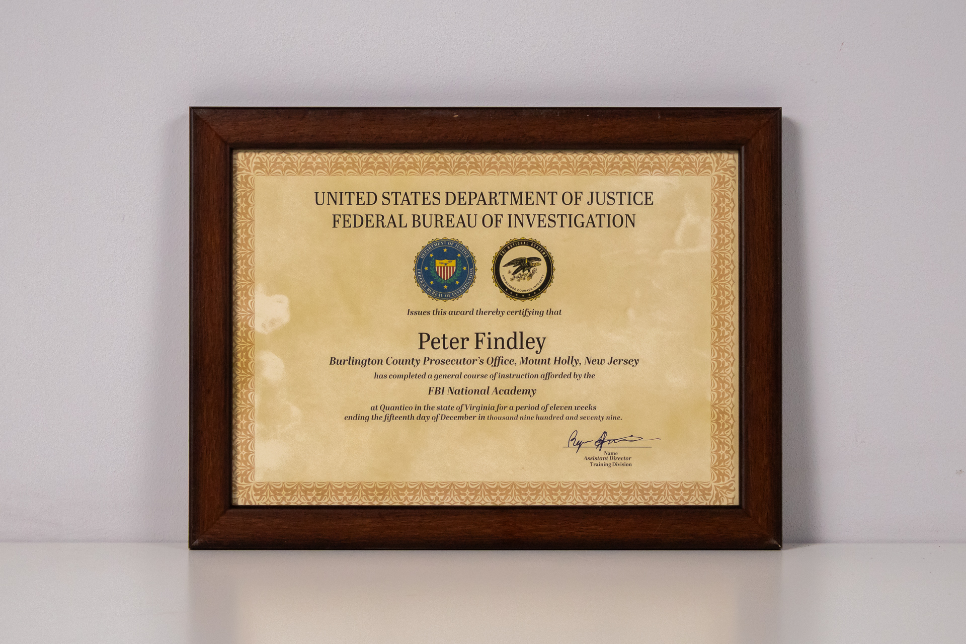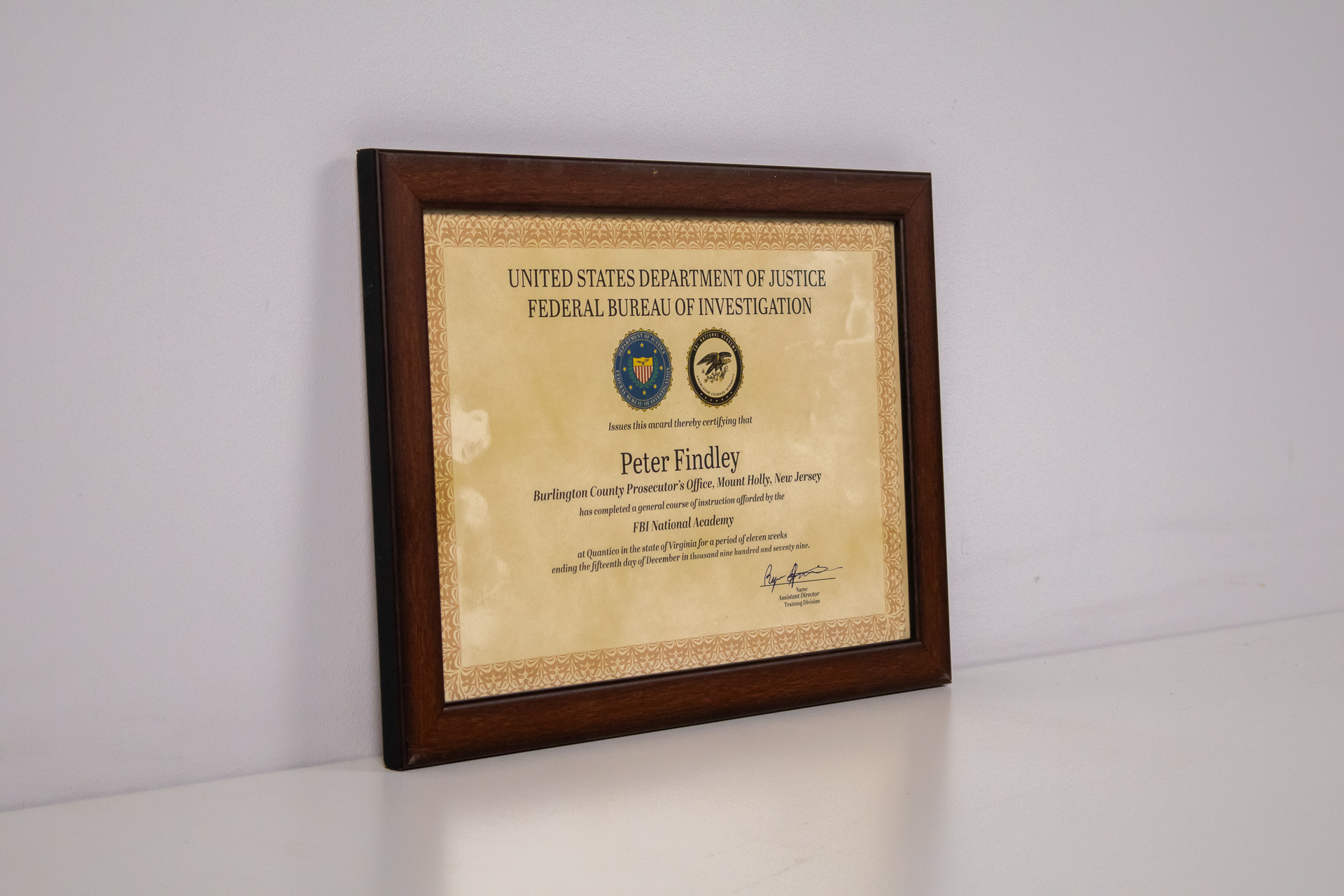 Hivatalos oklevél, amely az Egyesült Államok Igazságügyi Minisztériumának és a Szövetségi Nyomozó Irodának (FBI) a logójával díszített. Az oklevél tanúsítja, hogy Peter Findley, a Burlington megyei ügyész hivatala...