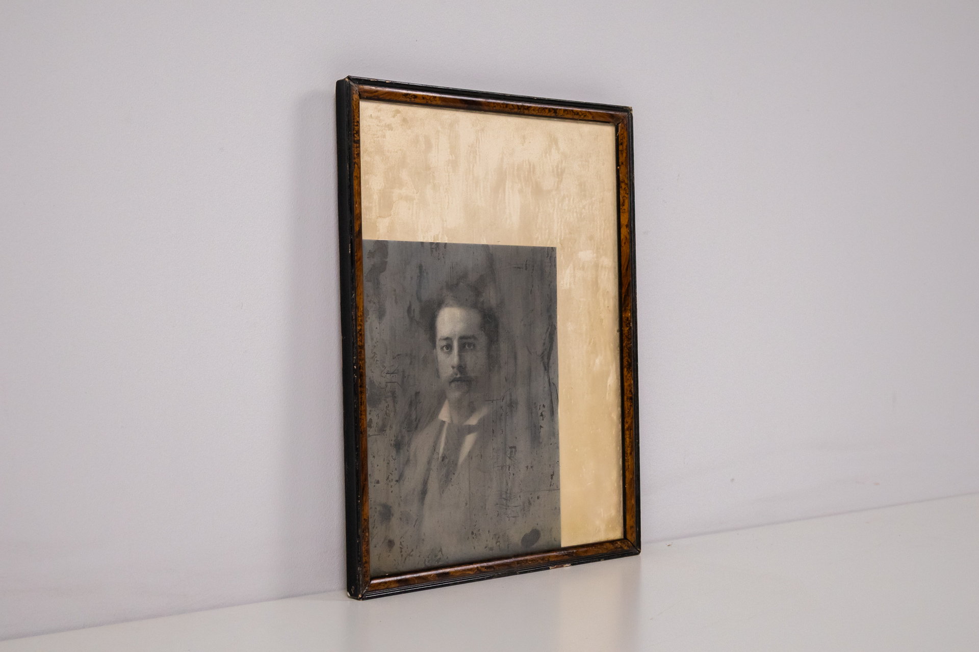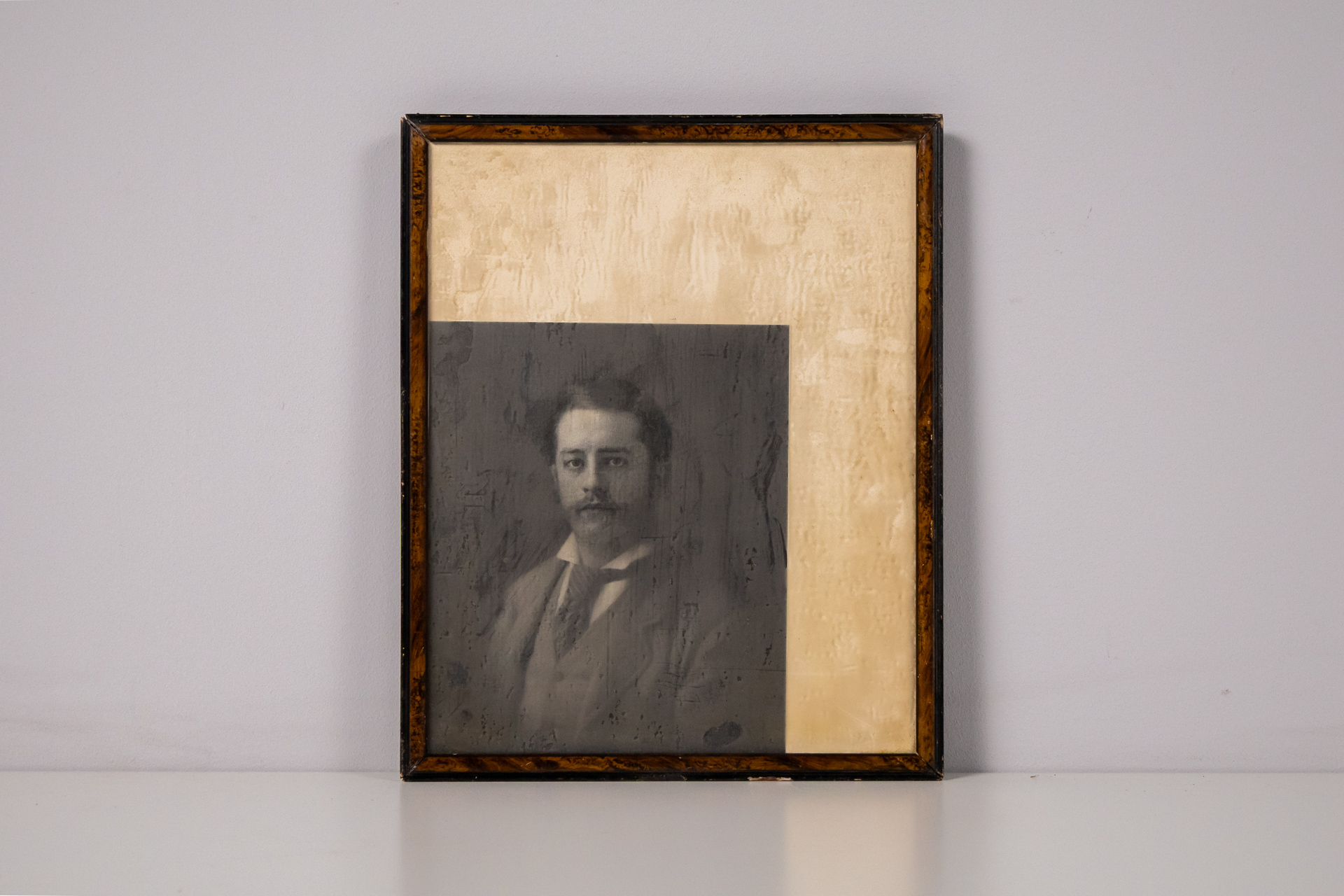 A kép egy fekete-fehér fényképet ábrázol, amely egy férfit mutat be, aki elegáns öltönyt visel. A háttér homályos, a kép felső része világosabb, míg az alsó rész sötétebb tónusú. A keret sötétbarna fából készült,...