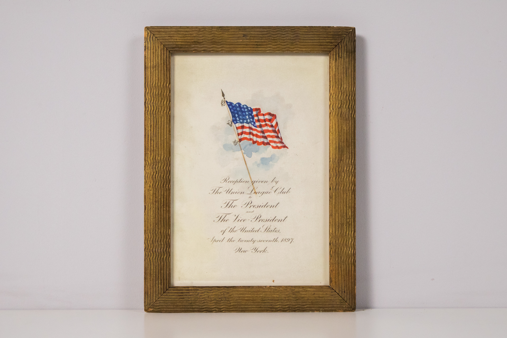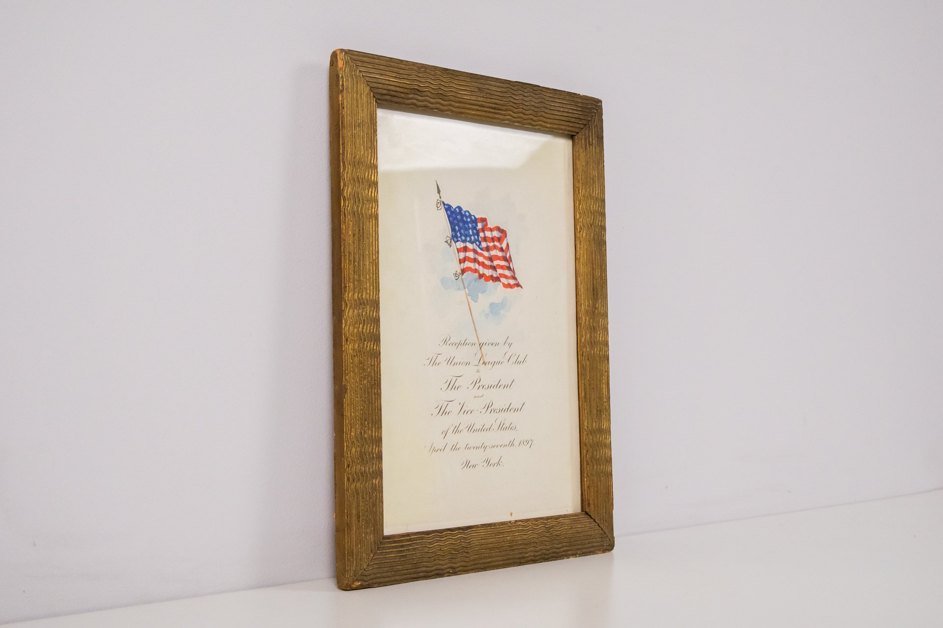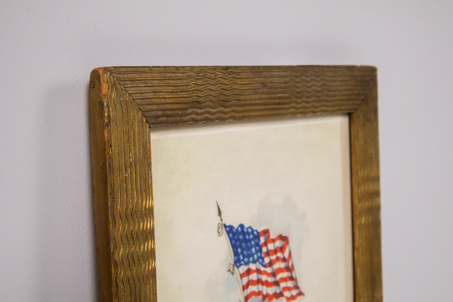 Vízfestmény, amely egy amerikai zászlót ábrázol, lágy kék háttér előtt. A zászló színei élénk piros, fehér és kék, a szélben lobog. A keret aranyozott, fa anyagú, finoman barázdált felülettel, klasszikus stílusban