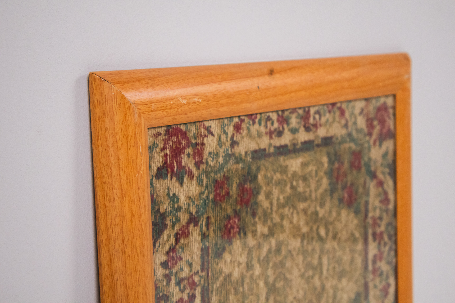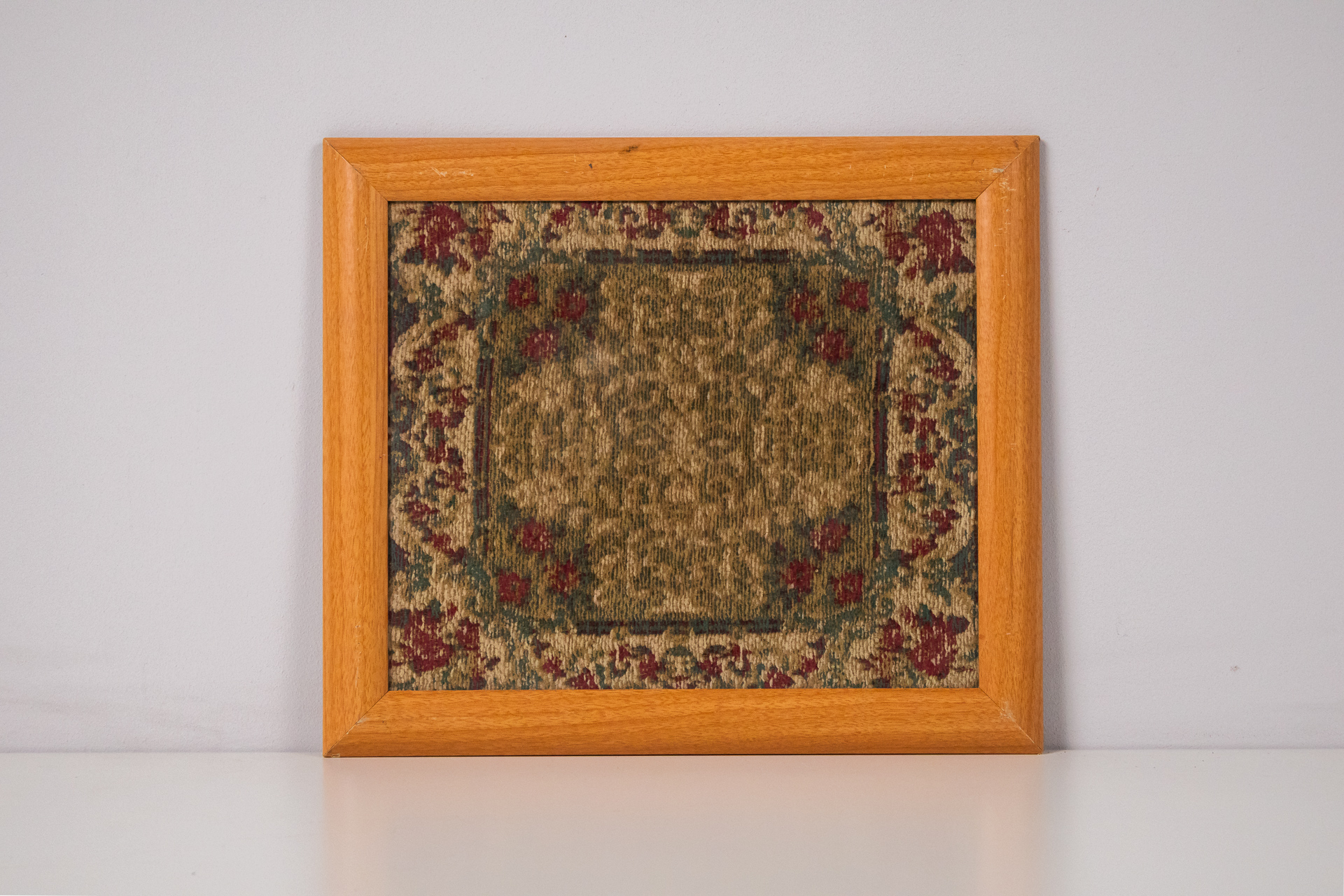 A kép egy kárpit mintázatot ábrázol, amely gazdag színekben és részletes virágmotívumokkal díszített. A háttér színe zöldes árnyalatú, míg a motívumok vörös és kék színekben pompáznak. A keret világos fából készült,...