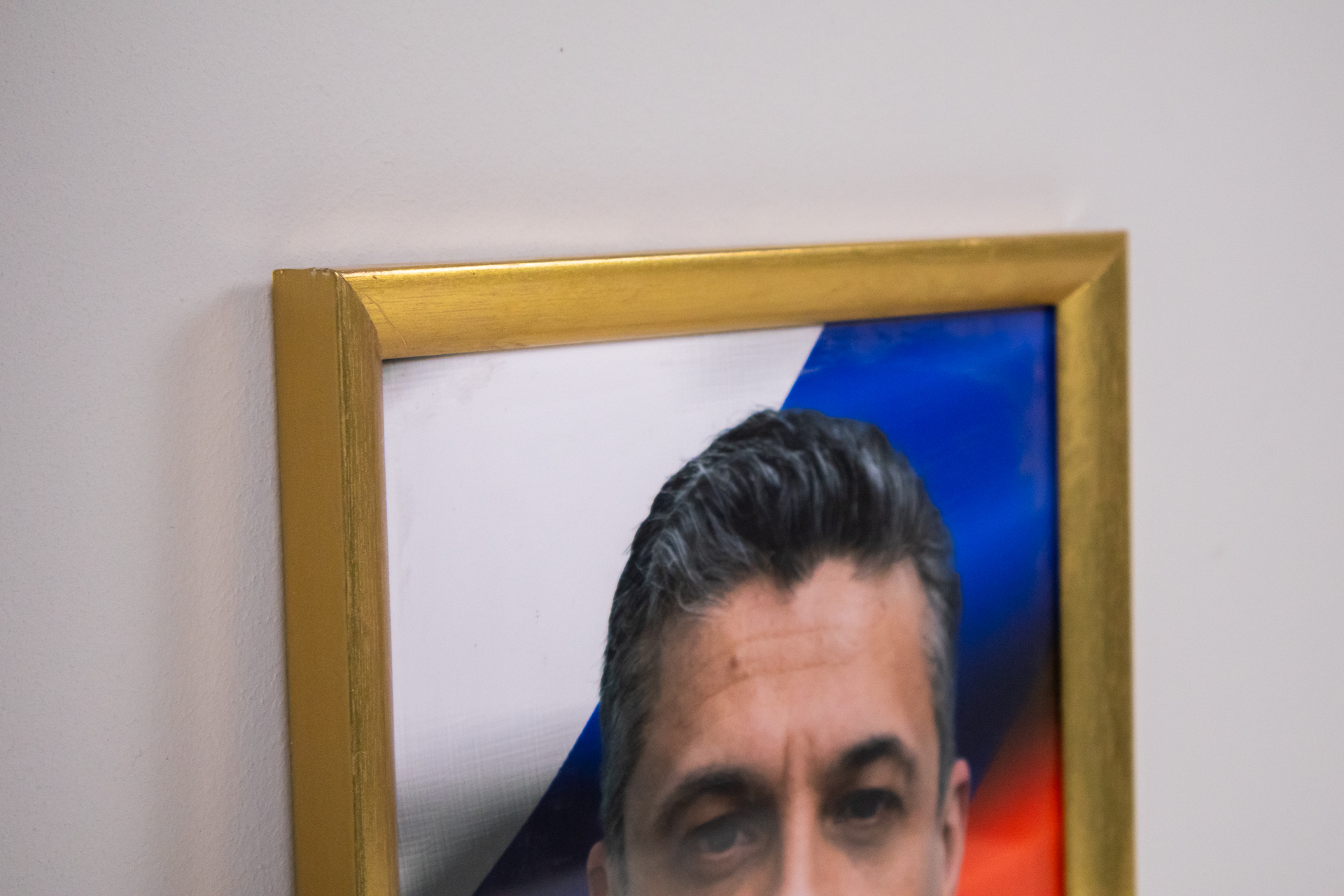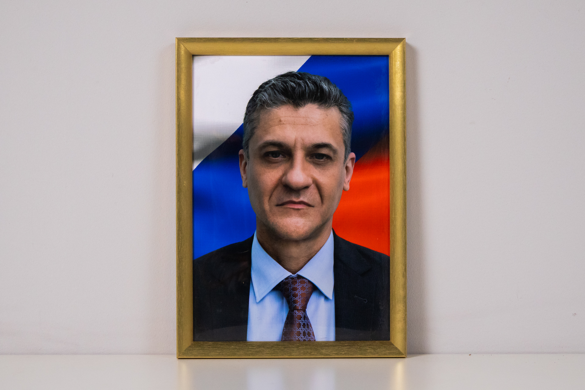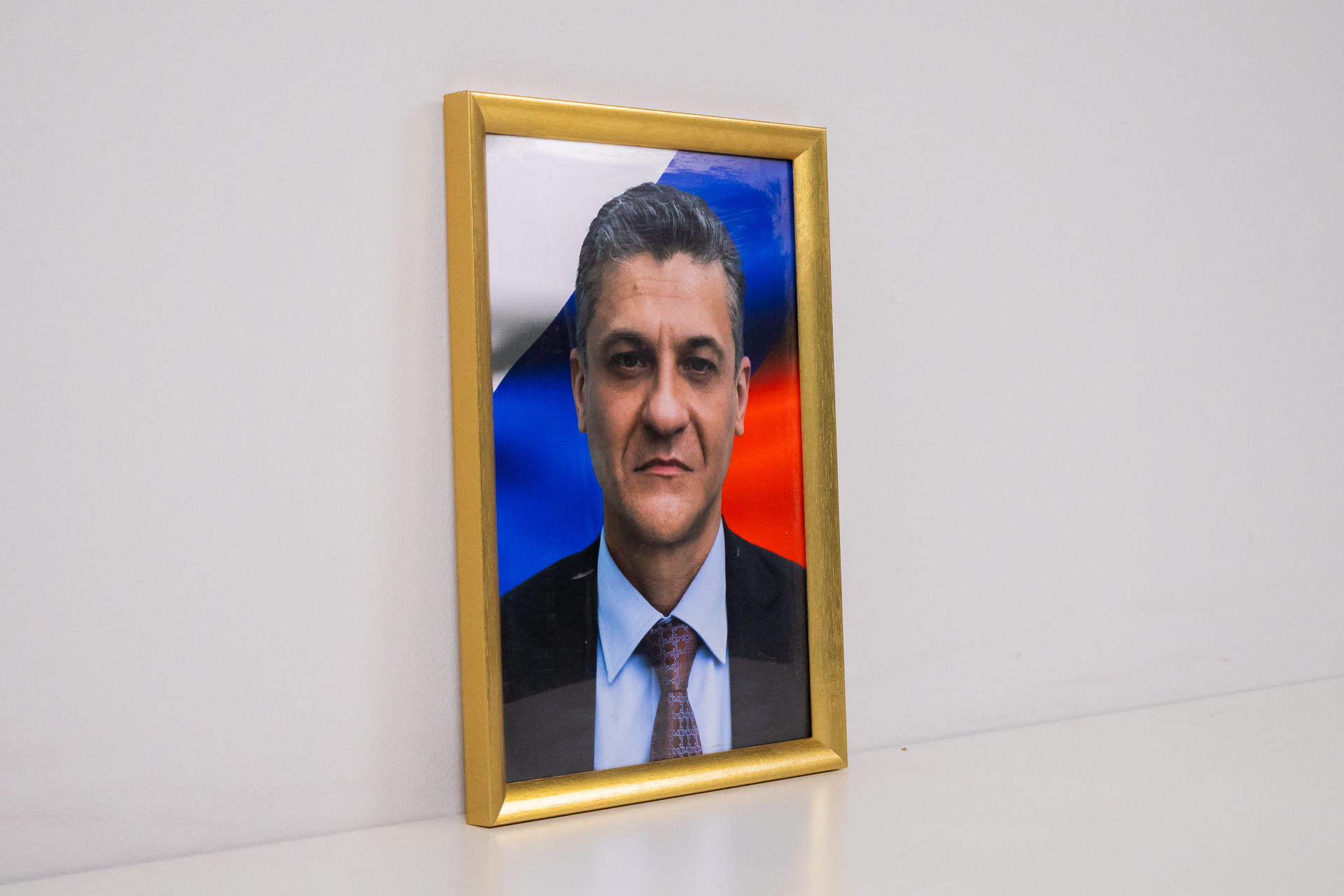 A kép egy férfi portréját ábrázolja, formális öltözetben, háttérben a orosz zászló színeivel. A portré modern digitális technikával készült, éles részletekkel és élénk színekkel. Az arany keret egyszerű, de elegáns,...