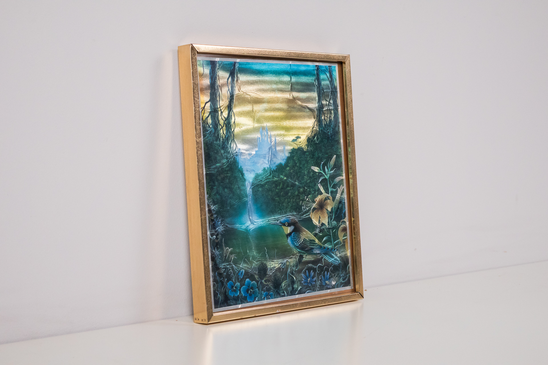 Romantikus stílusú tájképet ábrázol, melyen egy vízesés és zöld növényzet látható, kék madárral a kép előterében. A háttérben hegyek és egy naplemente színei dominálnak, a kompozíció lágy, pasztell árnyalatokkal...