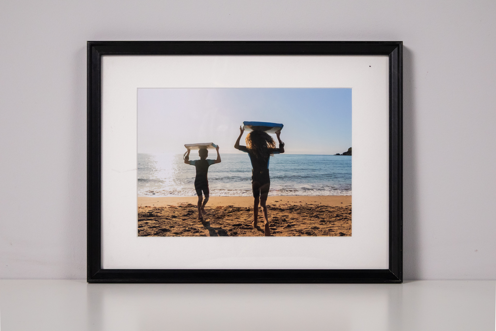 A kép két szörfözőt ábrázol, amint deszkáikat a fejük fölé emelik a tengerparton, a háttérben a naplemente fényei tükröződnek a vízen. A kompozíció dinamikus, a színek élénkek és melegek, a naplemente narancs és kék...