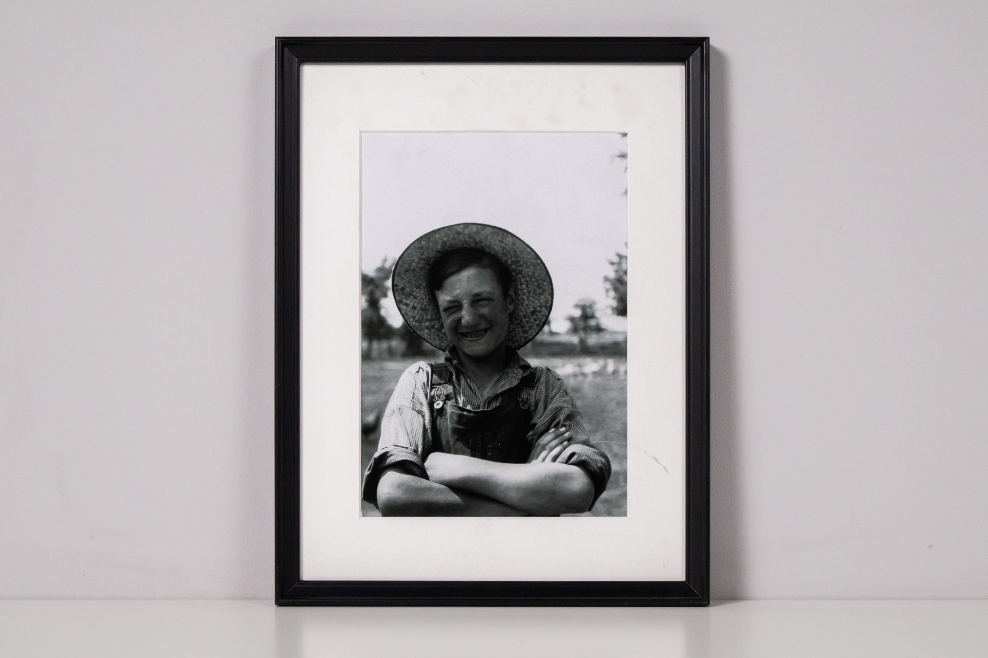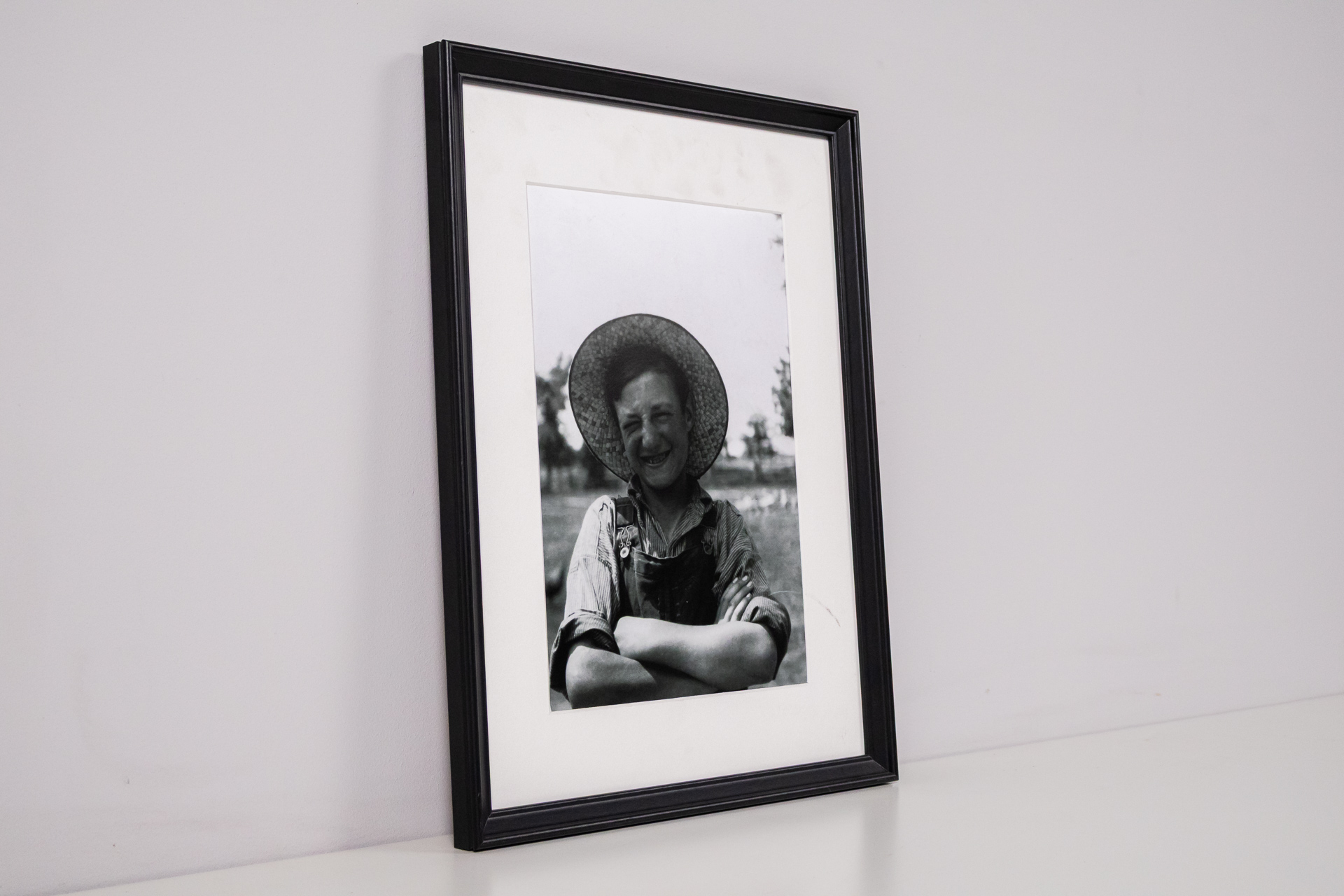 A kép egy boldog gyermeket ábrázol, aki széles kalapot visel, karjait keresztbe tett állapotban. A háttérben fák és egy mező látható, ami vidéki környezetet sugall. A fotó fekete-fehér technikával készült, ami...