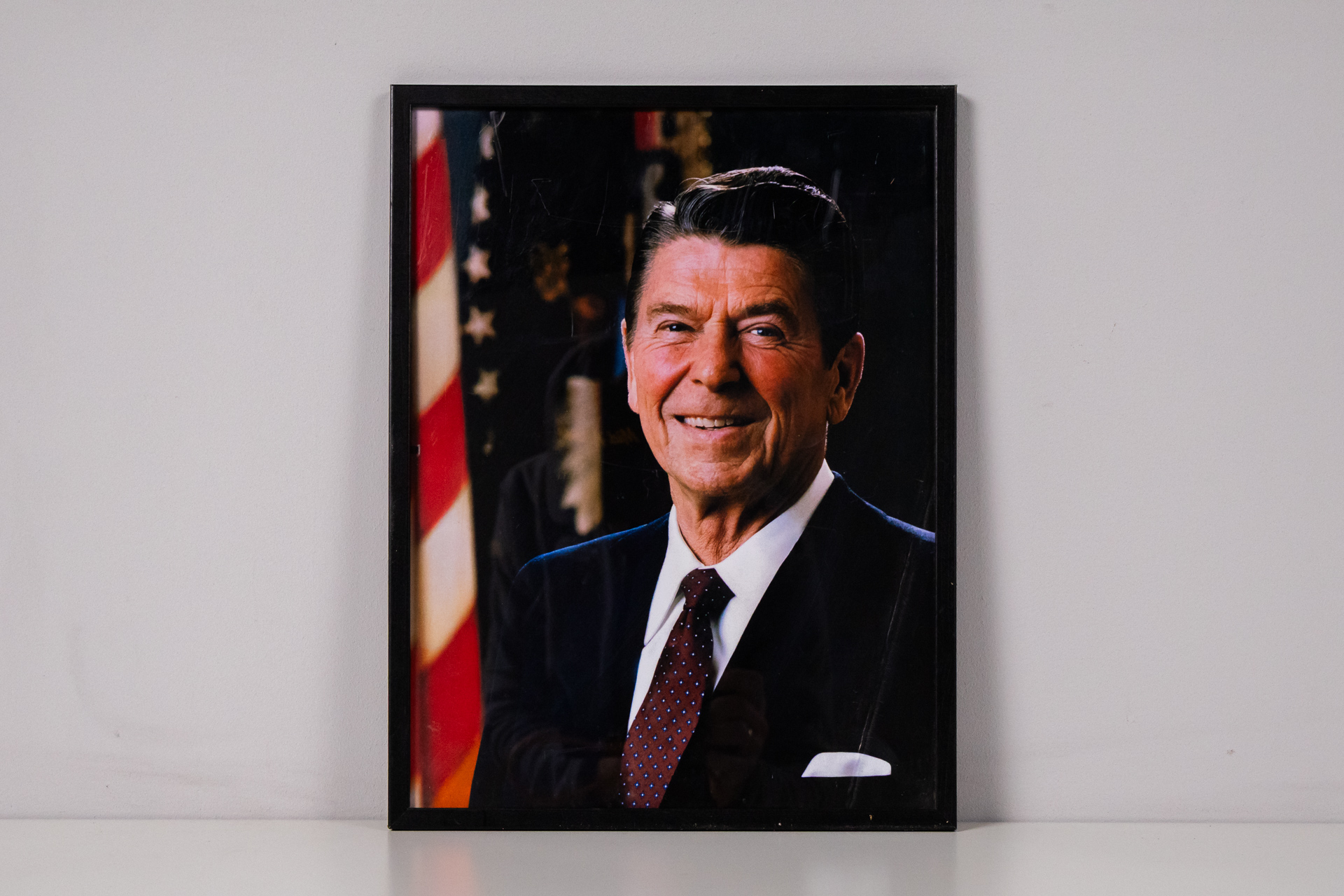 Hivatalos portré, amely egy férfit ábrázol, öltönyben és nyakkendőben, mosolyogva néz a kamerába. A háttérben az Egyesült Államok zászlaja látható. A kép színes fényképészeti technikával készült, éles részletekkel és...