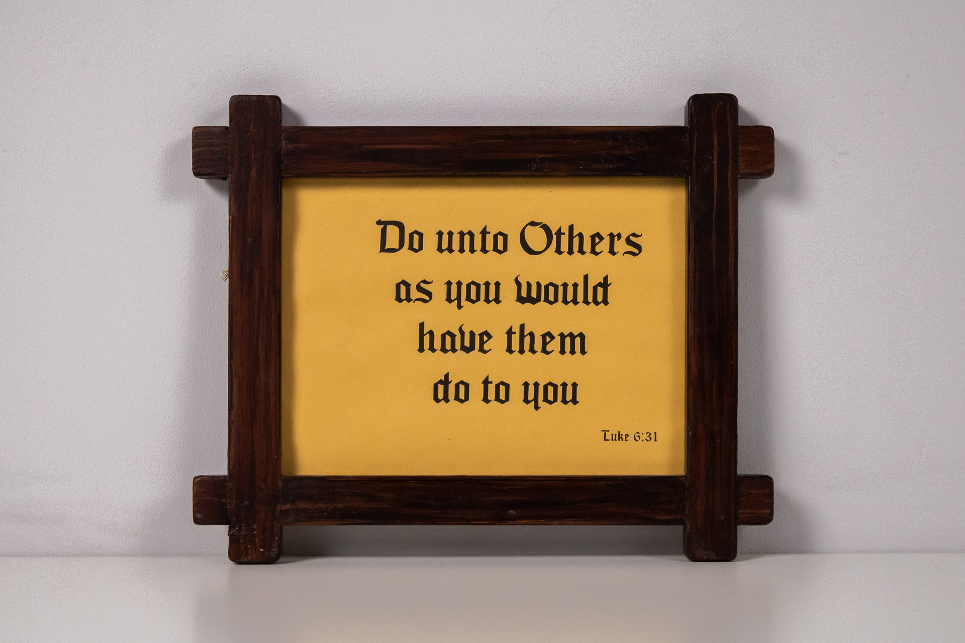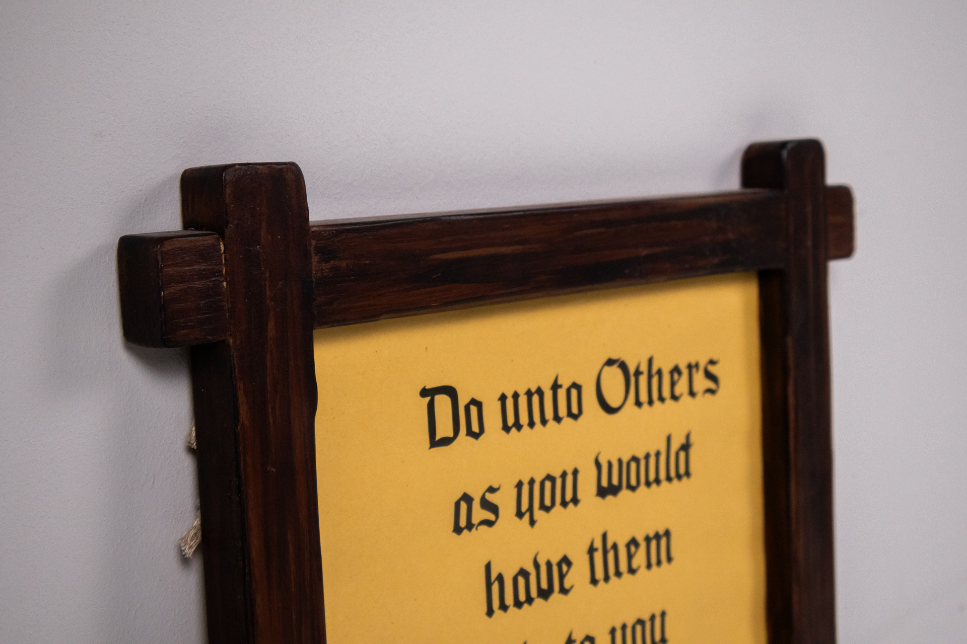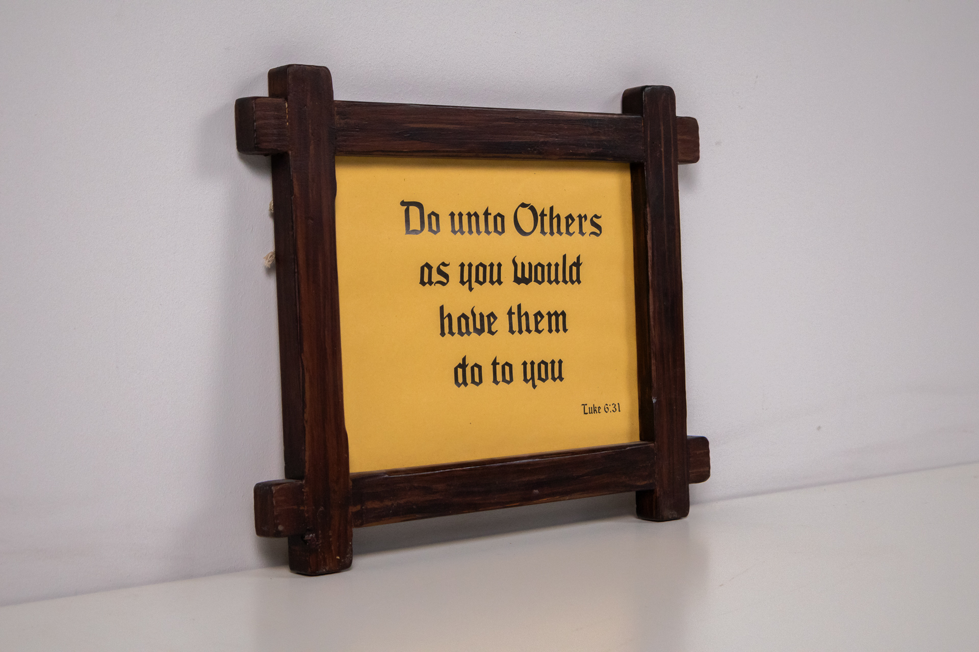 A kép egy sárga háttérrel rendelkező, fekete betűkkel írt inspiráló idézetet ábrázol, amely a másokkal való bánásmódról szól. A keret sötétbarna fából készült, rusztikus stílusú, vastag és masszív, egyszerű formavilággal
