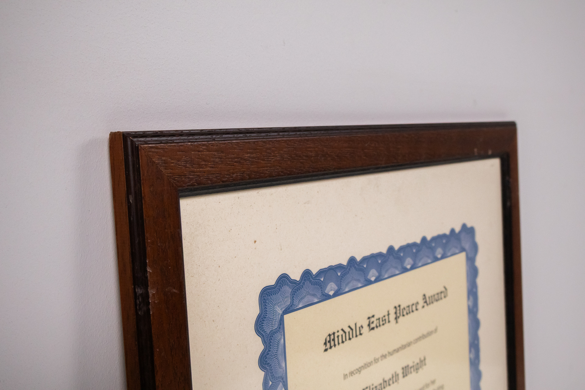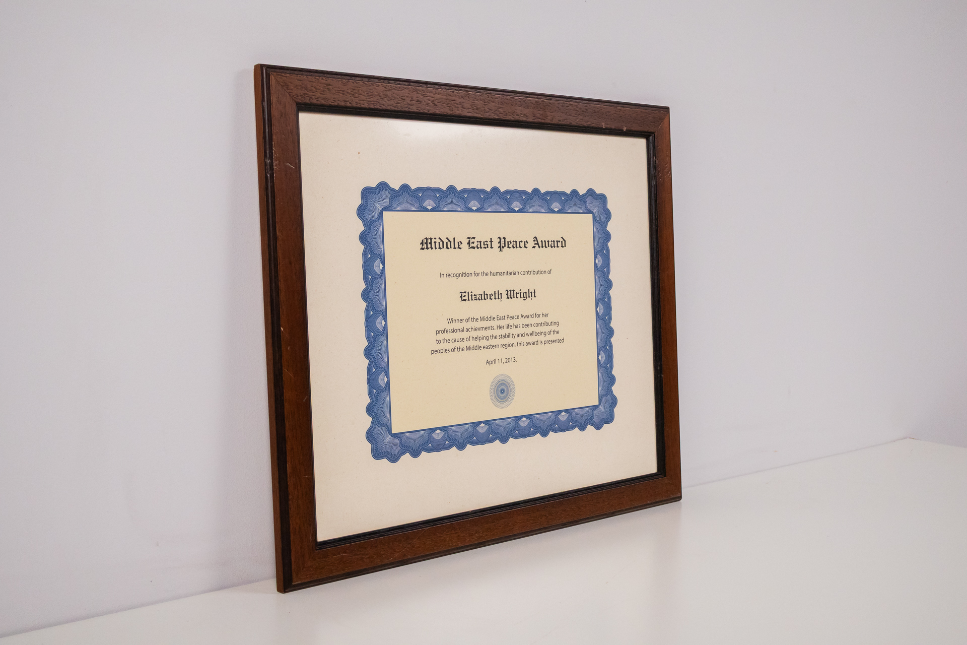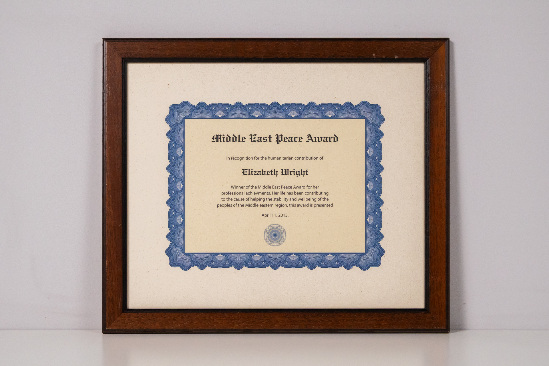 Hivatalos oklevél, amely elismeri Elizabeth Wright humanitárius hozzájárulását. Az oklevél kék szegéllyel rendelkezik, és elegáns, klasszikus betűtípussal van nyomtatva. A keret sötétbarna fából készült, sima...