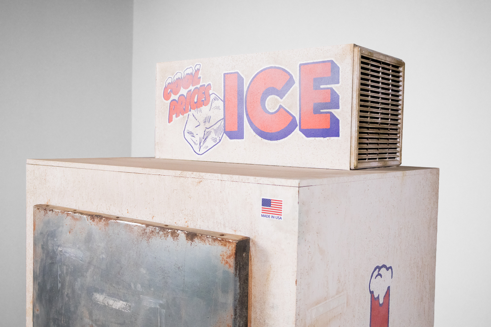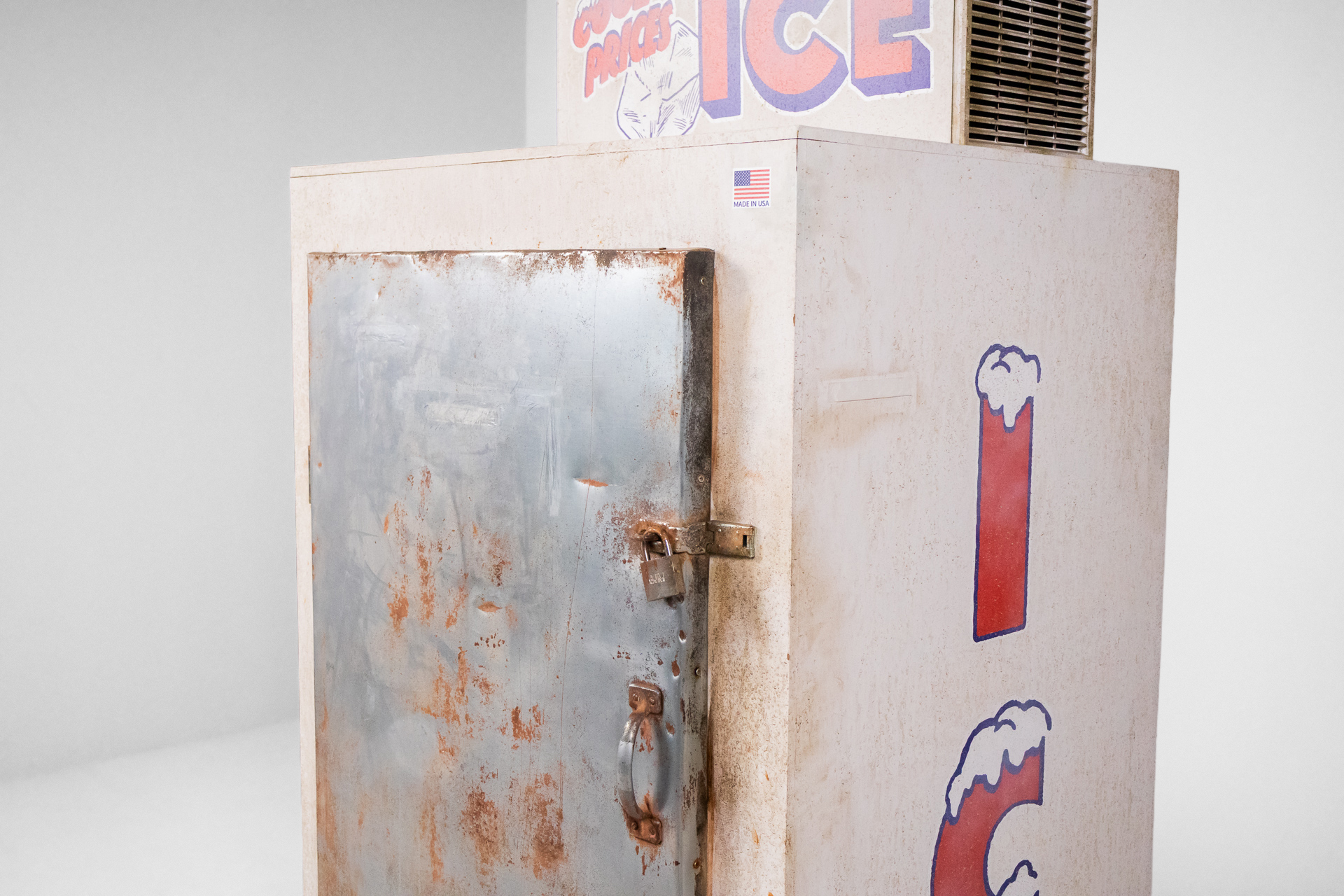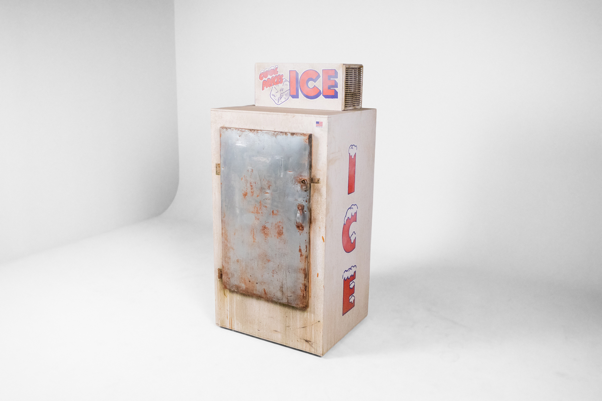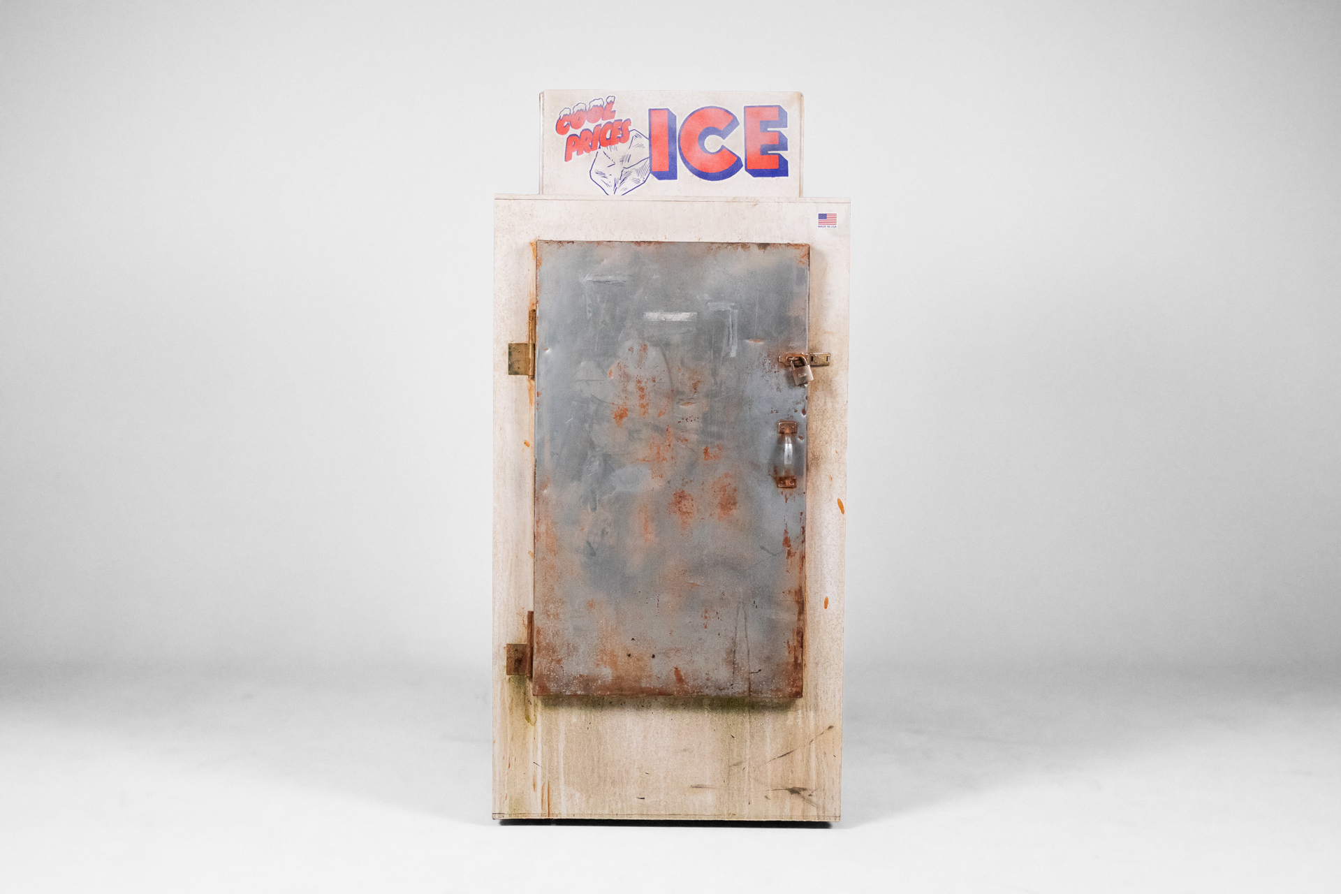 Retro jégszekrény 007 — 0003 Rozsdás fém vintage jégszekrény élénk színű 'ICE' felirattal Méret: 90.0×82.0×194.0 Mennyiség: Összesen 2 db • Elérhető 2 db ♡ 🛒 Kosárba 📄 Adatlap