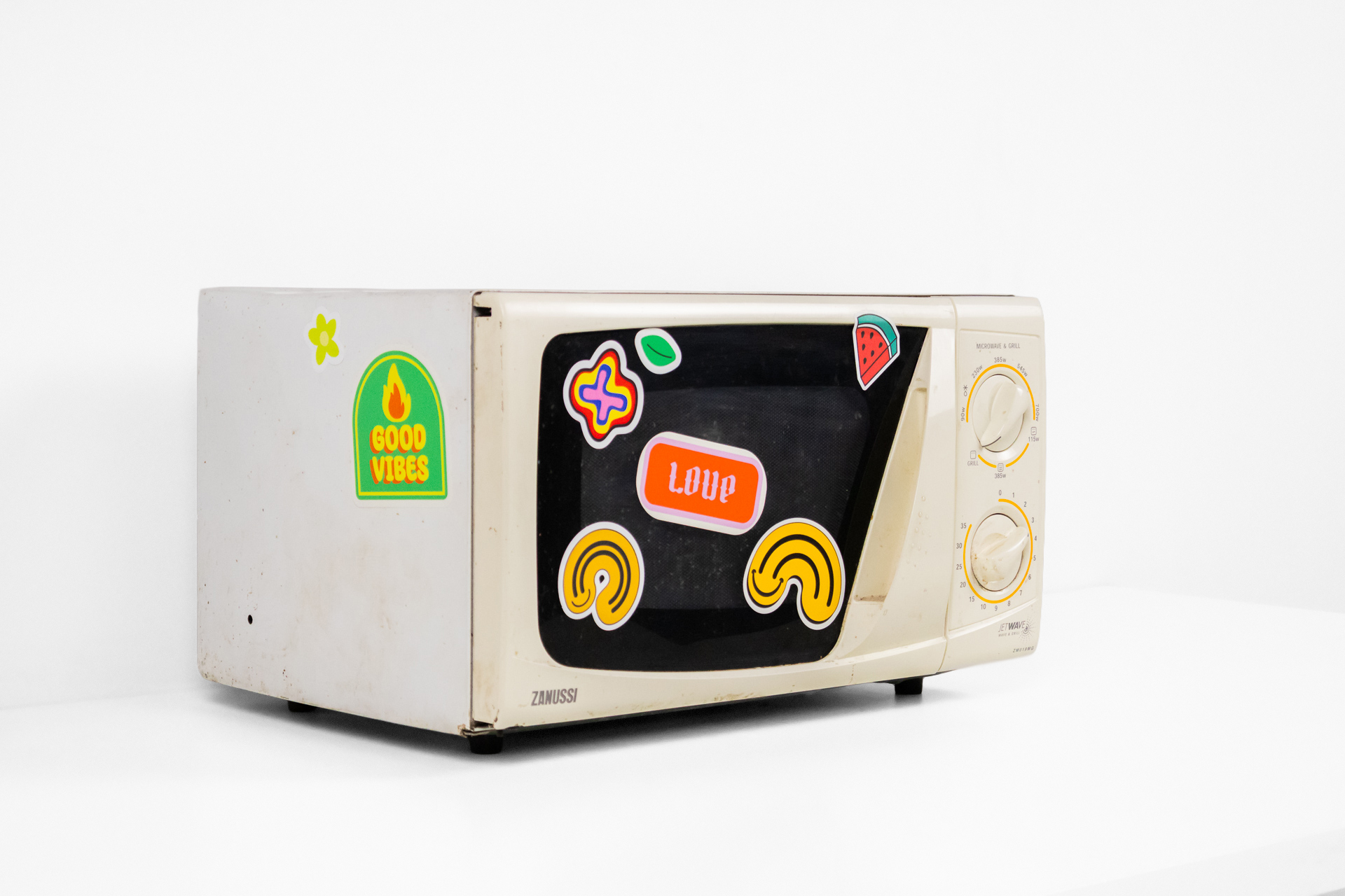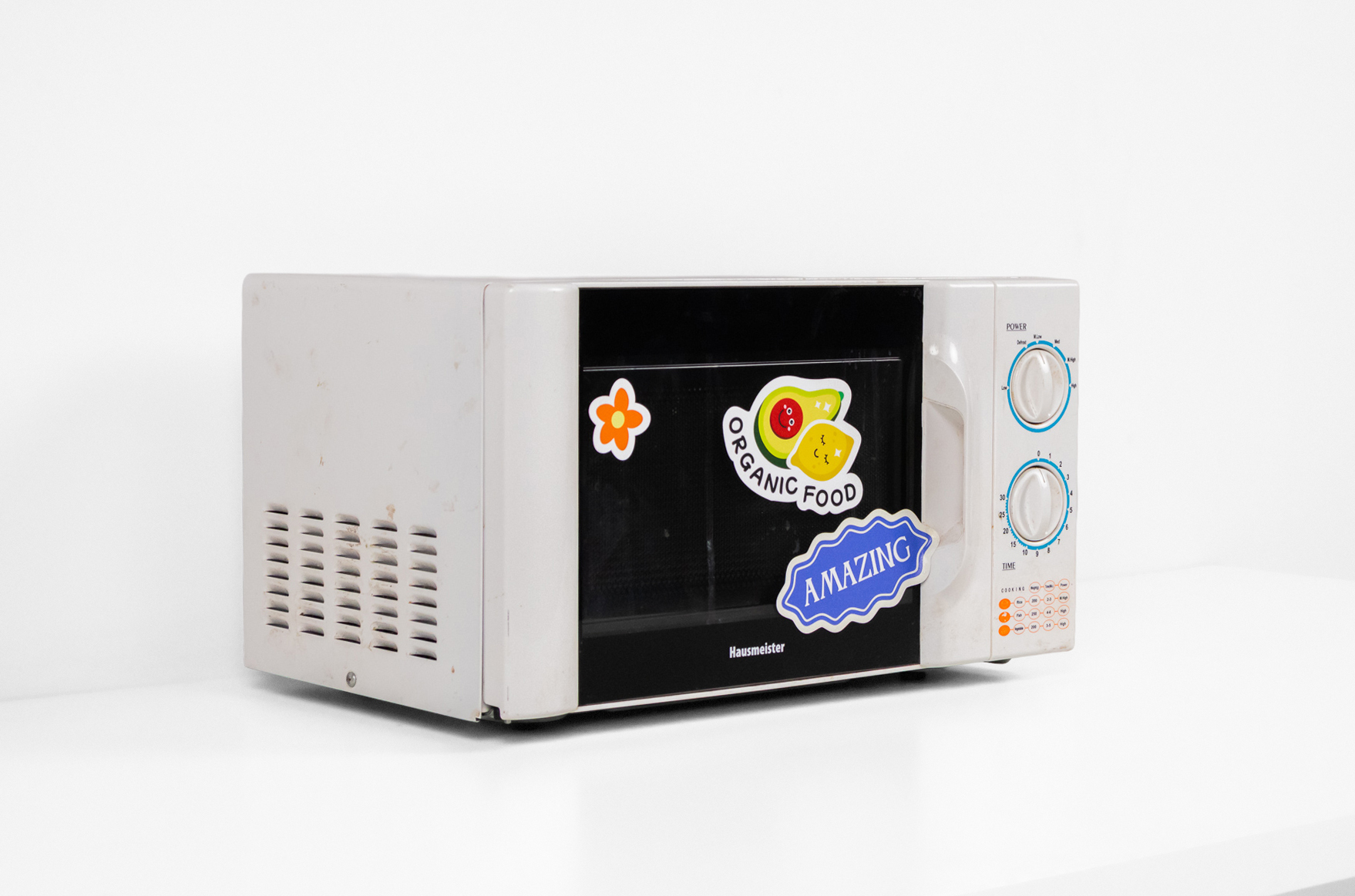 Régi mikrohullámú sütő 007 — 0032 Régi stílusú fehér mikró fekete üvegajtóval és színes vidám matricákkal Méret: 45.0×32.0×26.0 Mennyiség: Összesen 1 db • Elérhető 1 db ♡ 🛒 Kosárba 📄 Adatlap