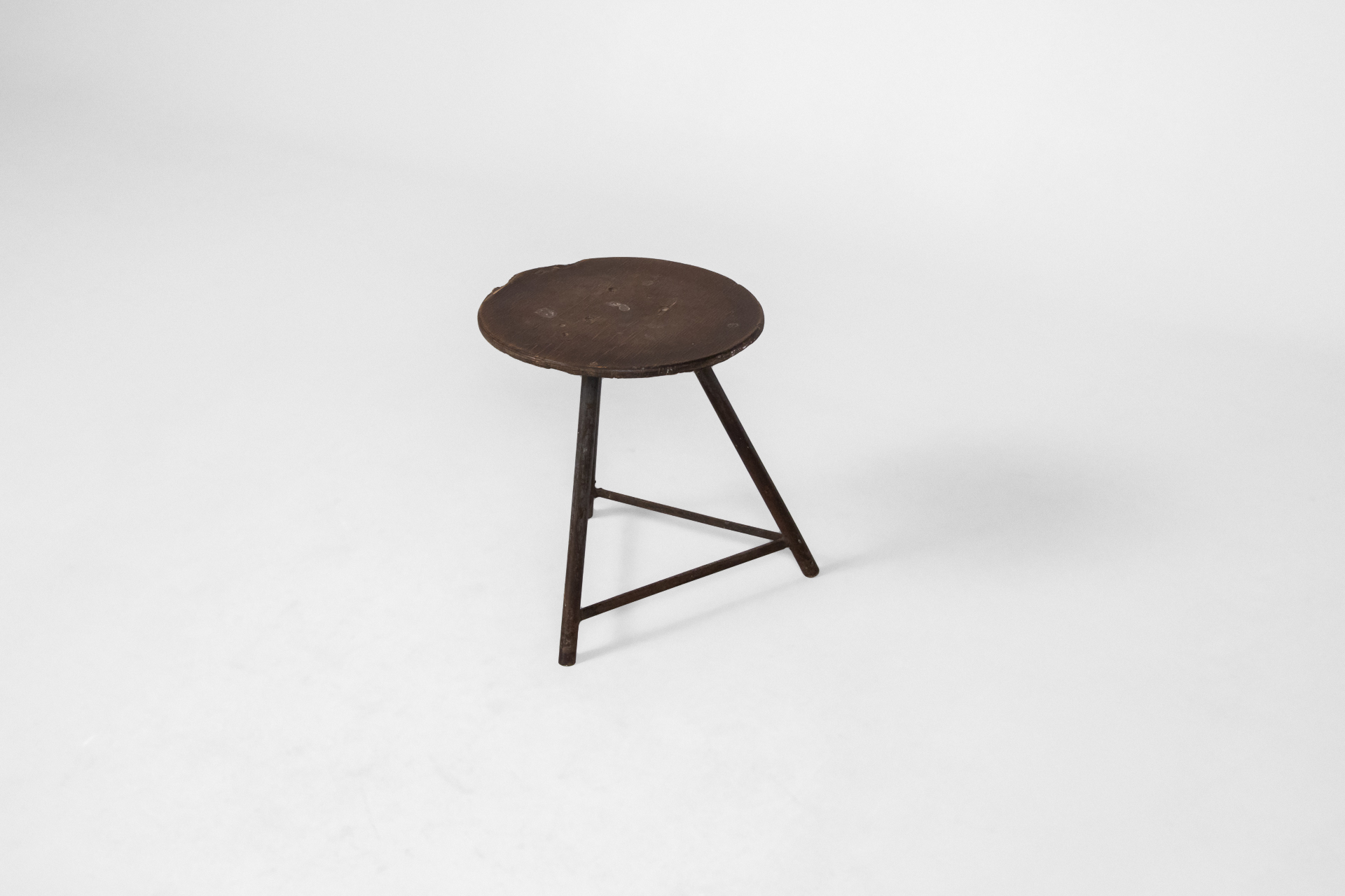 Kerek sötétbarna fa hokedli háromszög alakú lábakkal