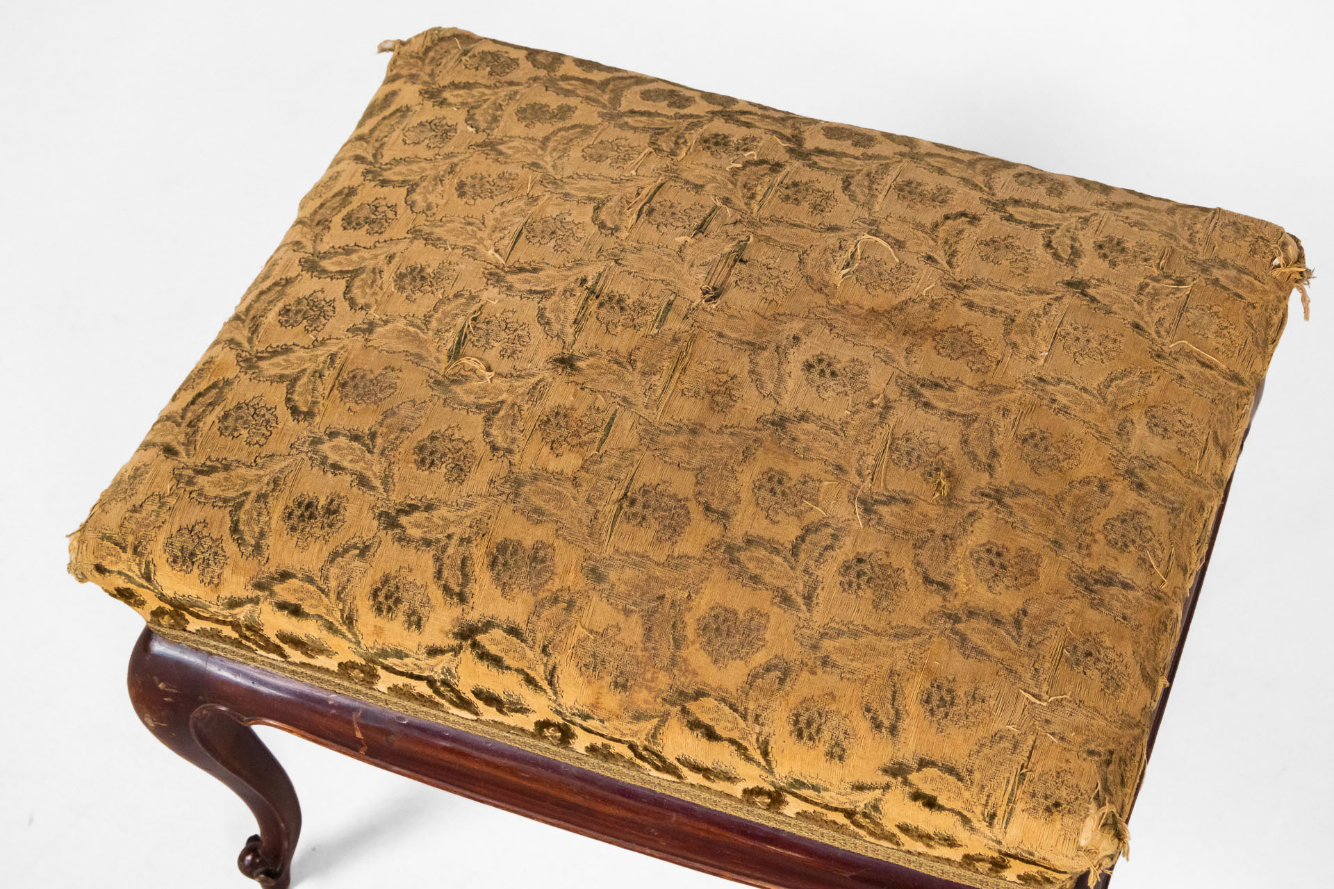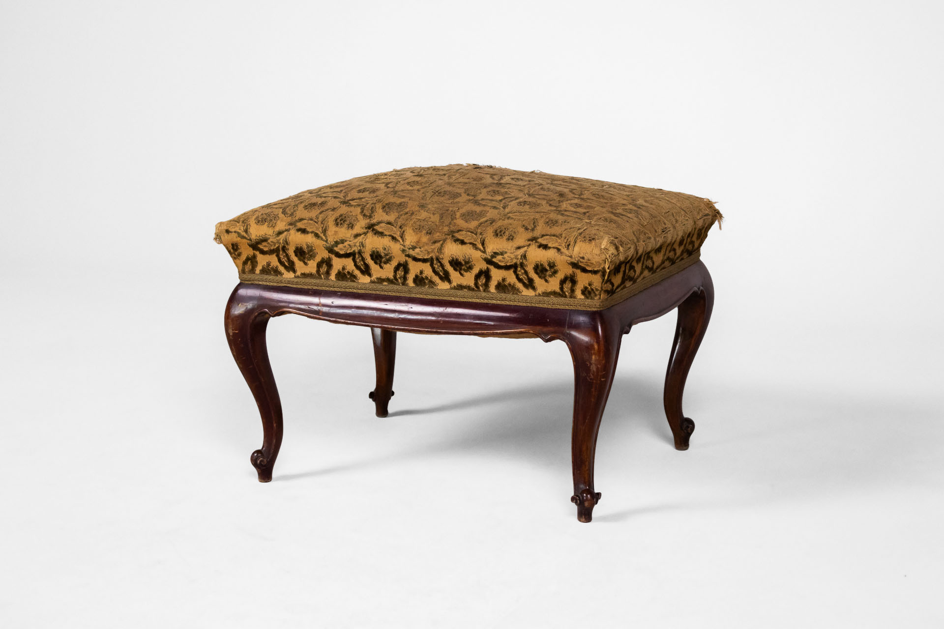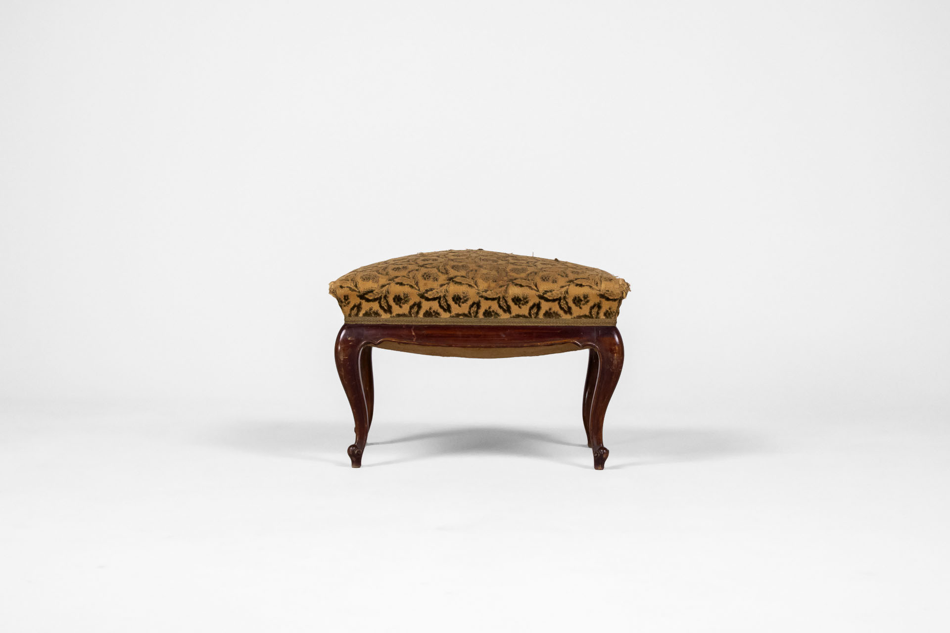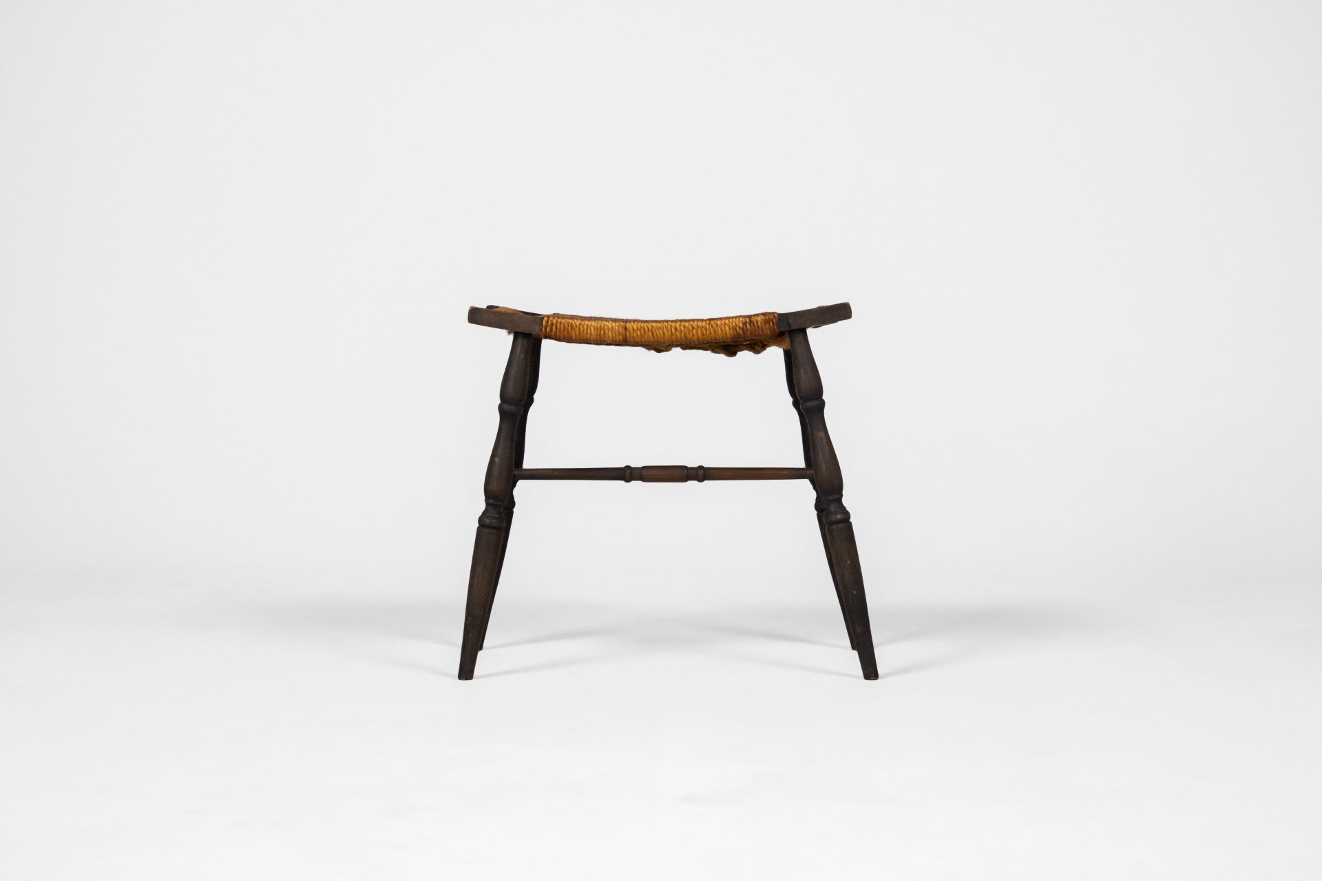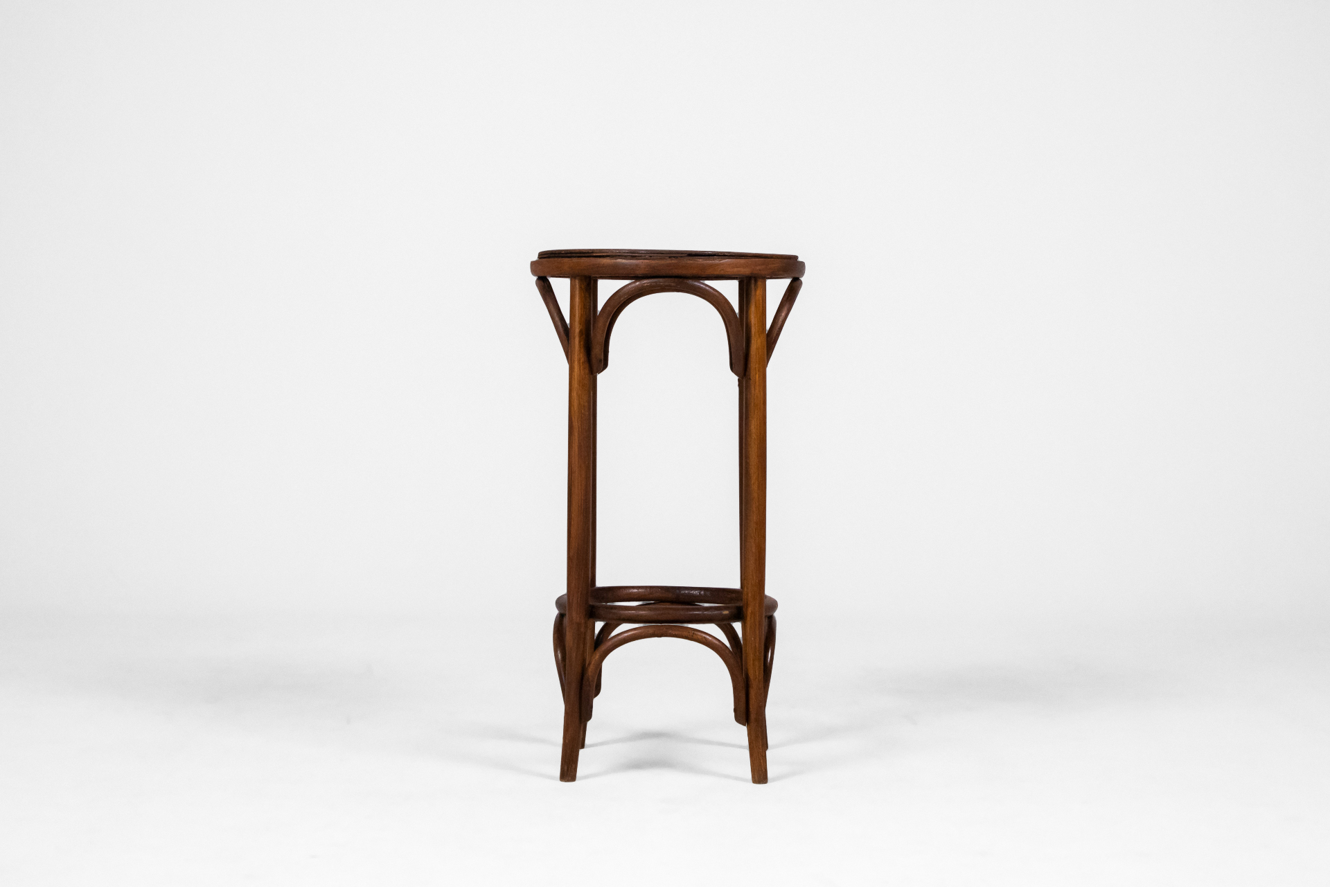 Kerek, sötétbarna fa ülőfelület, vékony lábakkal és ívelt díszítéssel