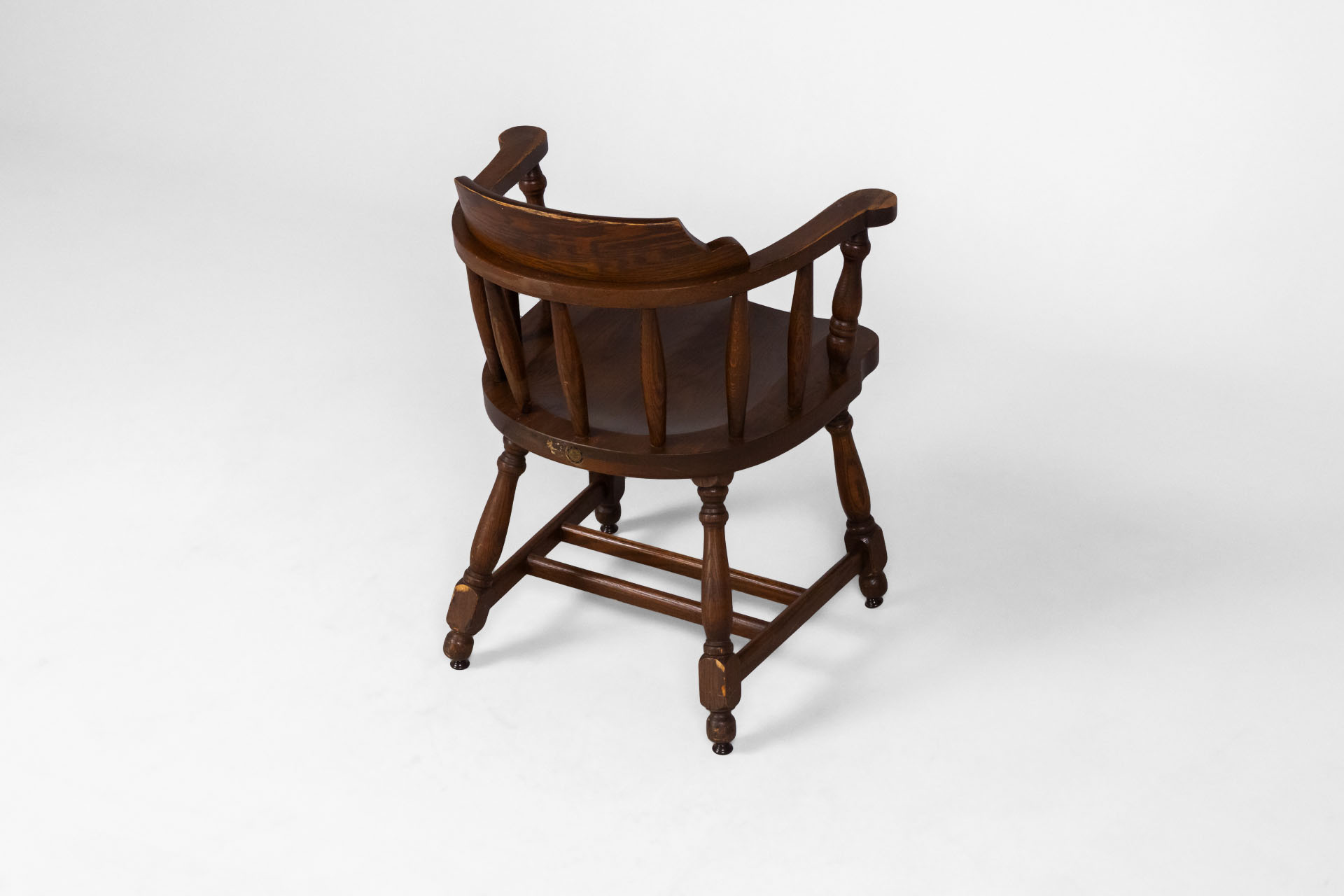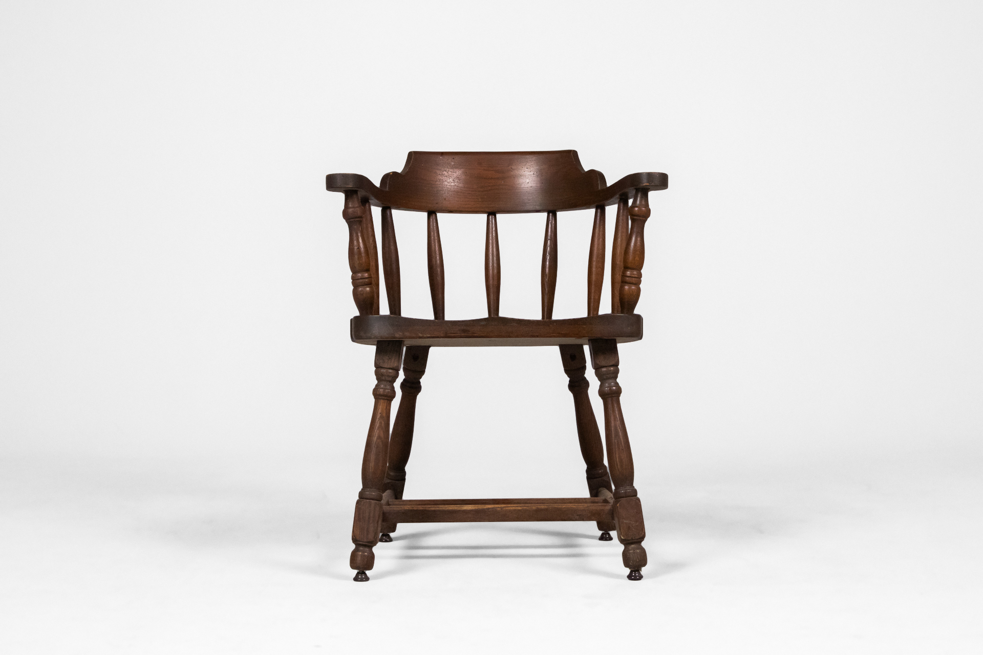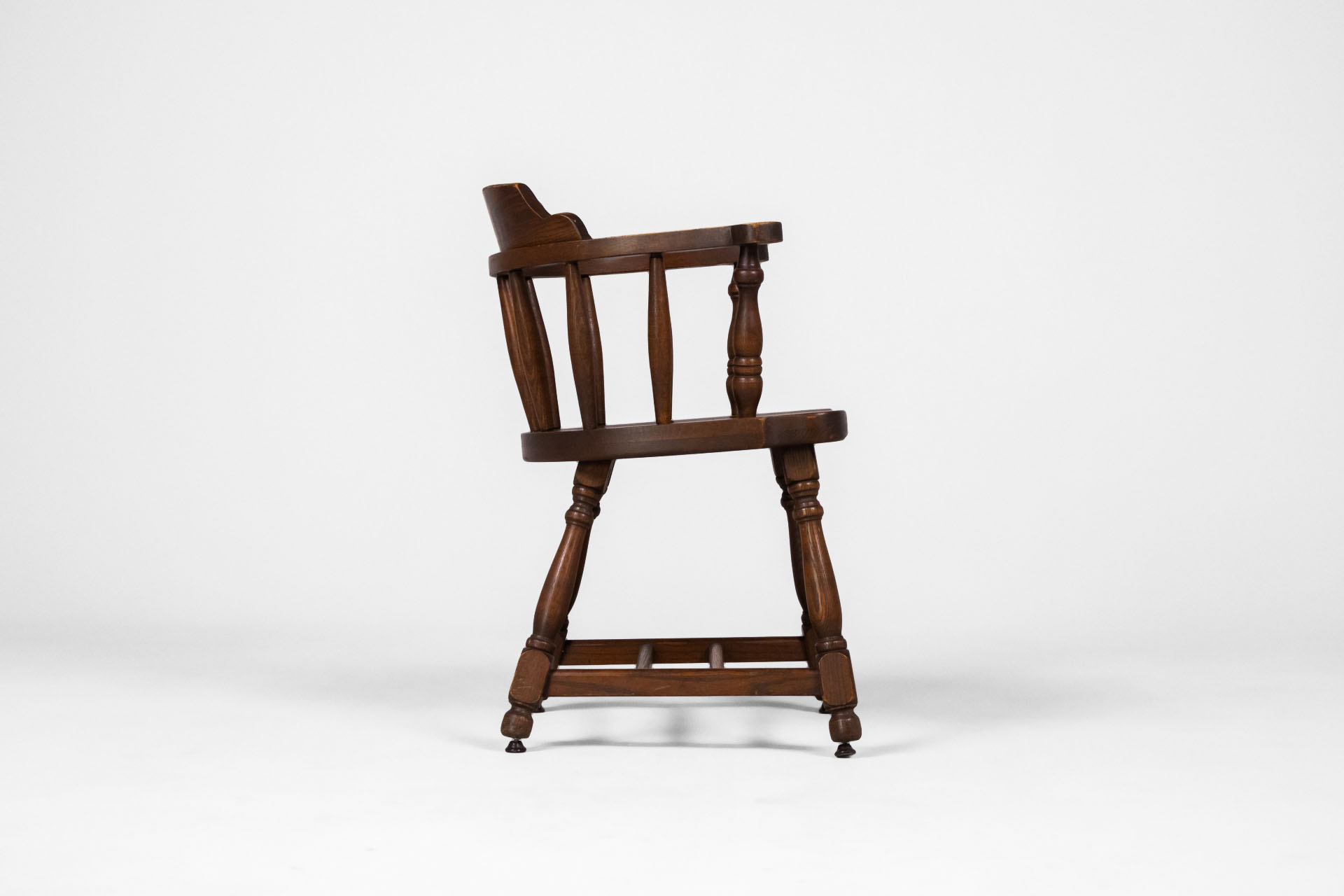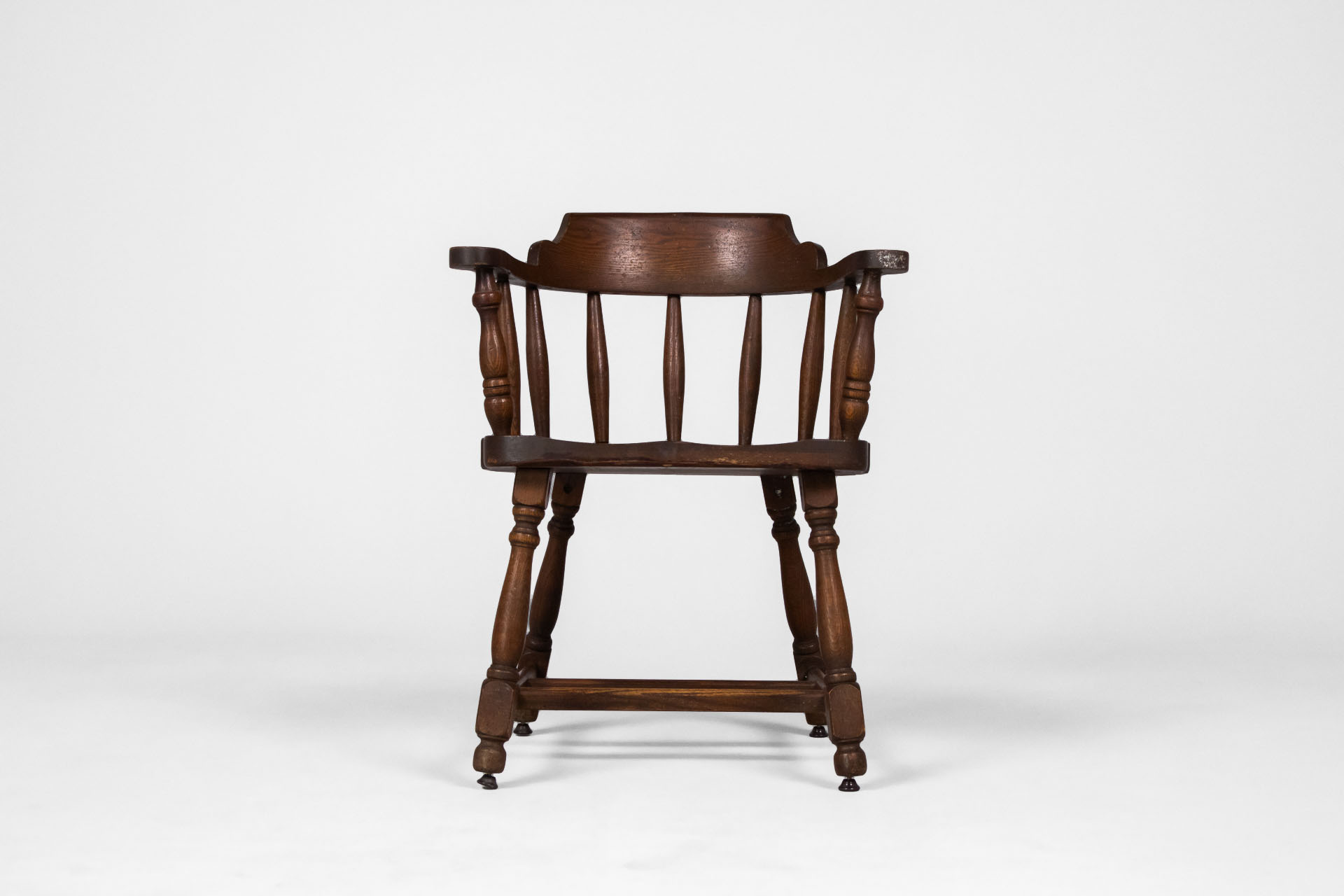 Kerek, sötétbarna fa szék, karfákkal és négy lábbal, ívelt háttámlával