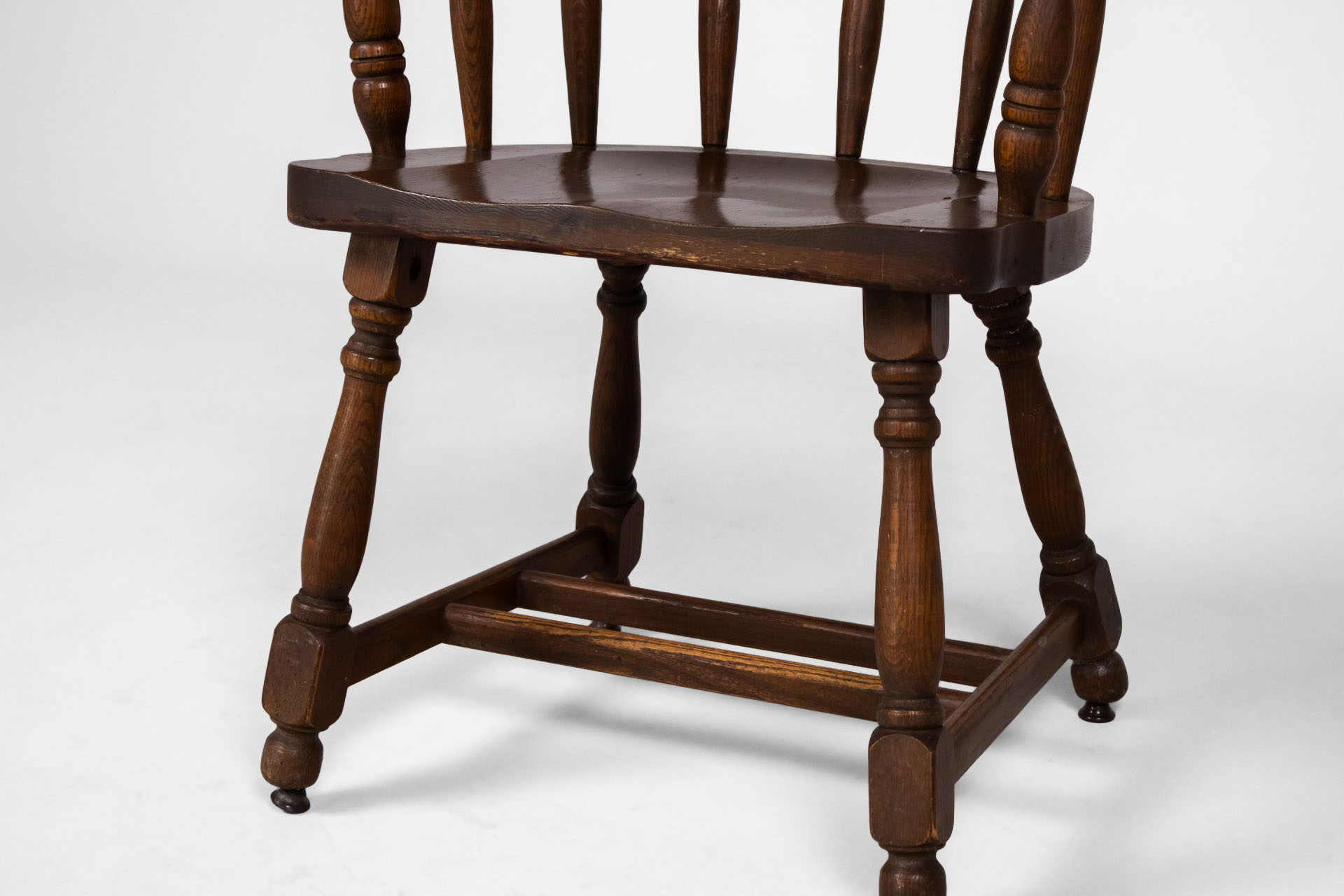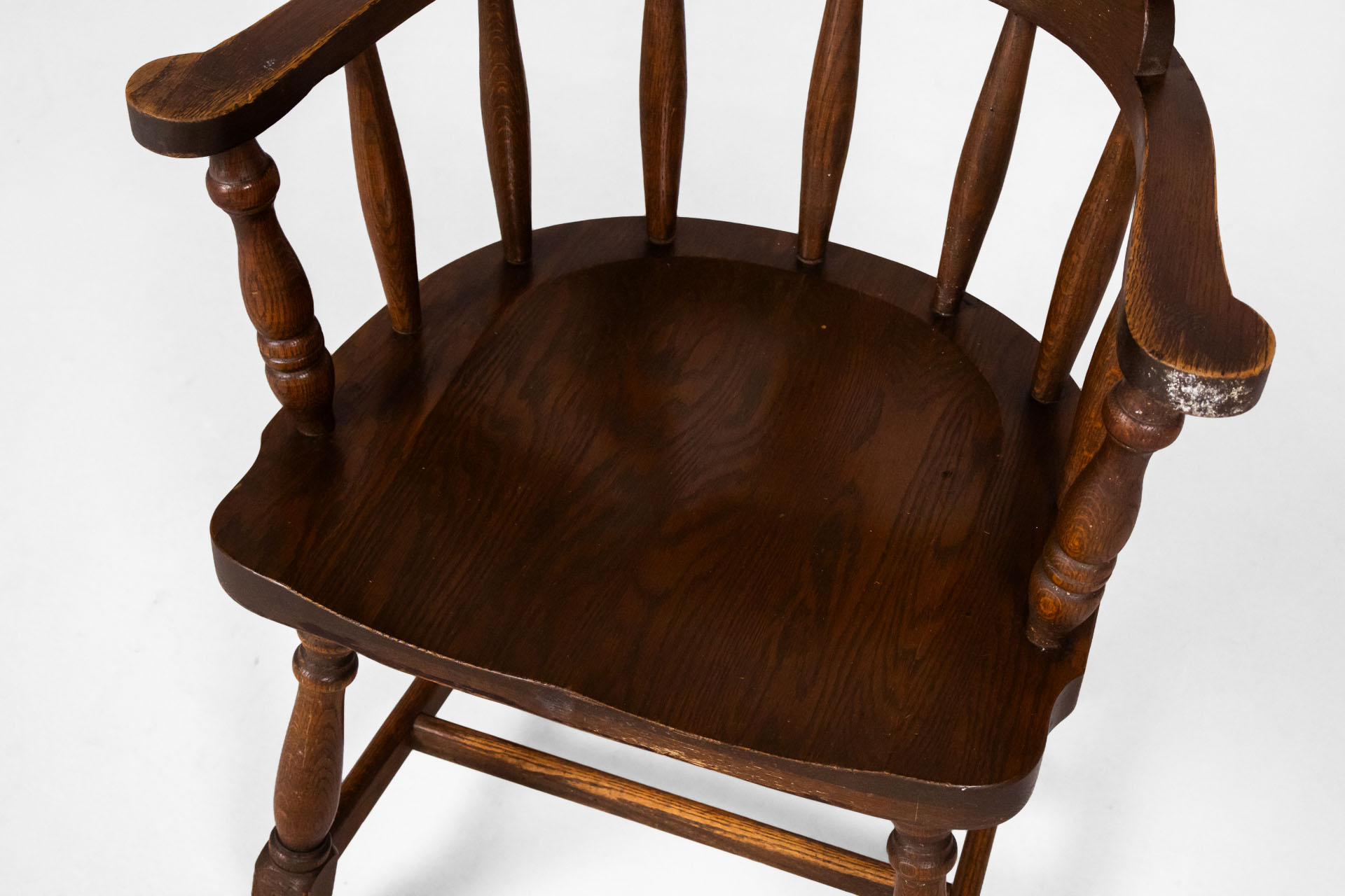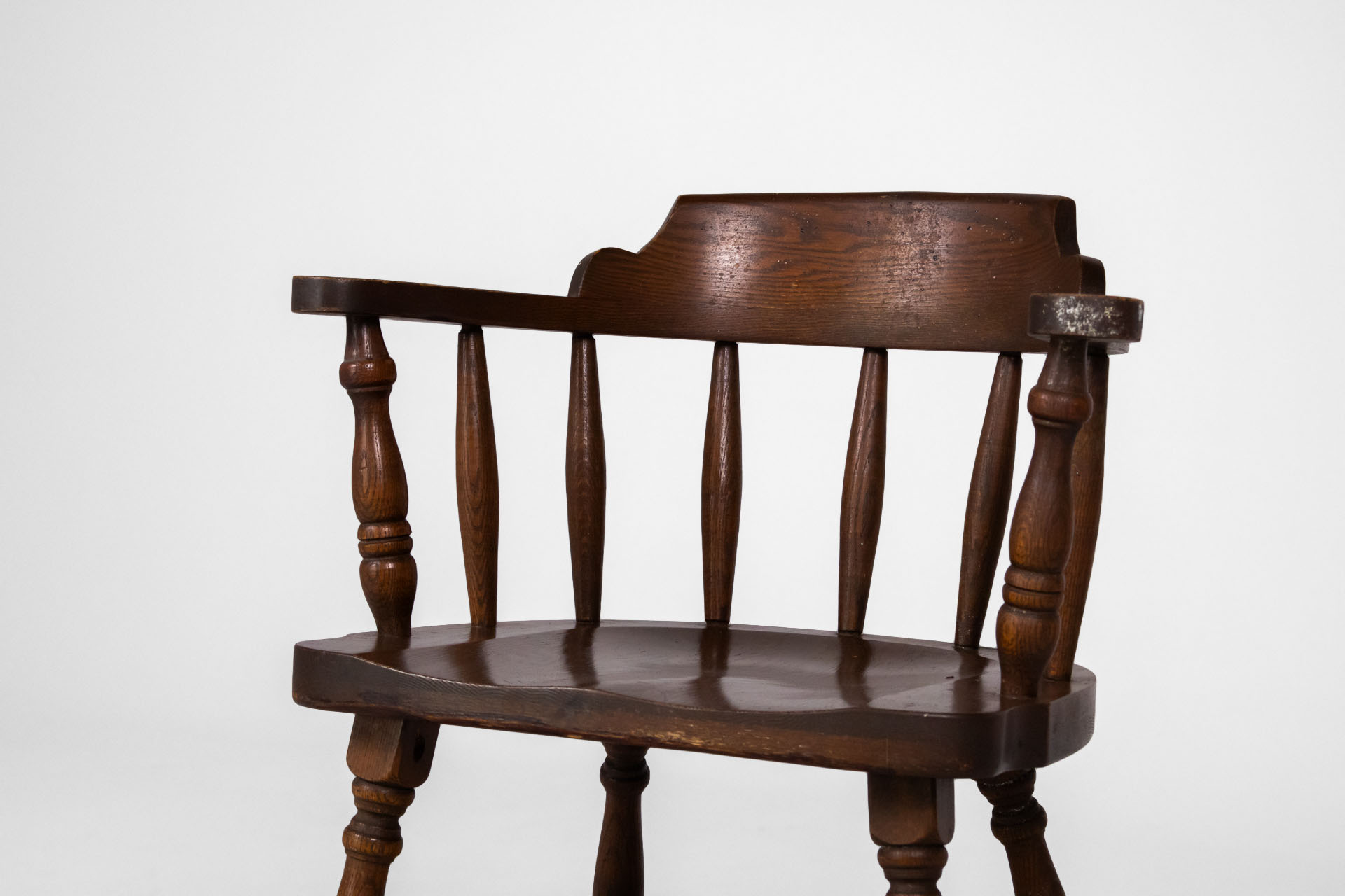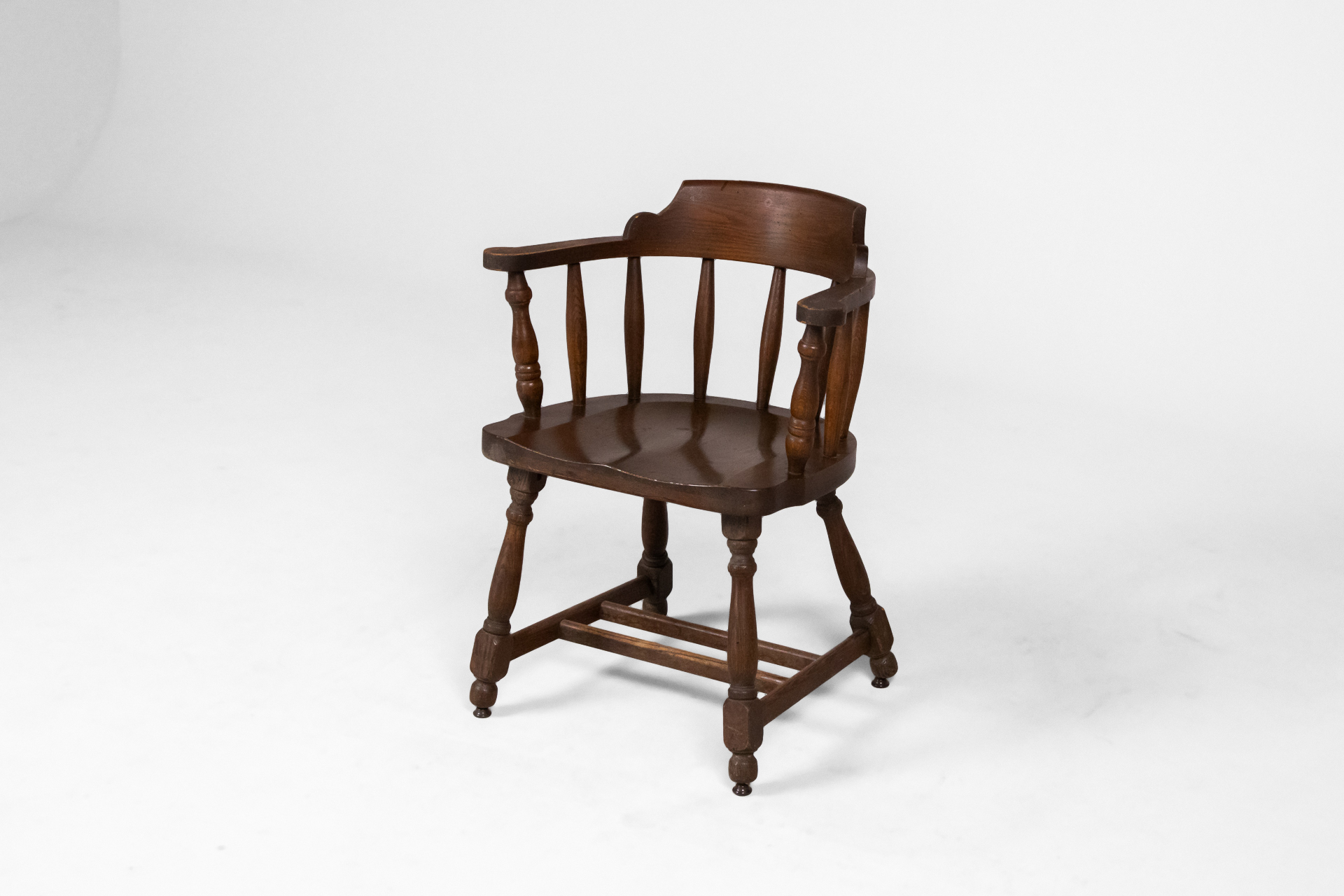 Kerek, sötétbarna fa szék, karfákkal és négy lábbal, ívelt háttámlával
