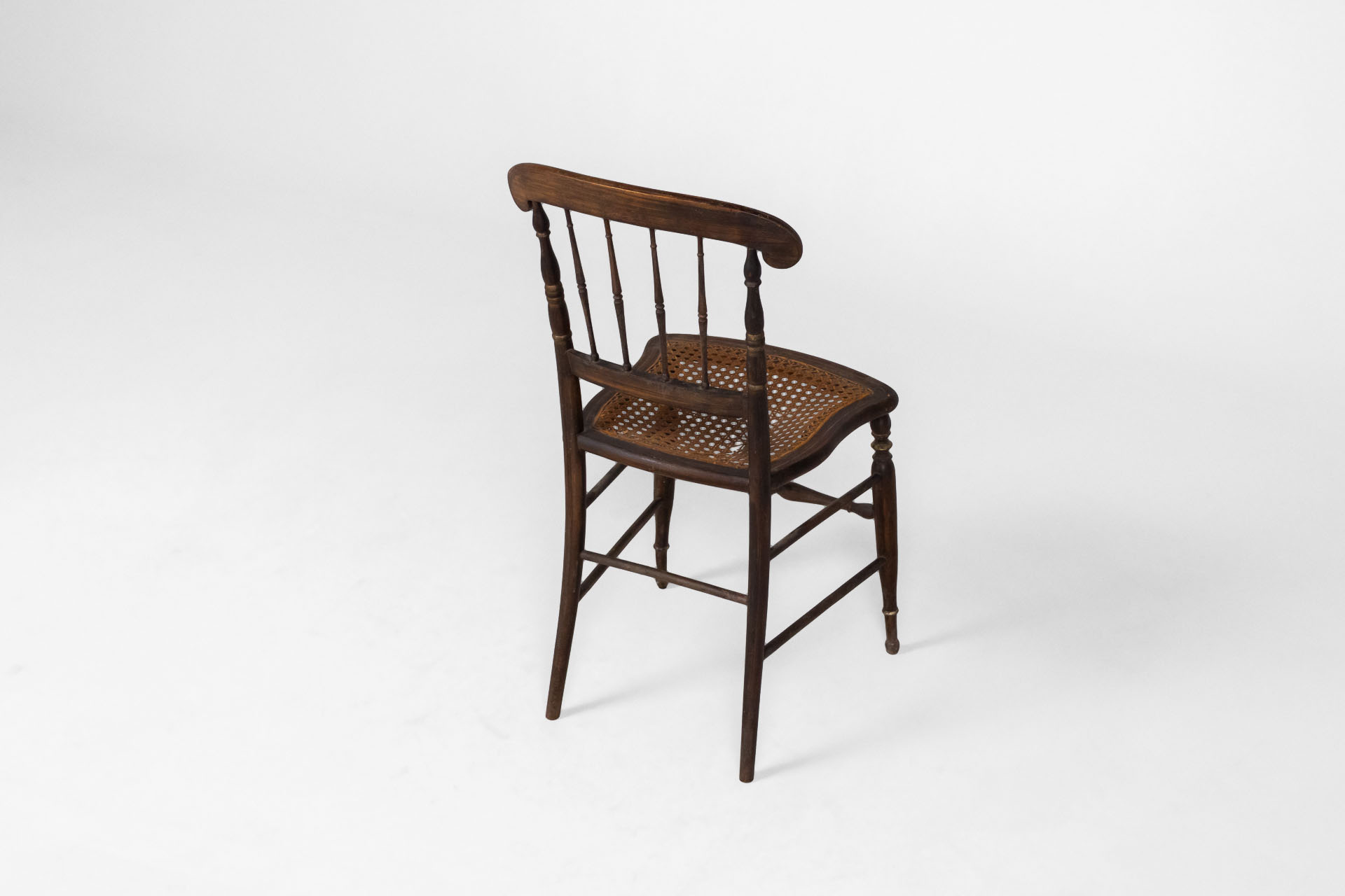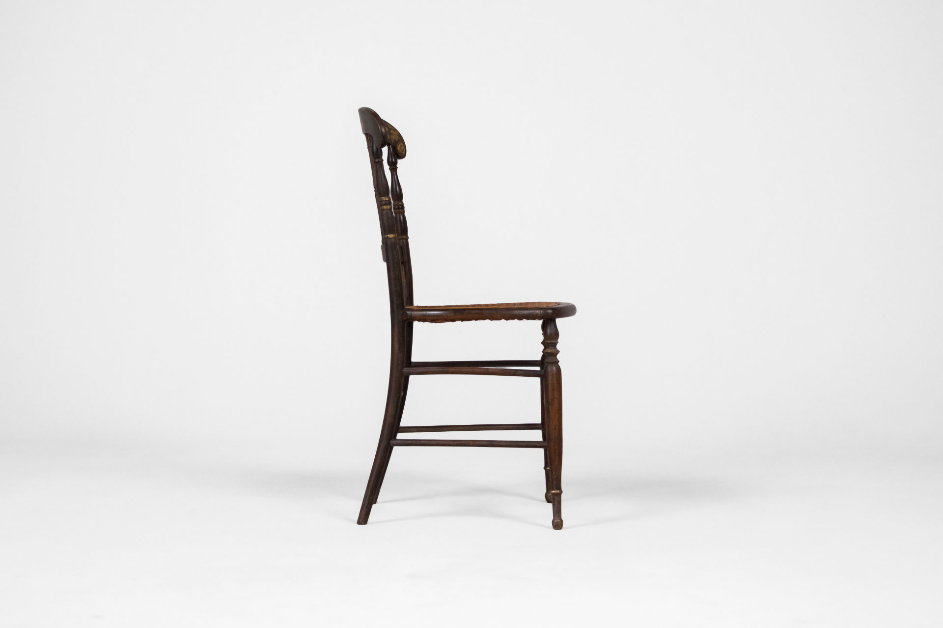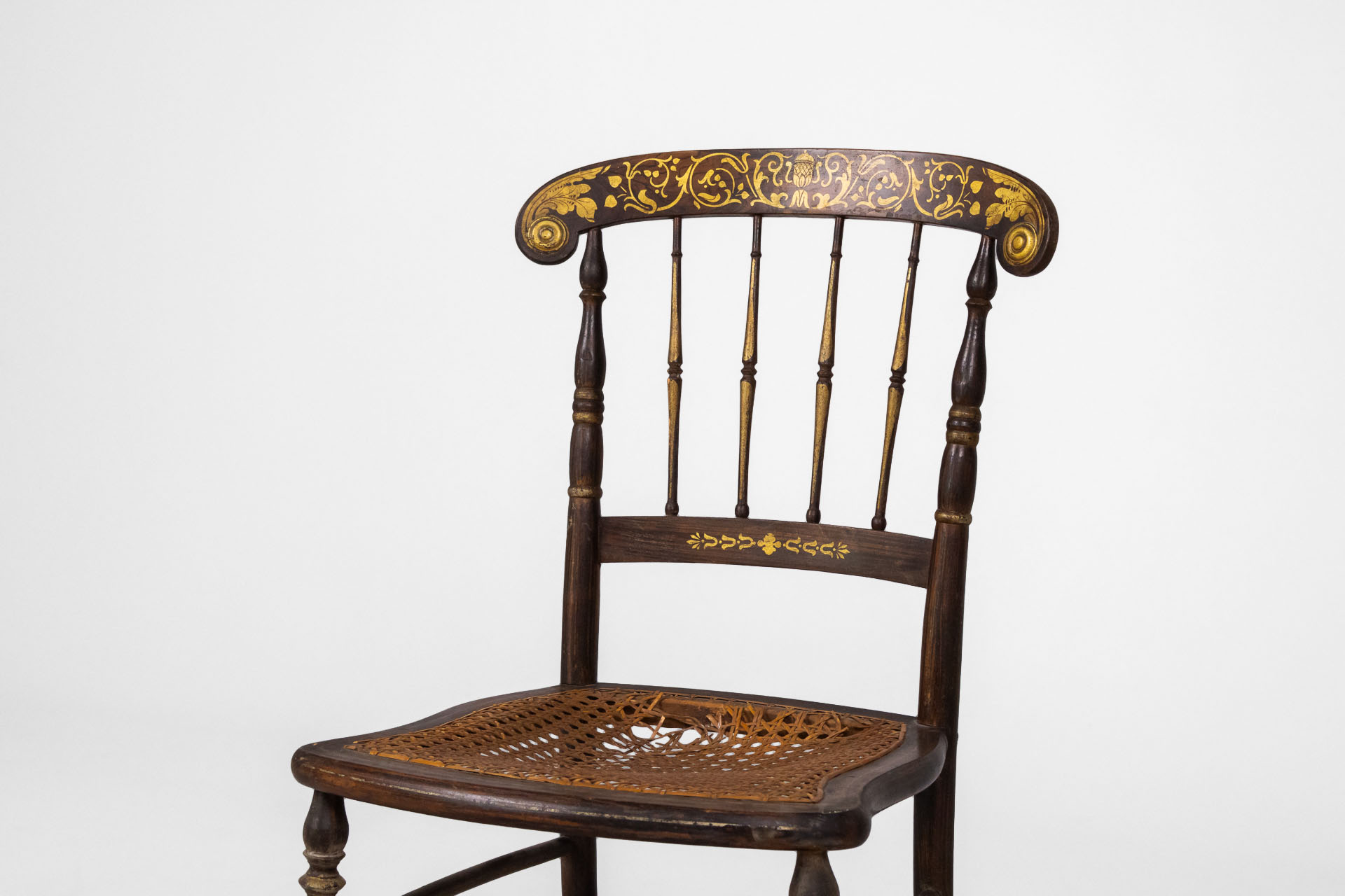 Elegáns, antik stílusú szék, amely fonott ülőrésszel és díszes háttámlával rendelkezik. A sötétbarna faanyag és a finom aranyozott díszítések időtlen megjelenést kölcsönöznek, ideális választás vintage enteriőrökbe