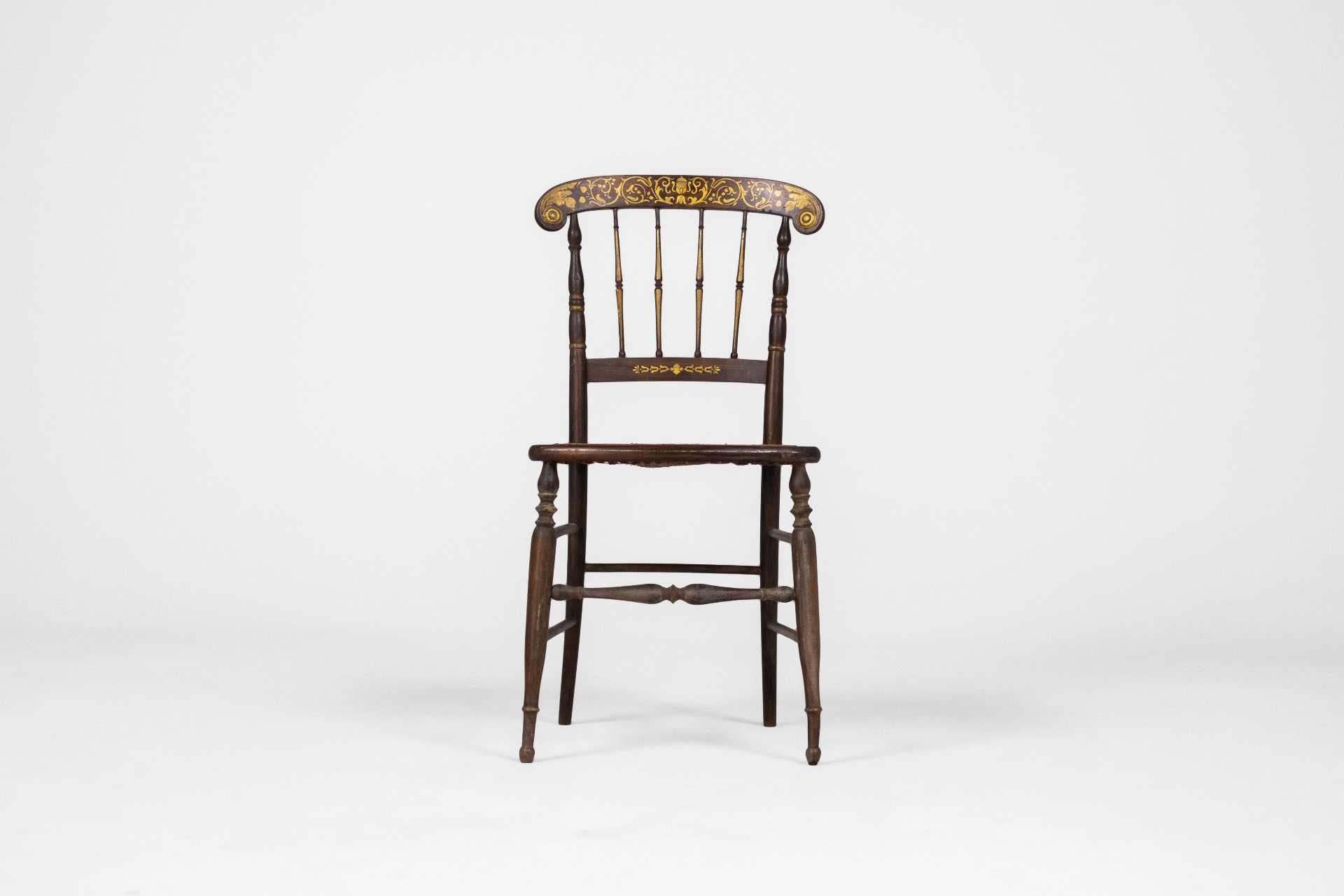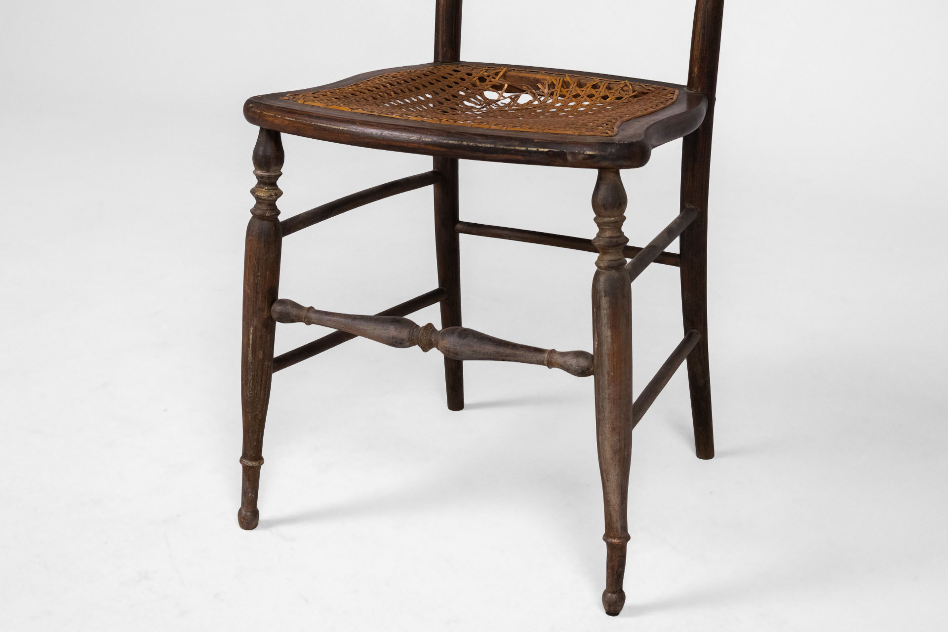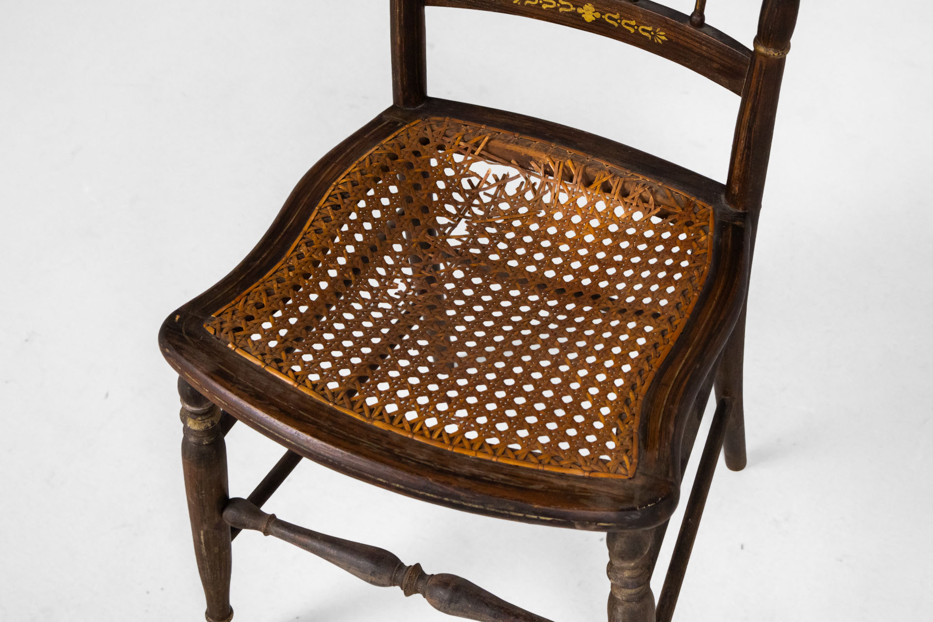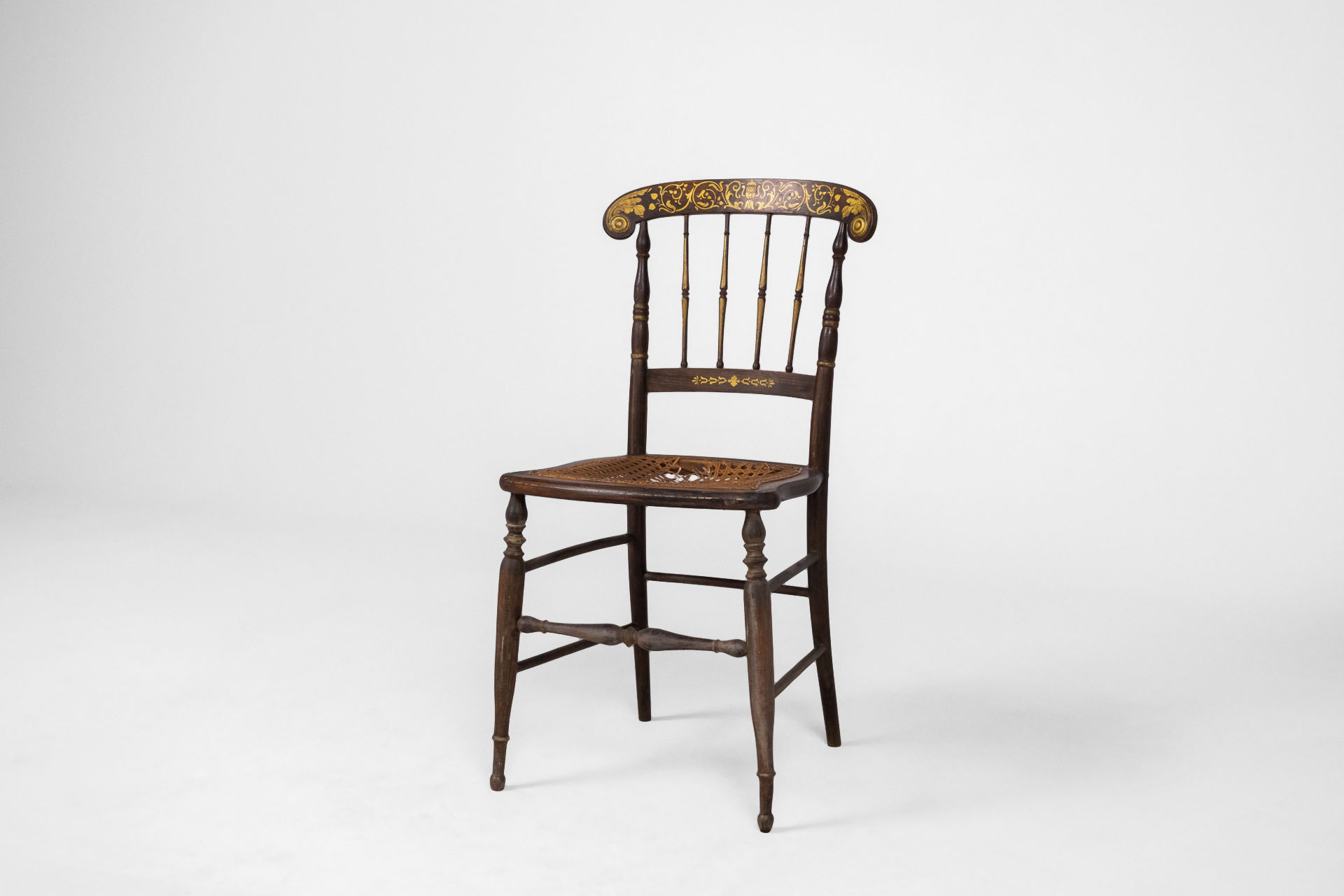 Elegáns, antik stílusú szék, amely fonott ülőrésszel és díszes háttámlával rendelkezik. A sötétbarna faanyag és a finom aranyozott díszítések időtlen megjelenést kölcsönöznek, ideális választás vintage enteriőrökbe