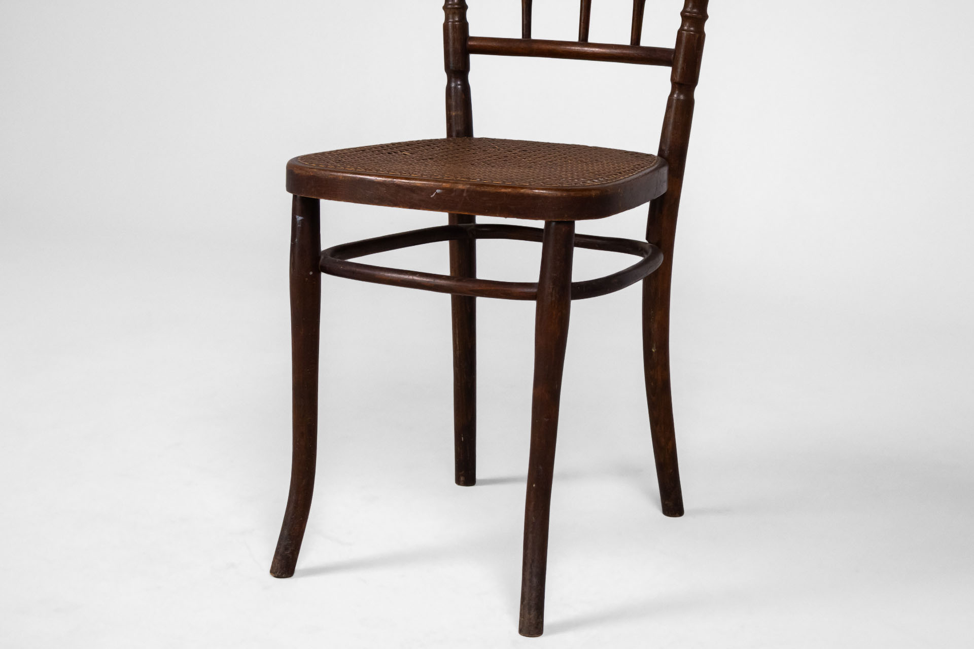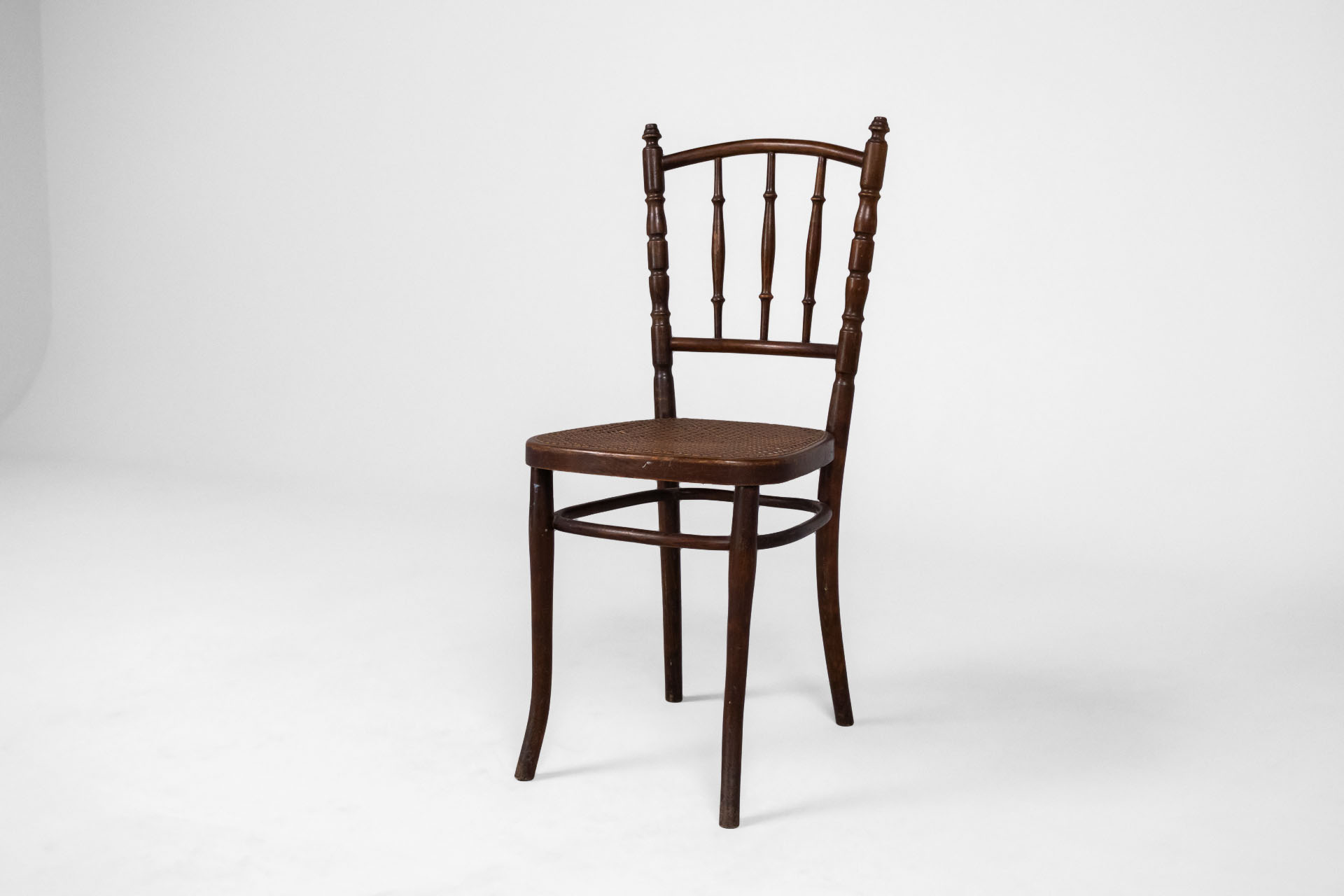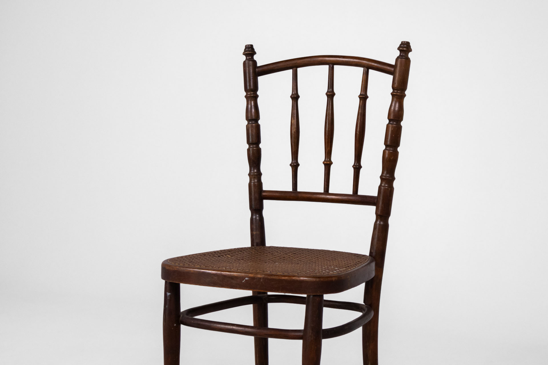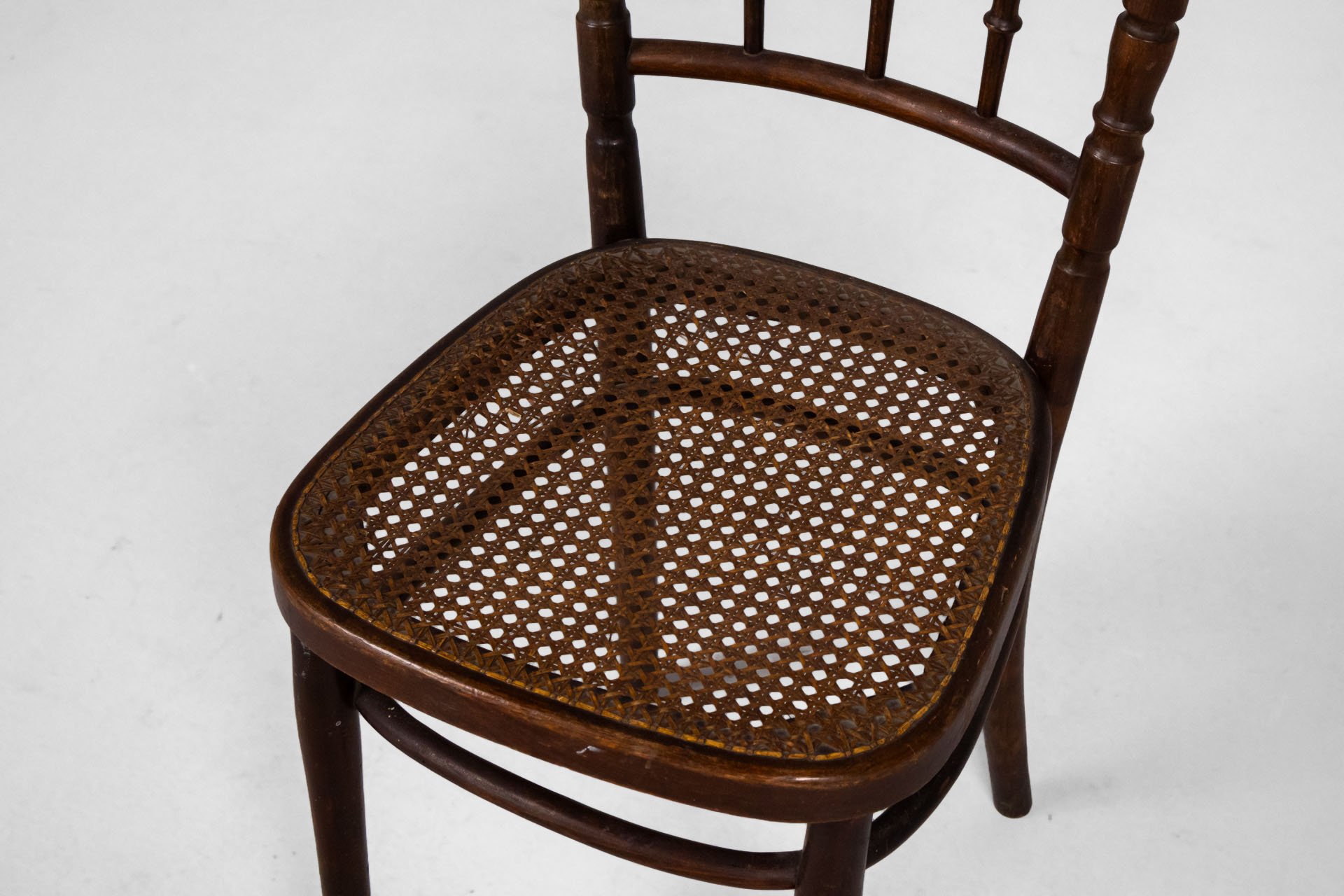 Elegáns, klasszikus stílusú szék, fonott ülőrésszel és ívelt háttámlával, amely kényelmes ülést biztosít. A sötétbarna fa szerkezet időtlen megjelenést kölcsönöz, ideális választás vintage vagy polgári enteriőrökbe