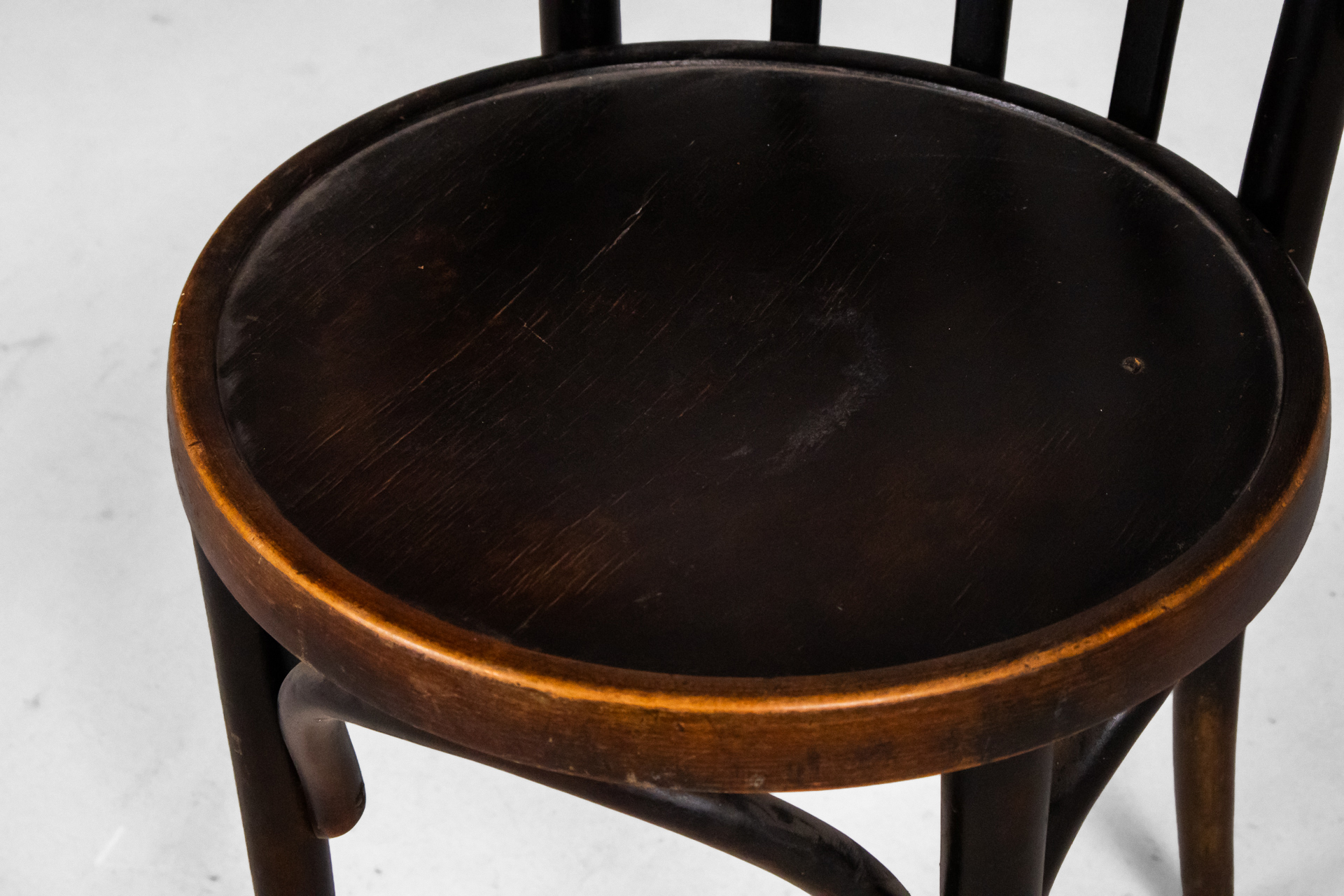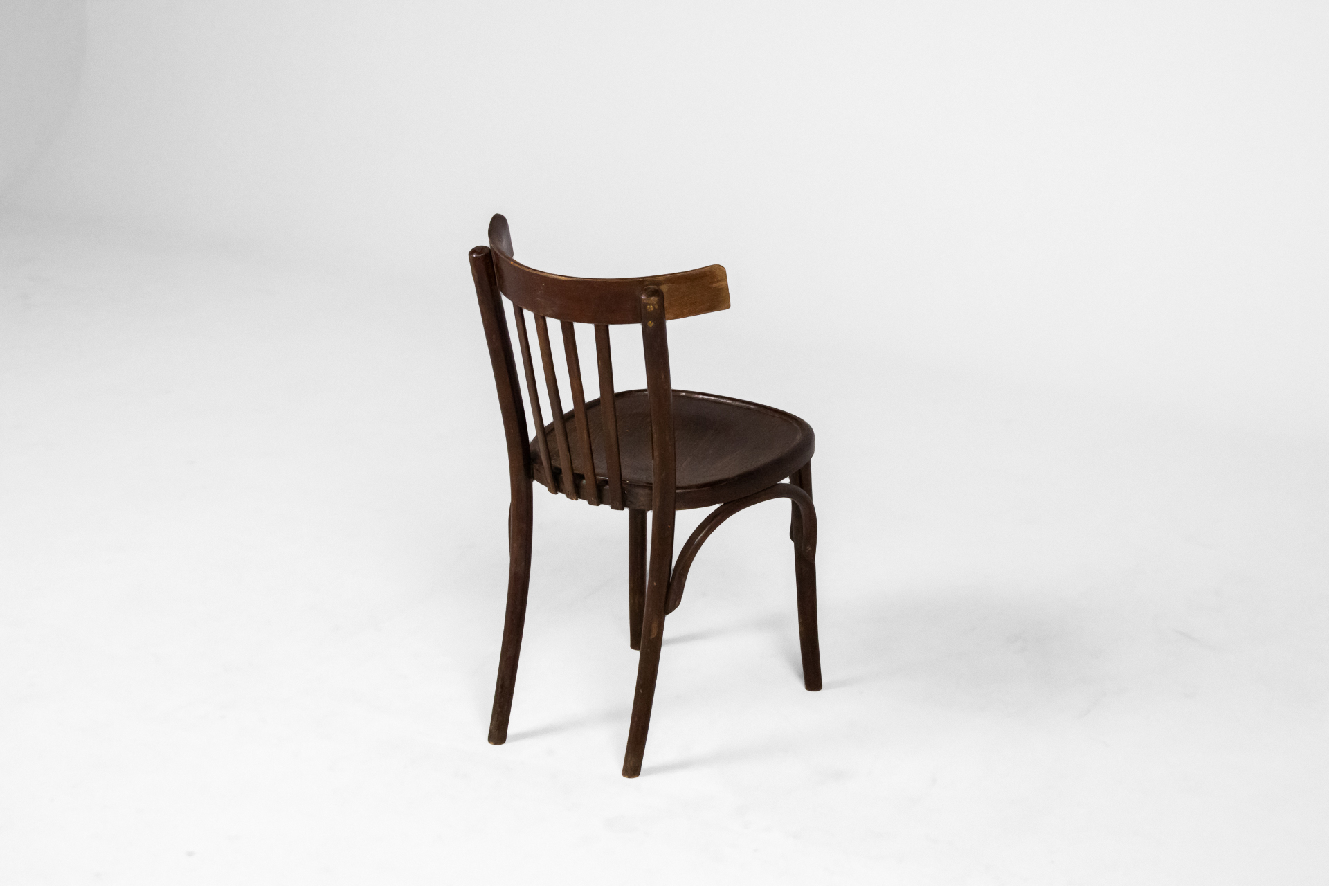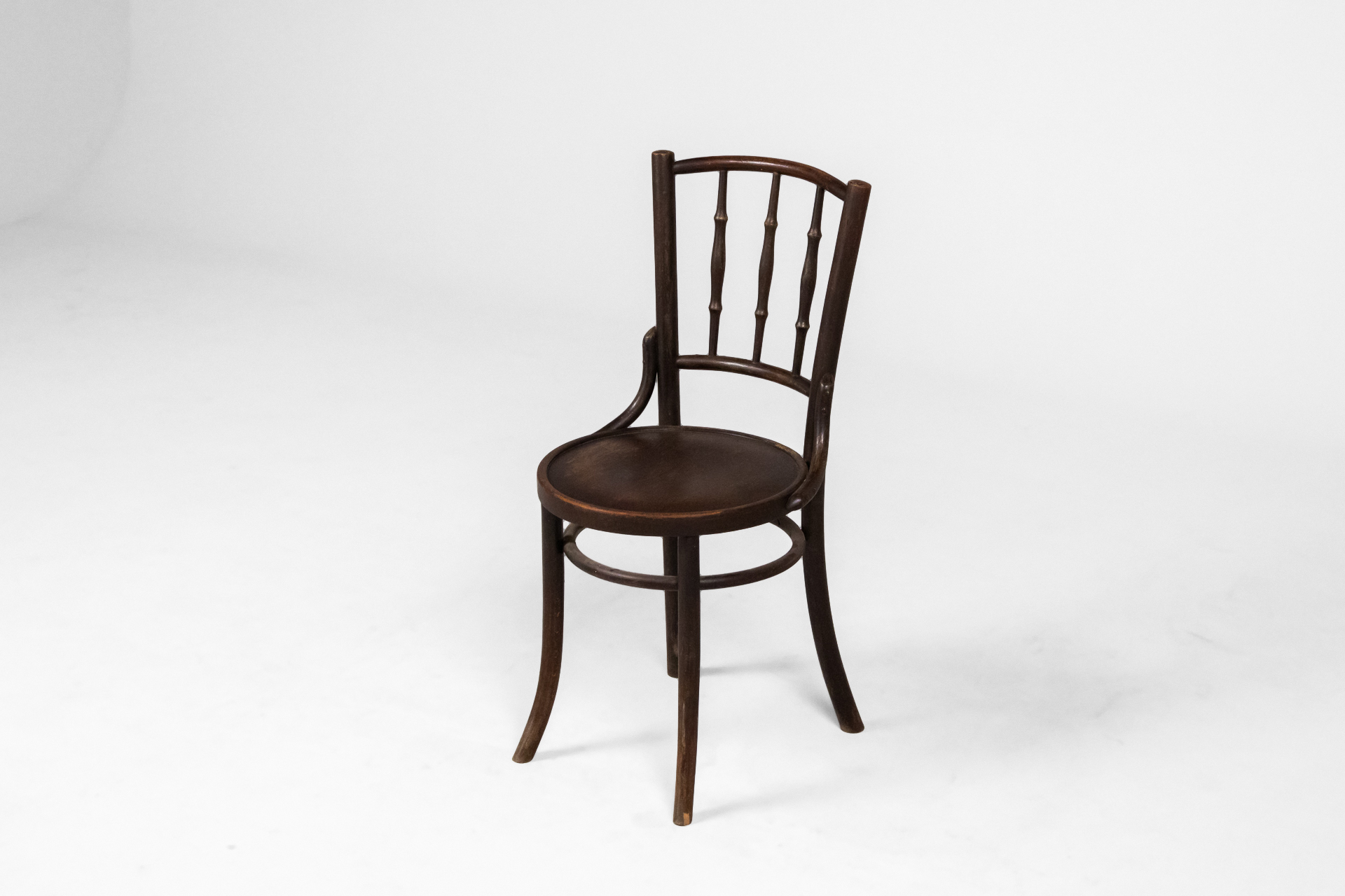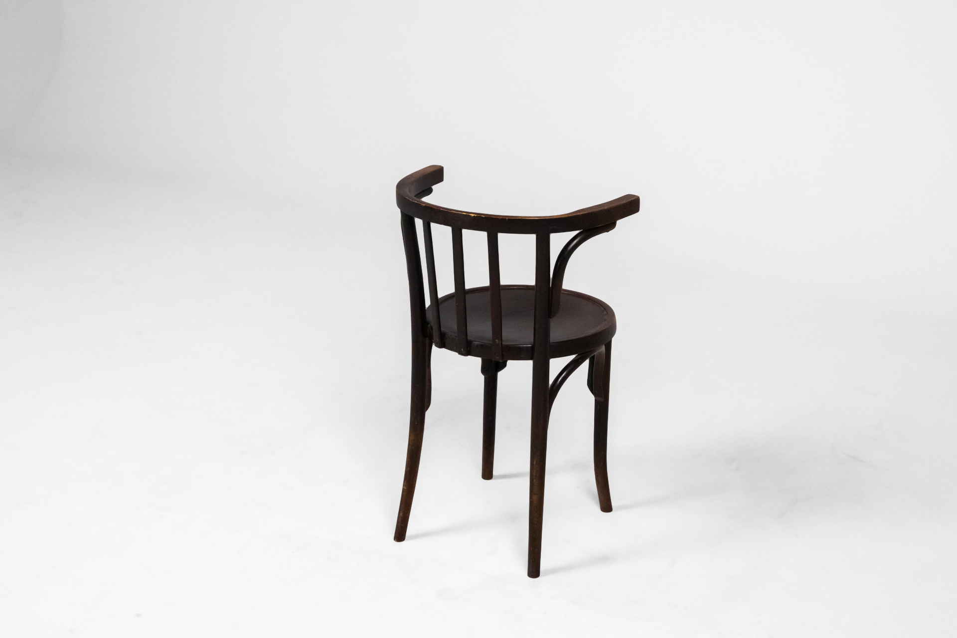 Kerek, sötétbarna fa szék, ívelt háttámlával és négy vékony lábbal