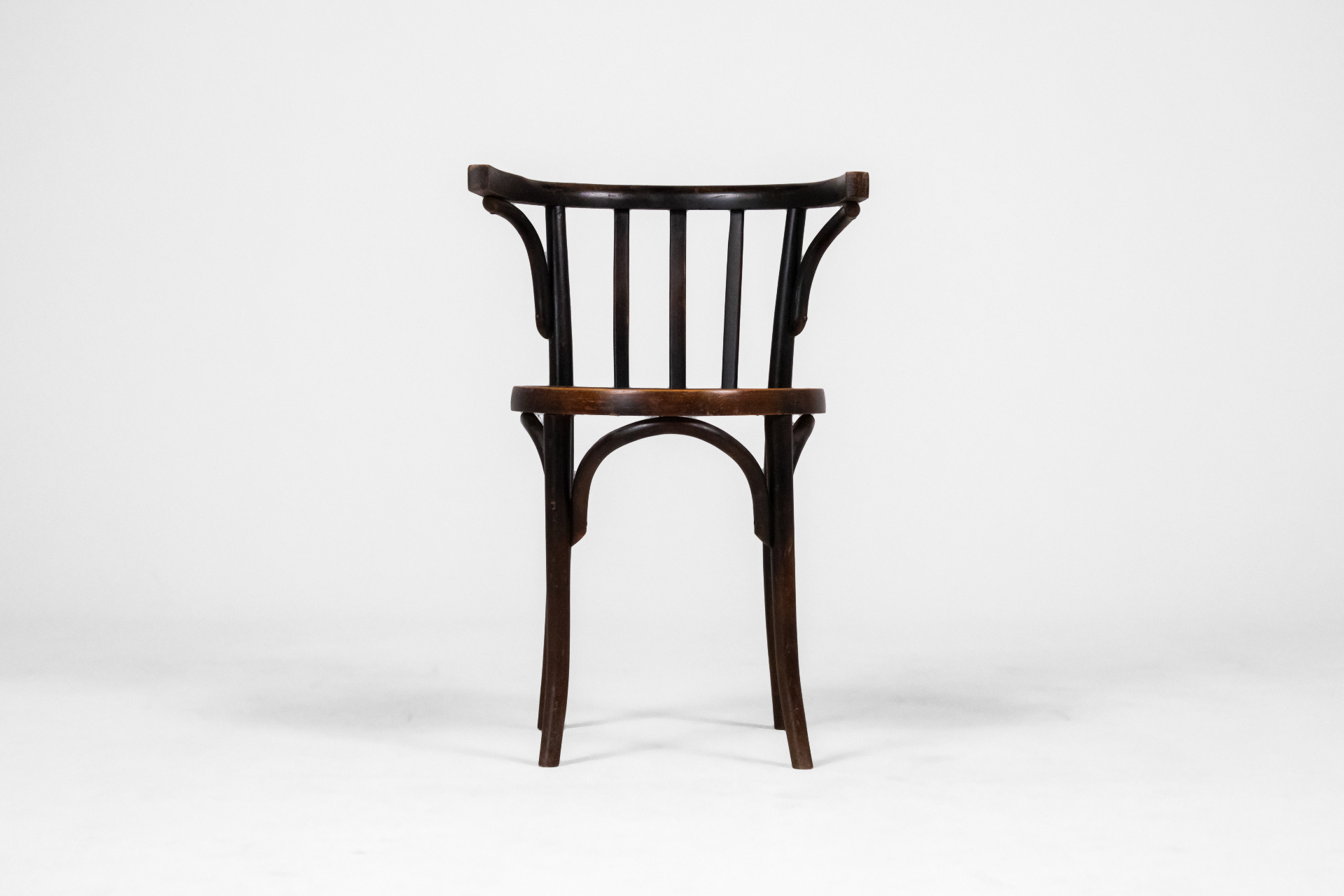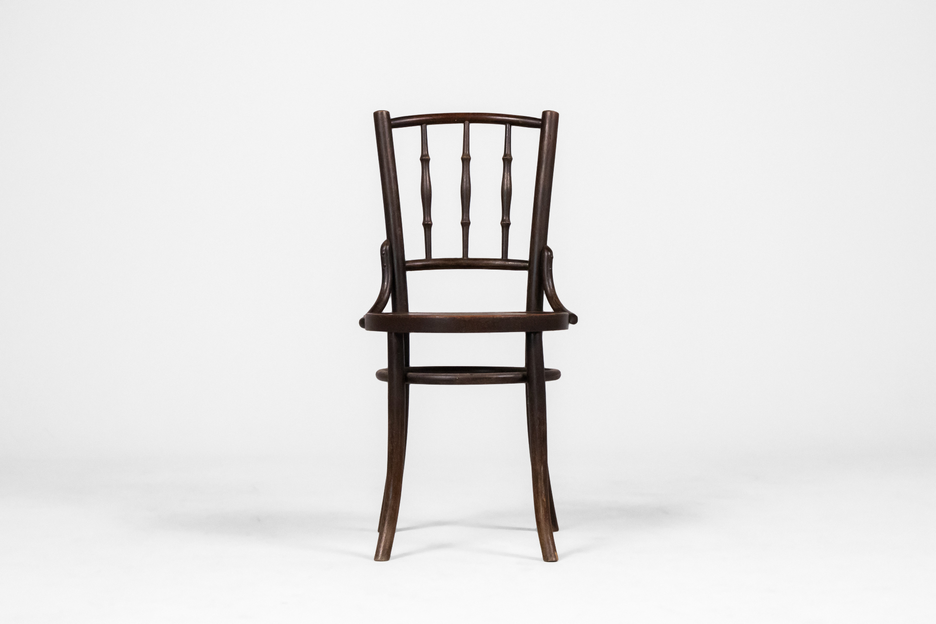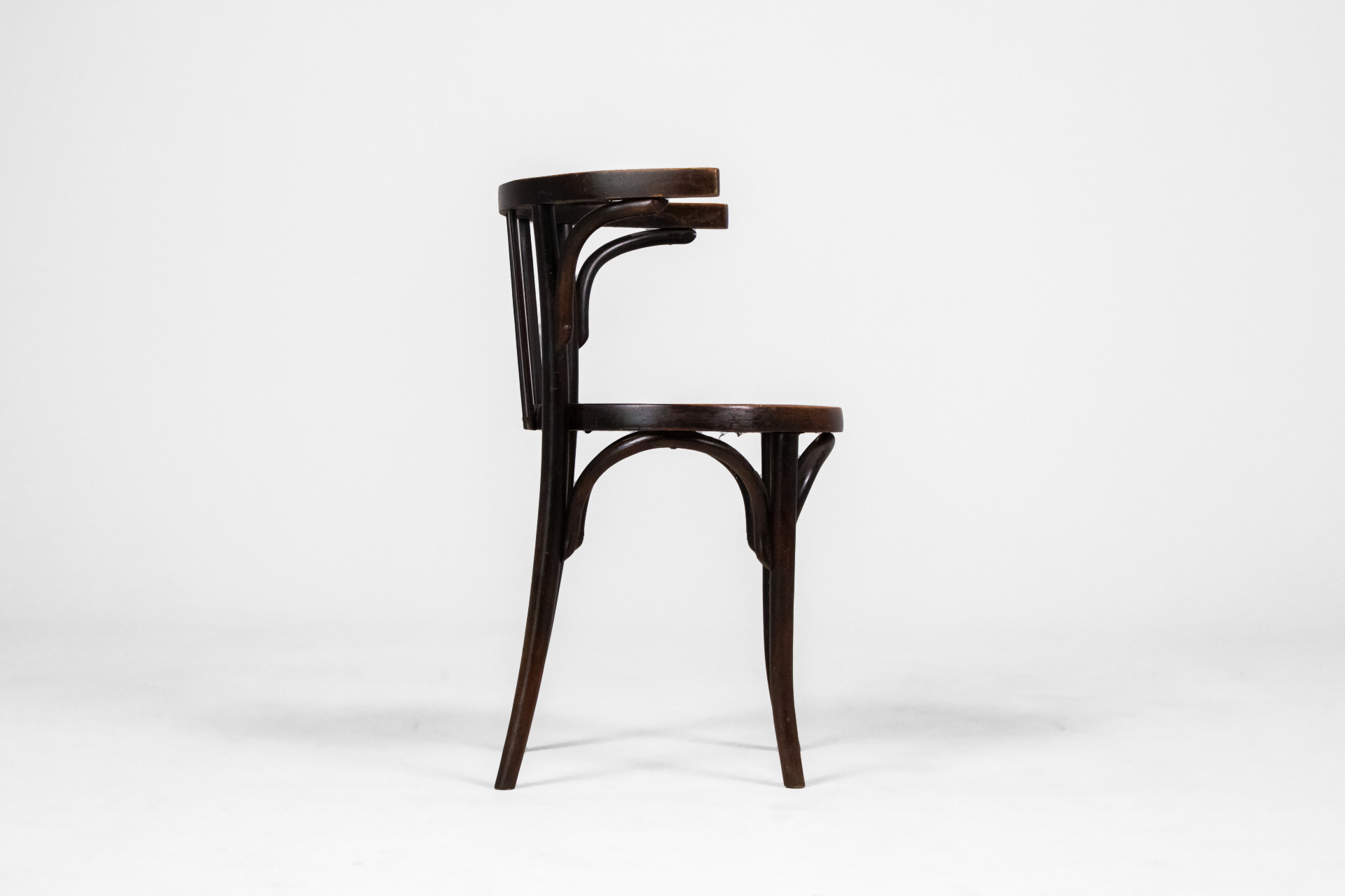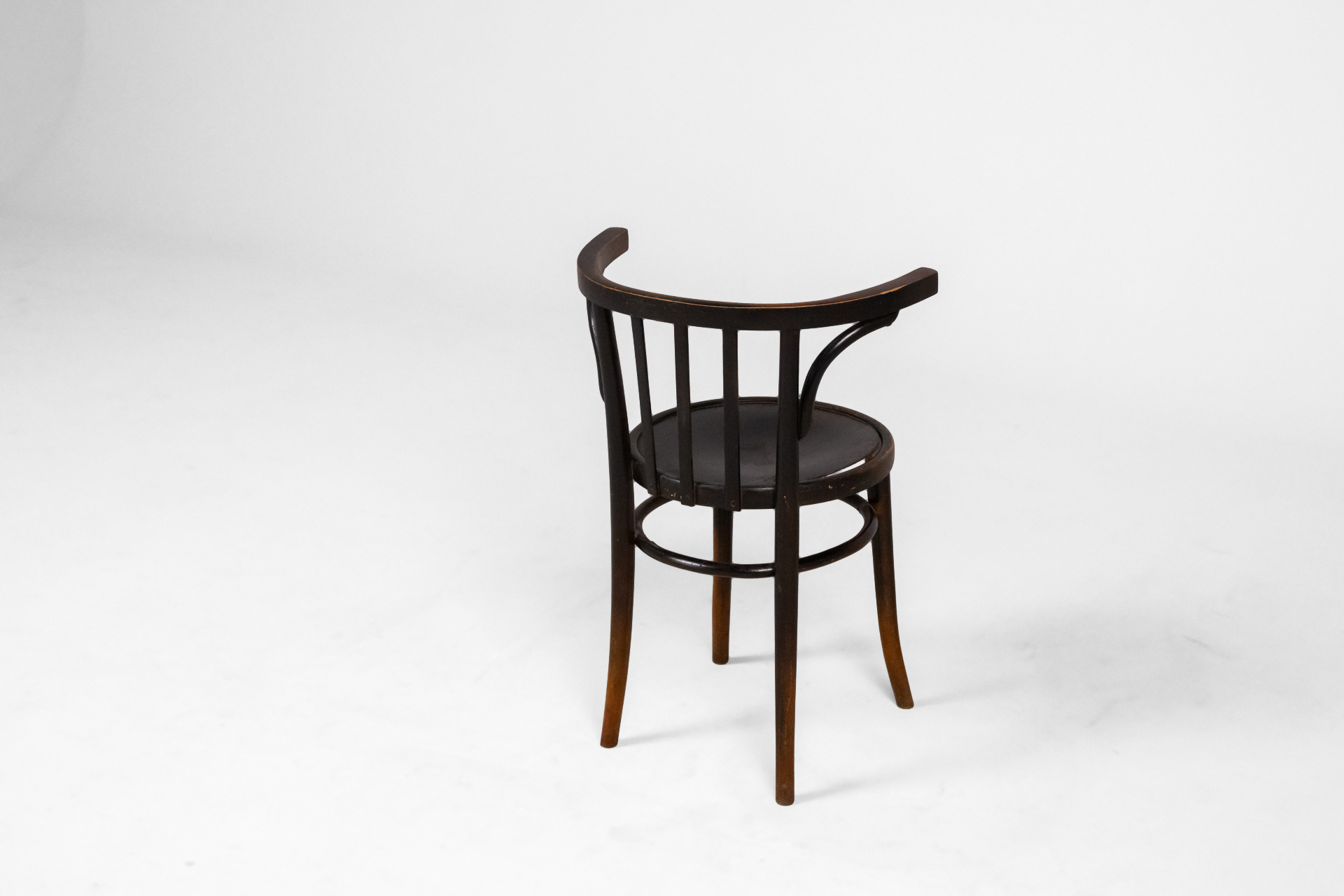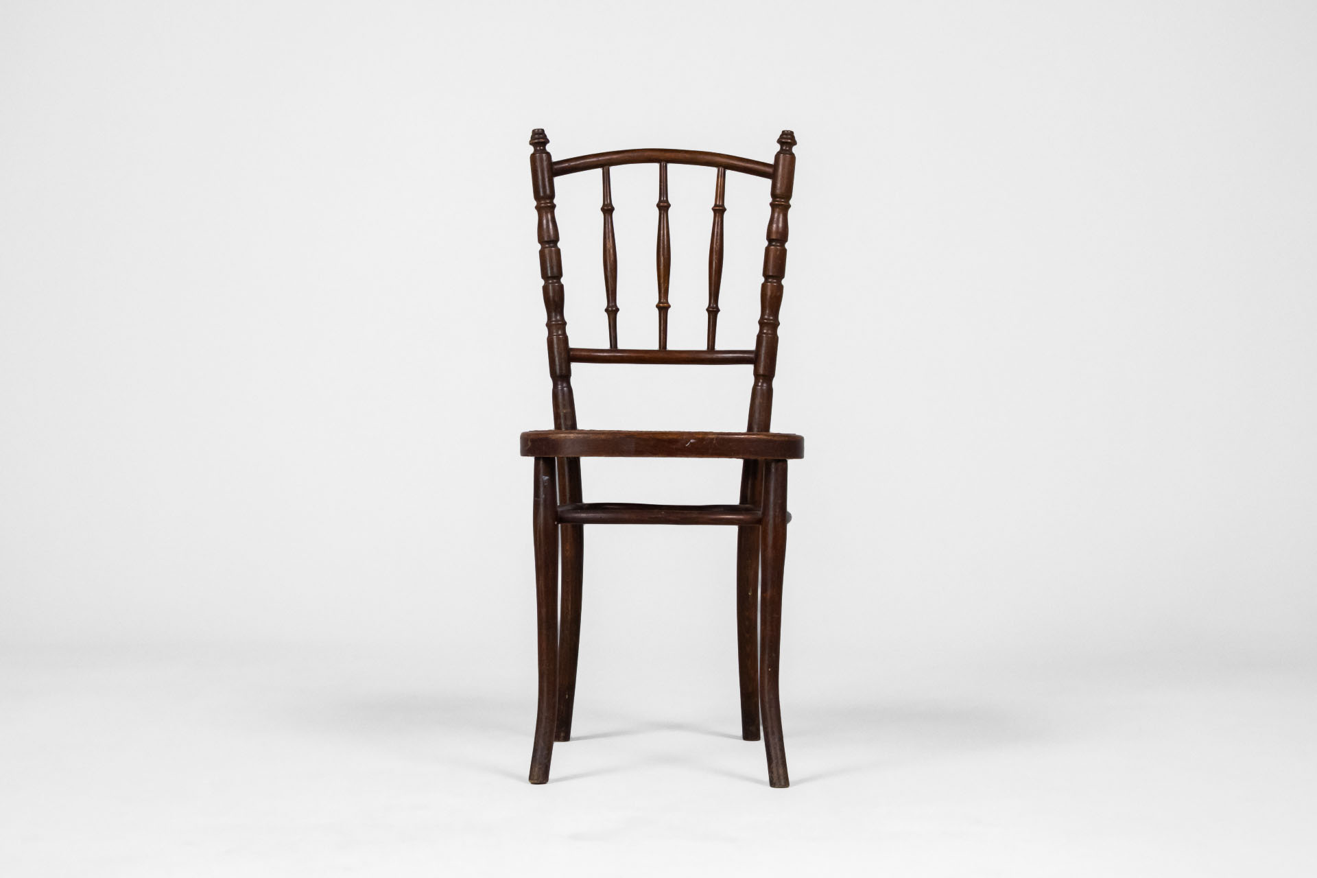 Kerek, sötétbarna fa szék, ívelt háttámlával és négy vékony lábbal