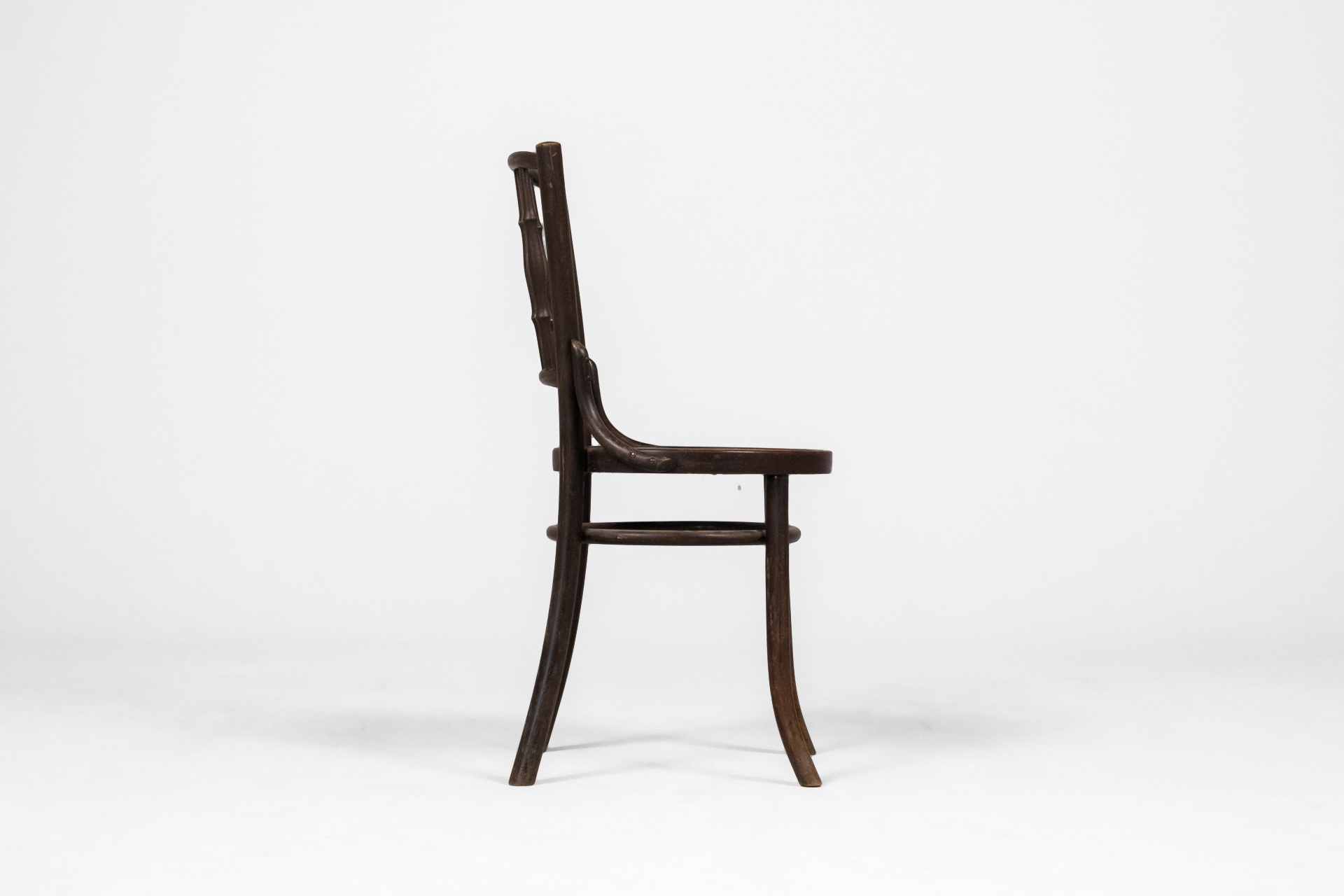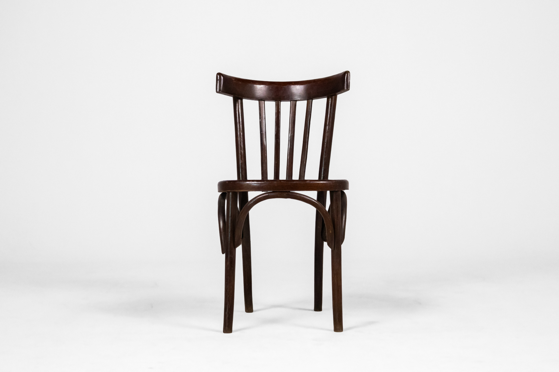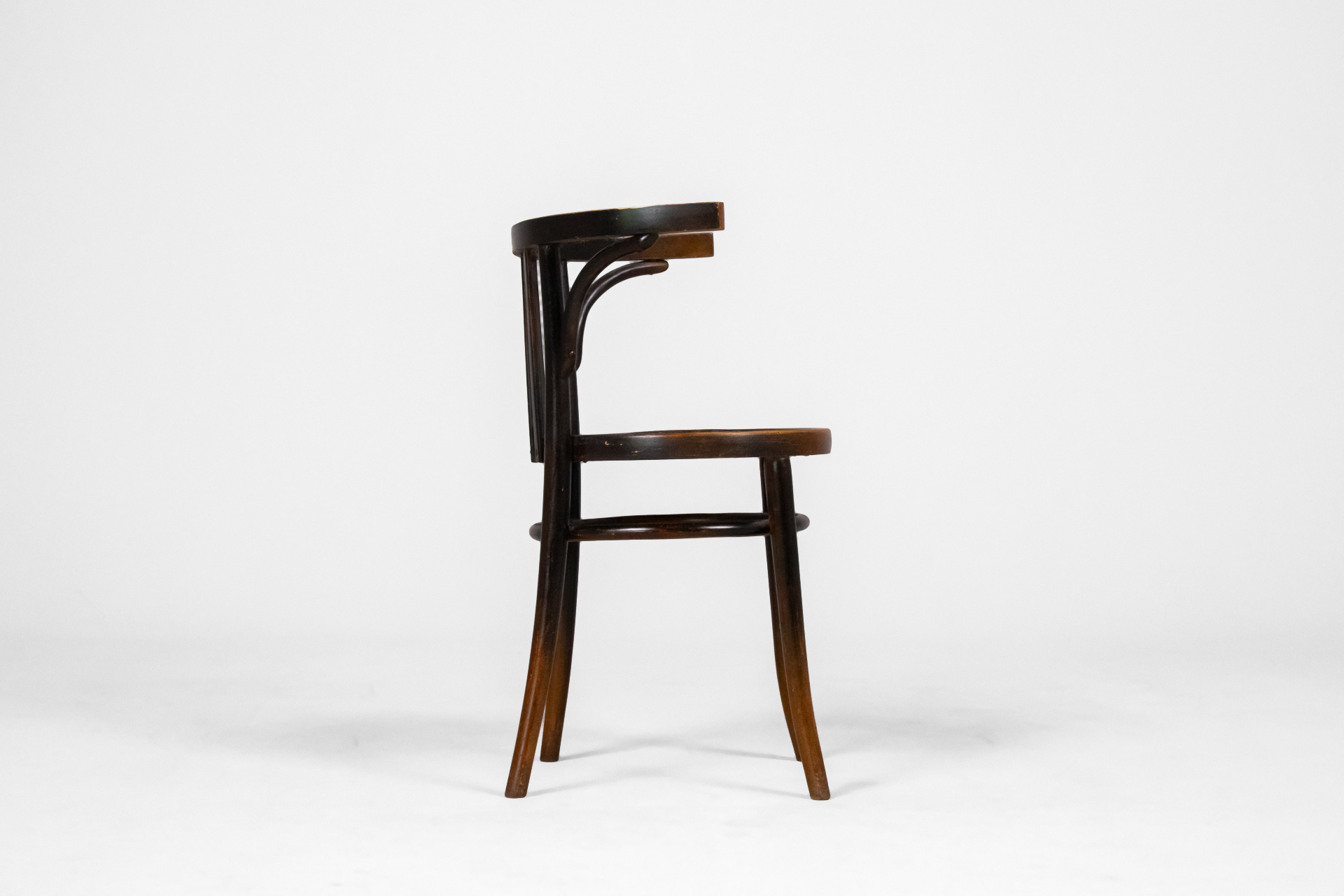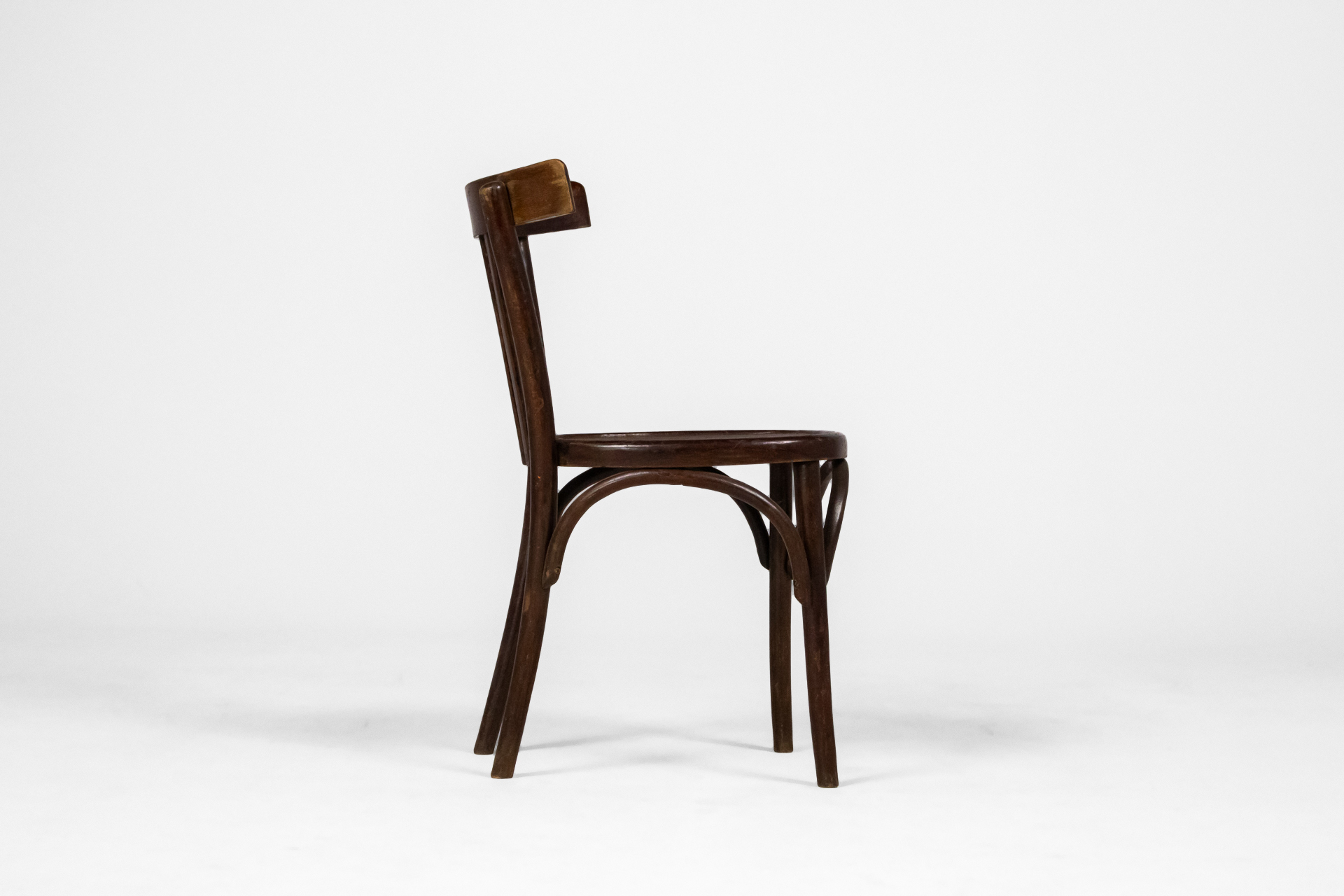 Kerek, sötétbarna fa szék, ívelt háttámlával és négy vékony lábbal