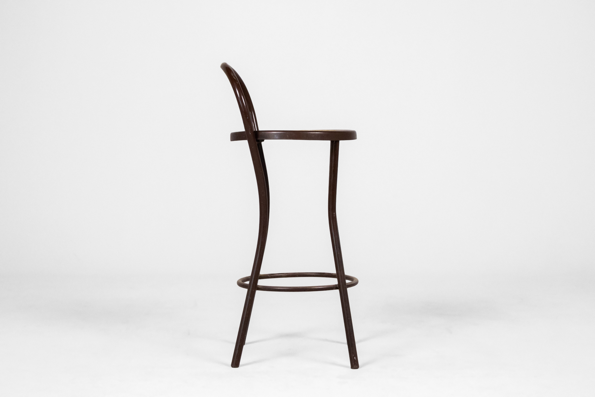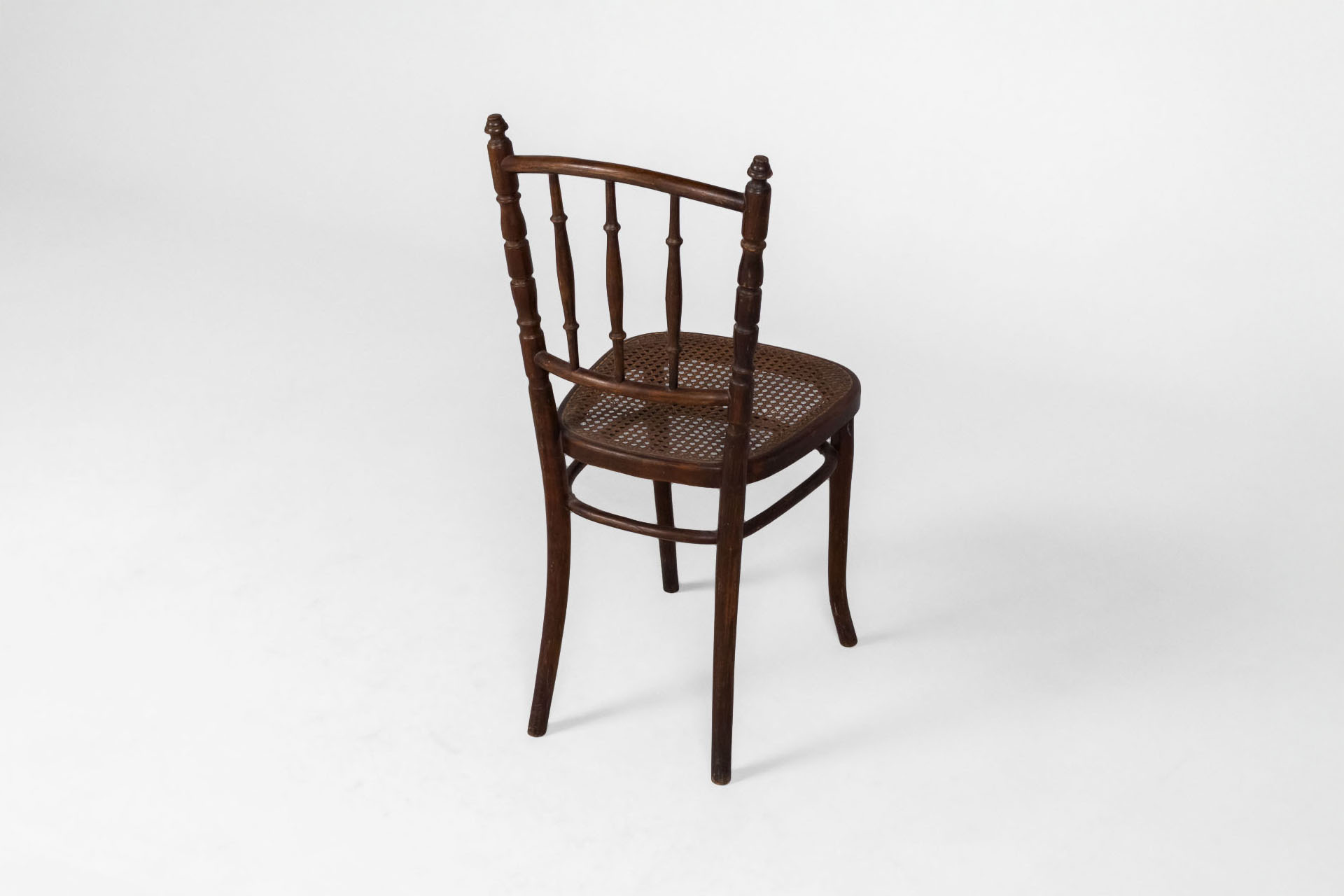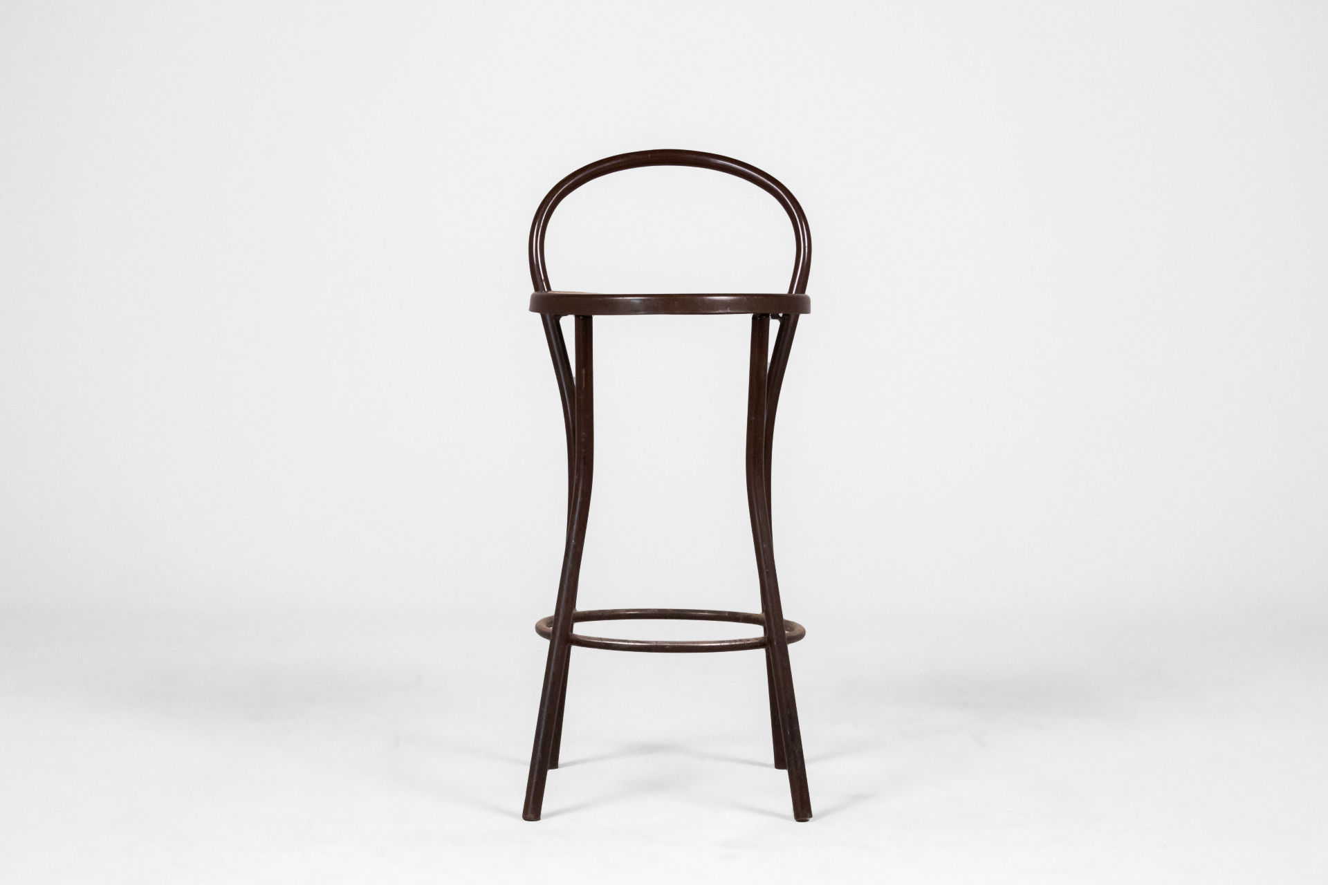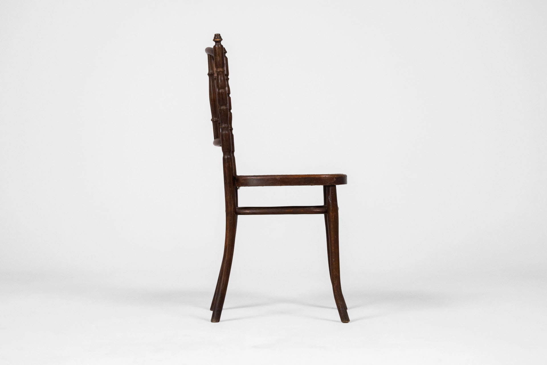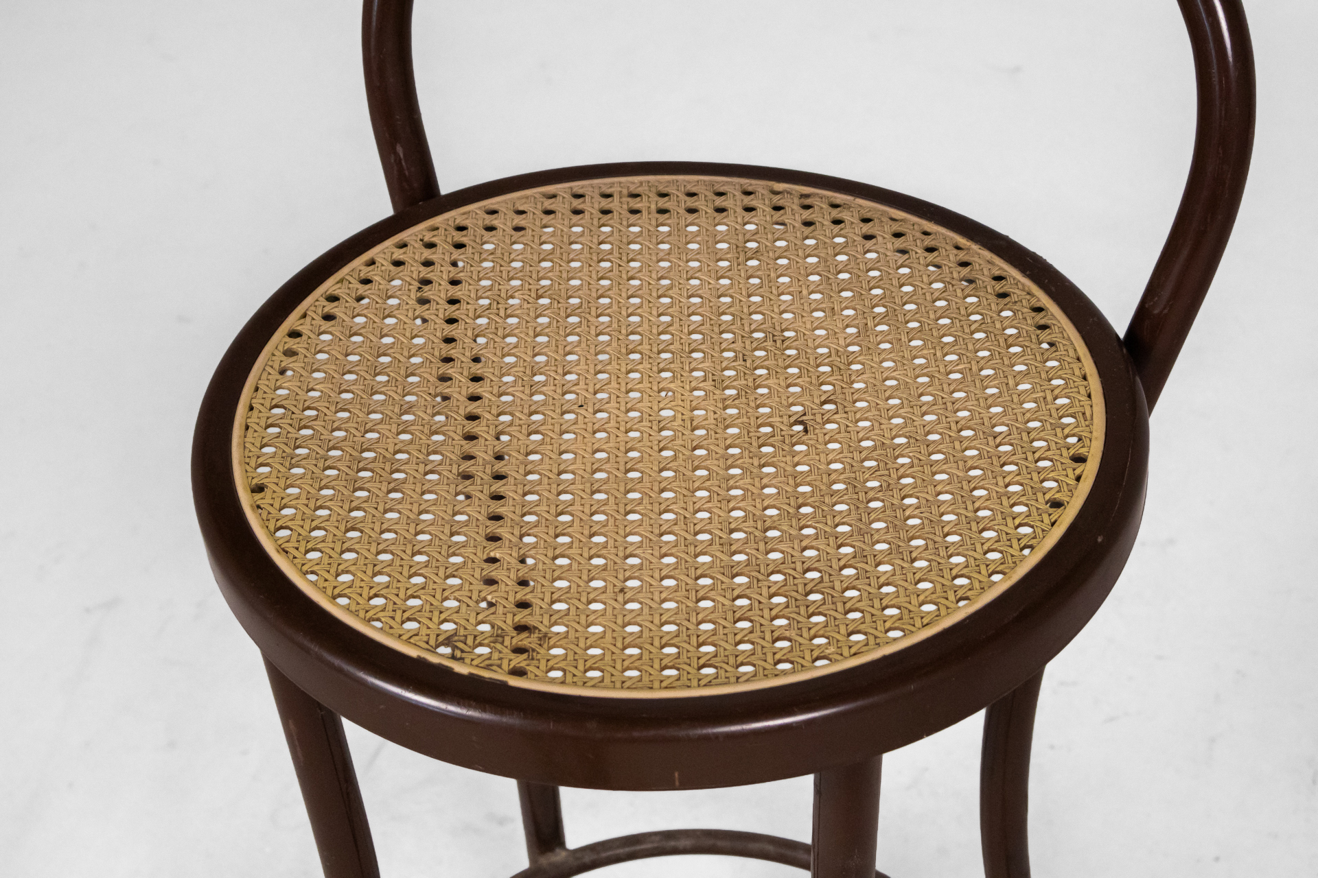 Kerek, sötétbarna fa szék, ívelt háttámlával és négy vékony lábbal