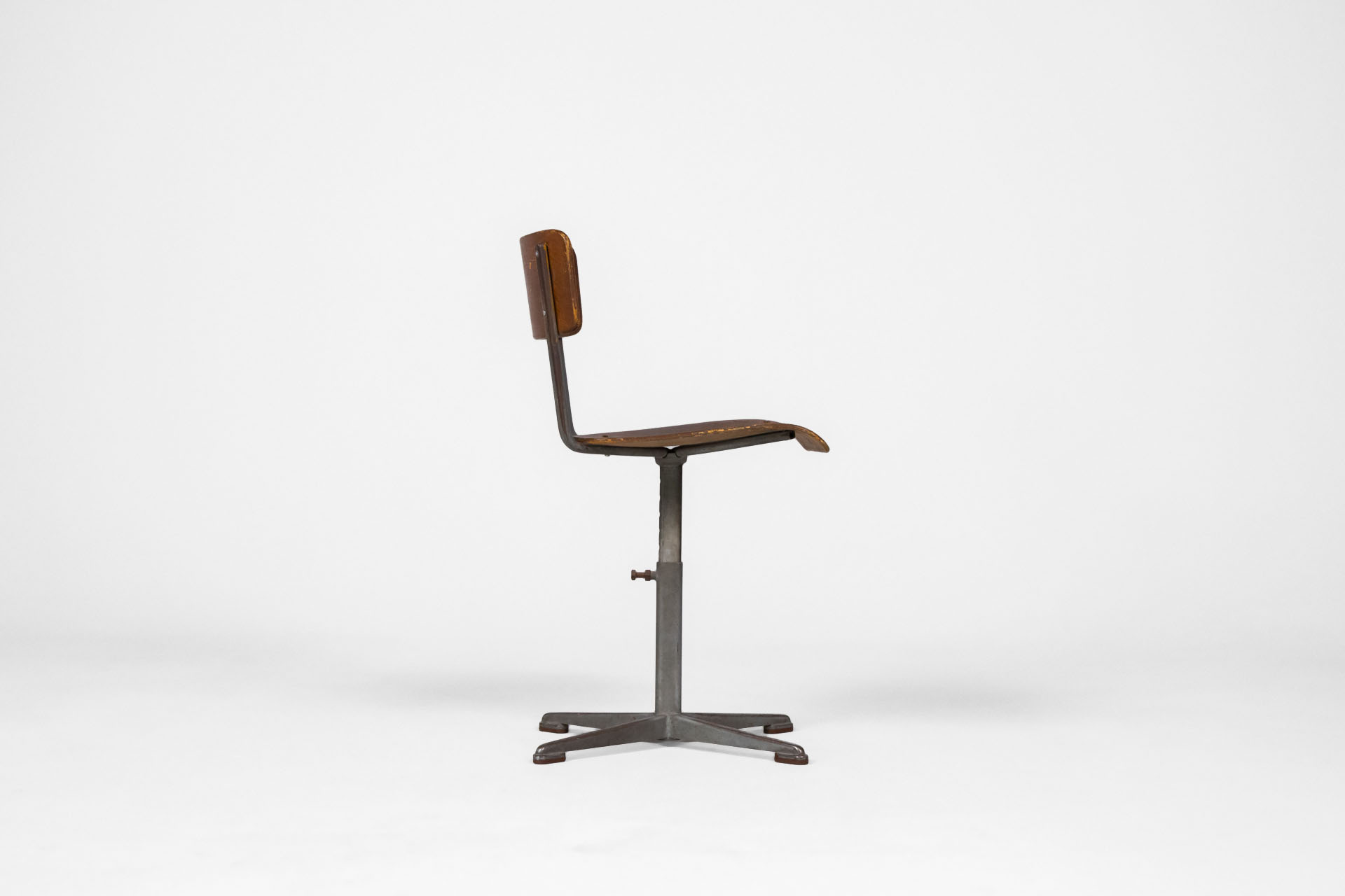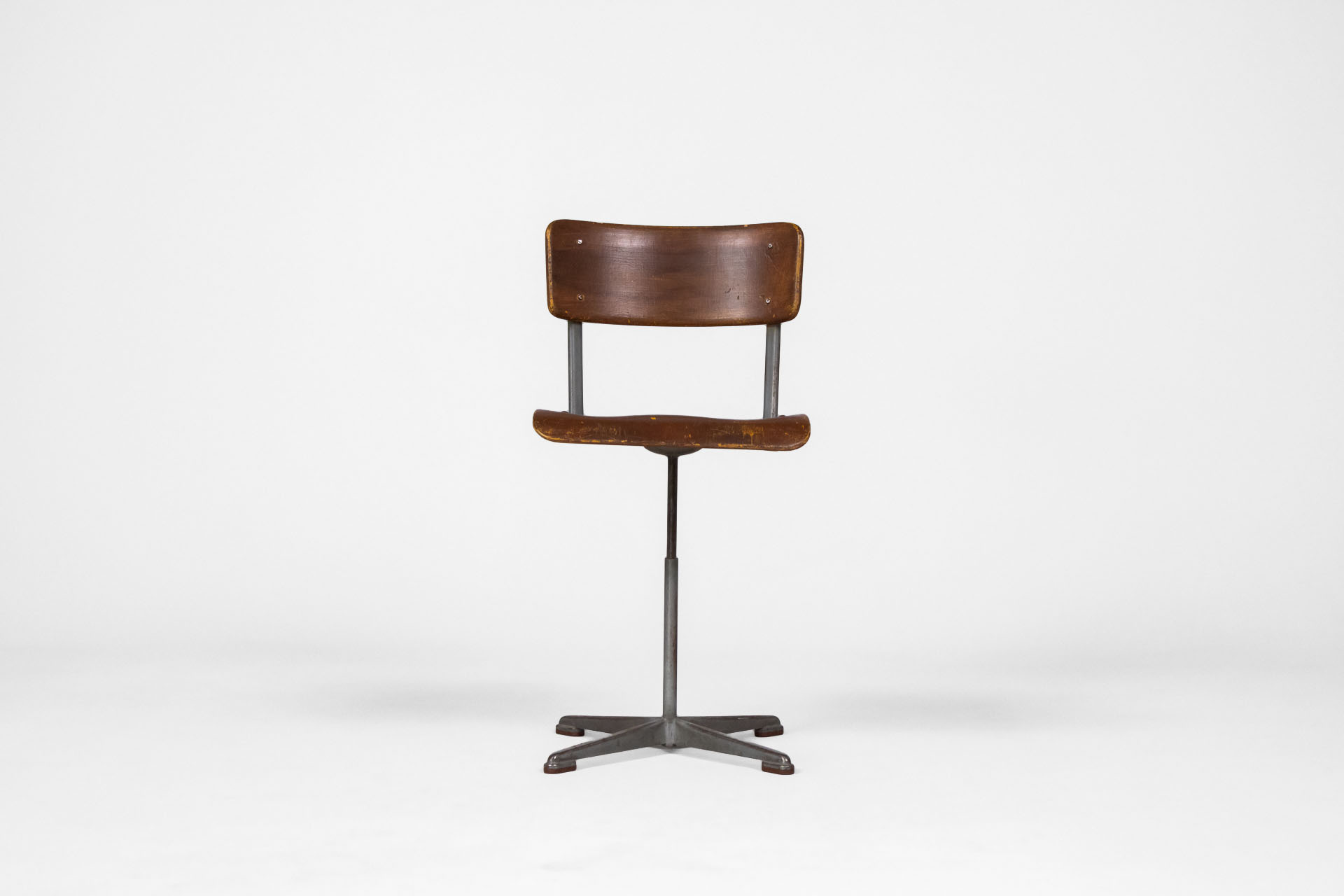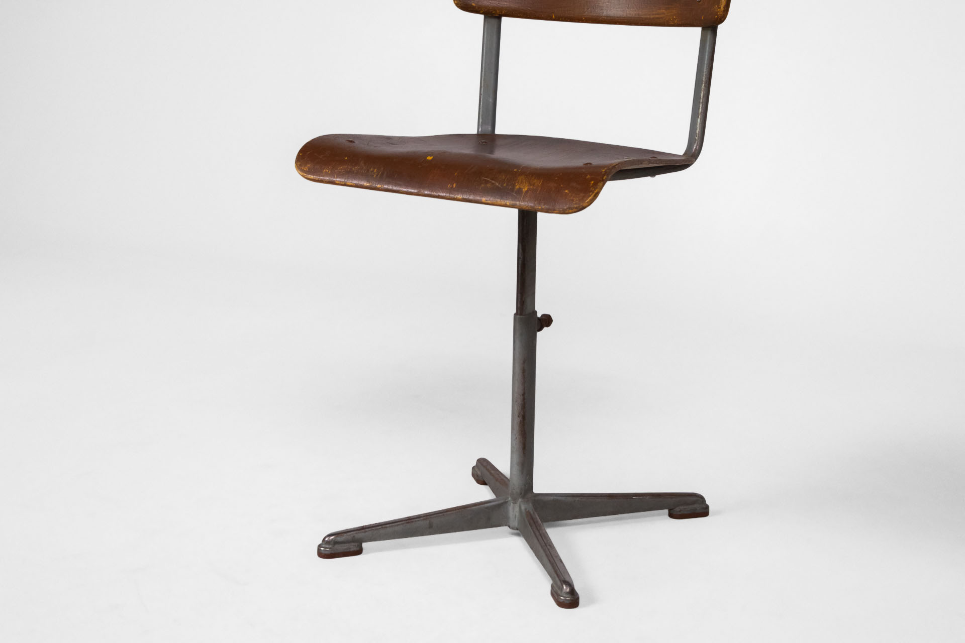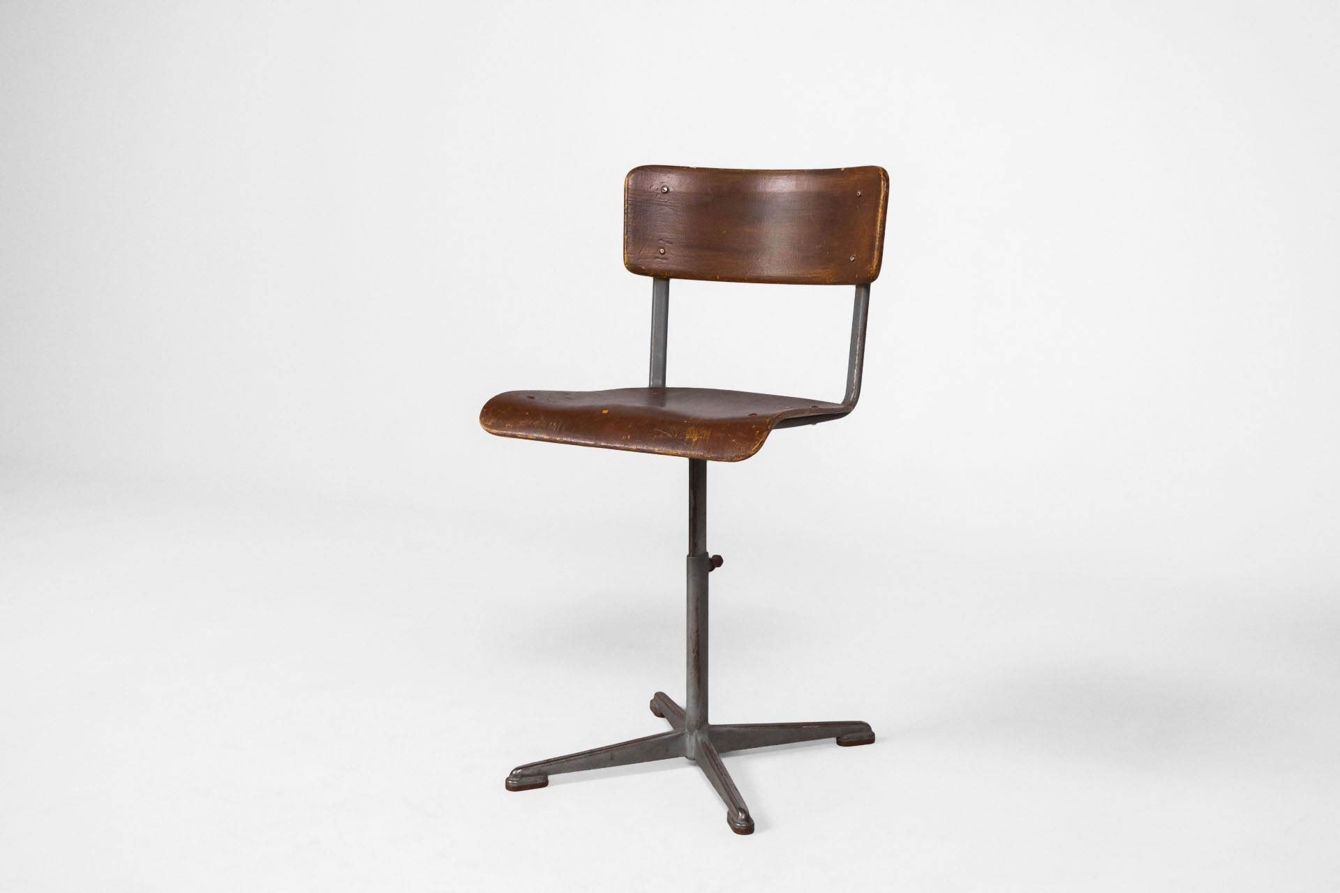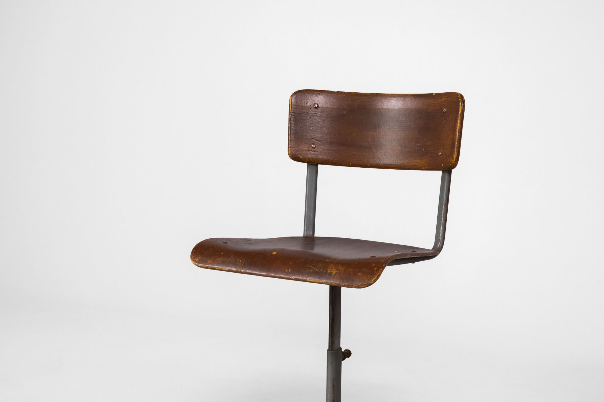 Klasszikus, retro stílusú forgószék, amely fém vázzal és sötétbarna, kopott fa ülőfelülettel rendelkezik. Az ülőke ergonomikus formája kényelmes ülést biztosít, míg a négyágú fém alap stabilitást nyújt. Ideális...