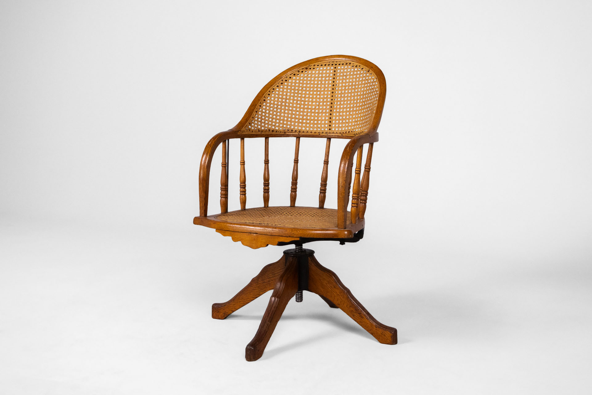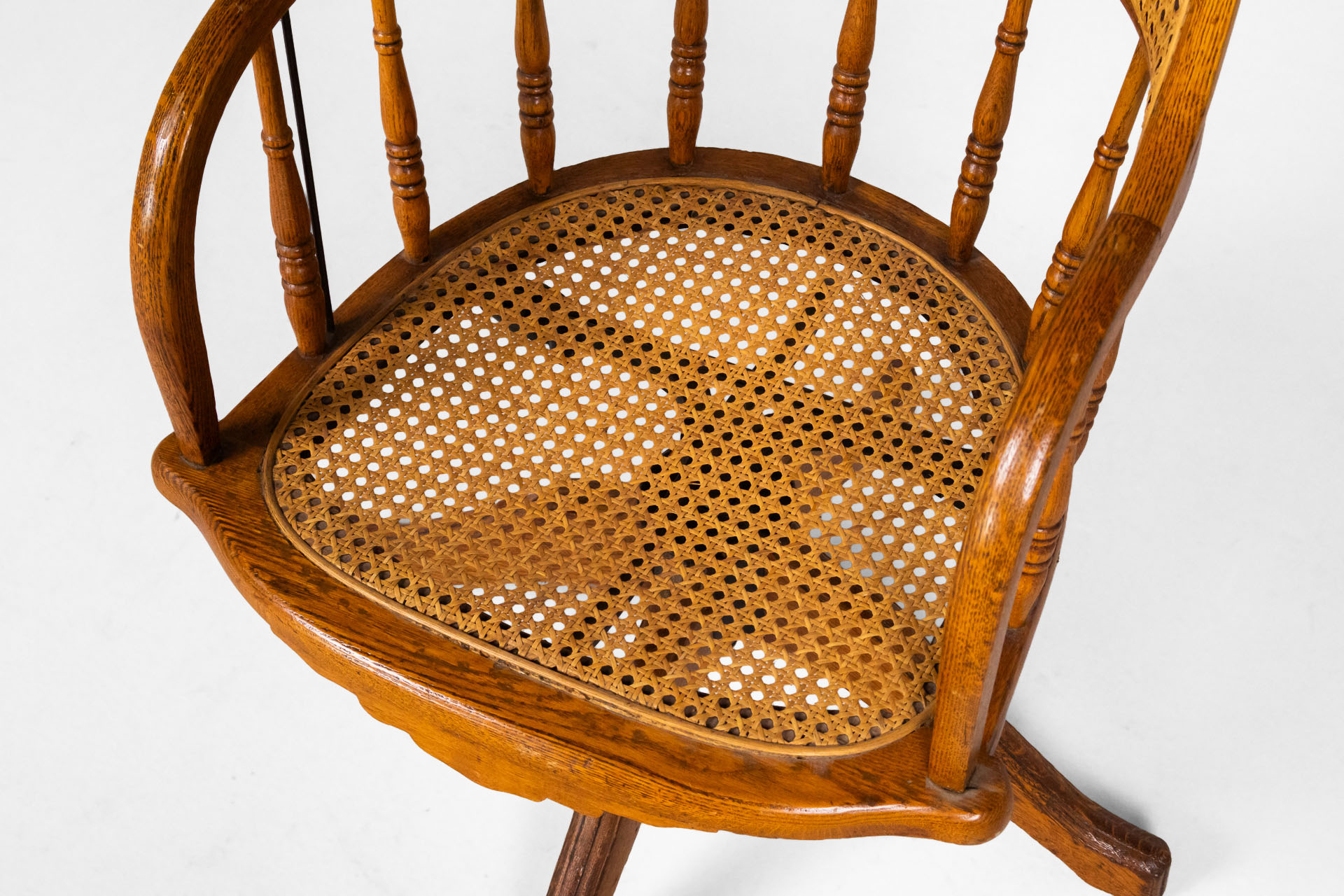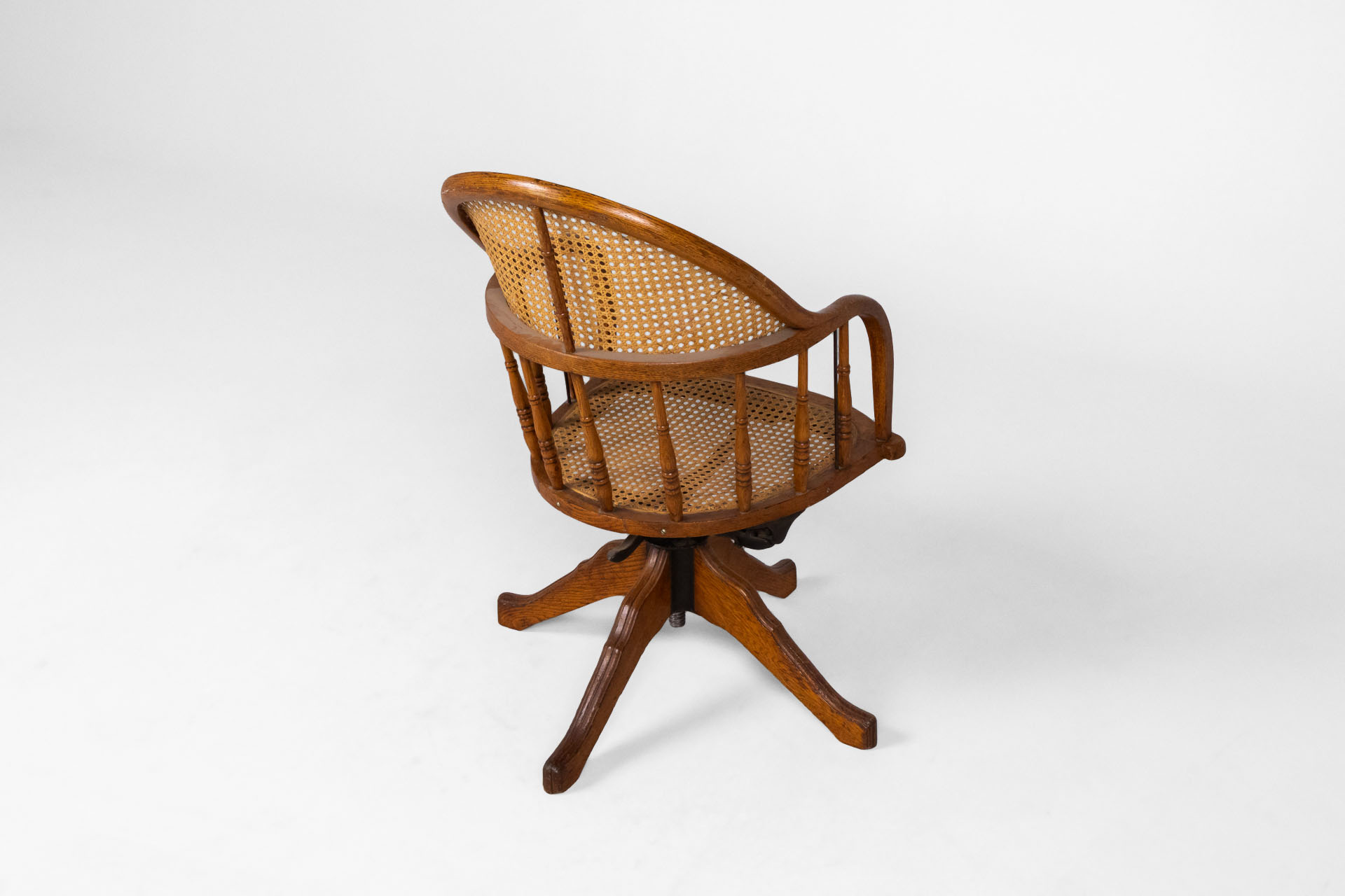 Kényelmes, vintage stílusú forgószék, amely rattan ülőfelülettel és háttámlával rendelkezik. A szék masszív fa szerkezete és elegáns, ívelt formája időtlen megjelenést kölcsönöz