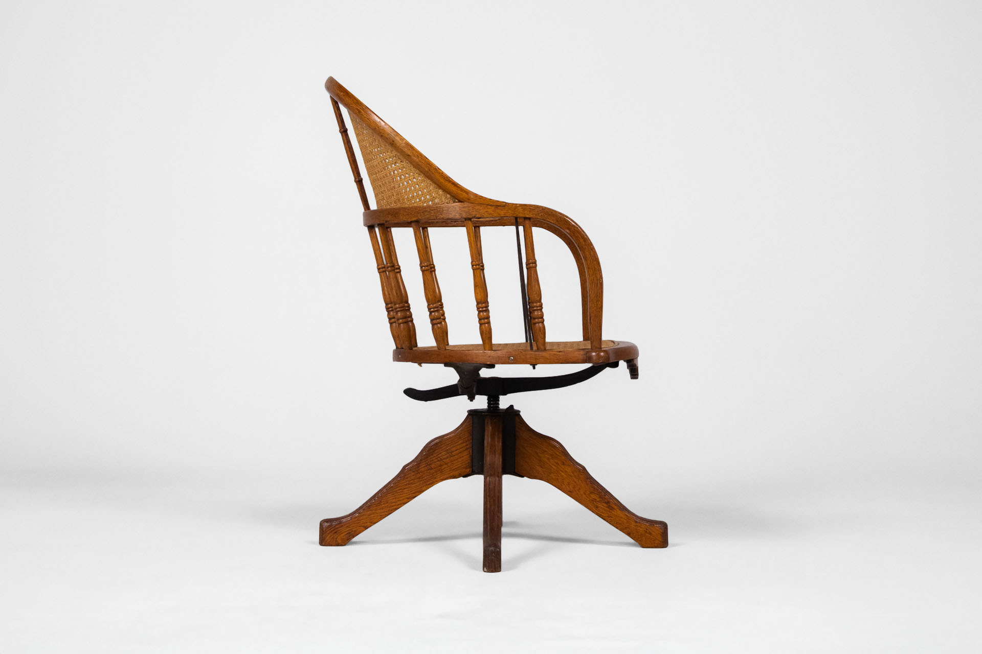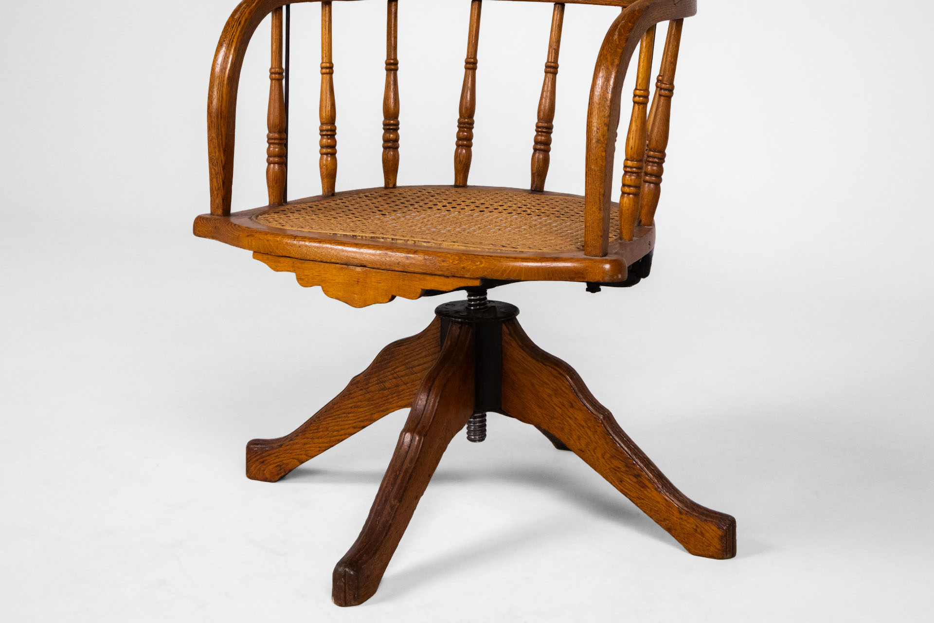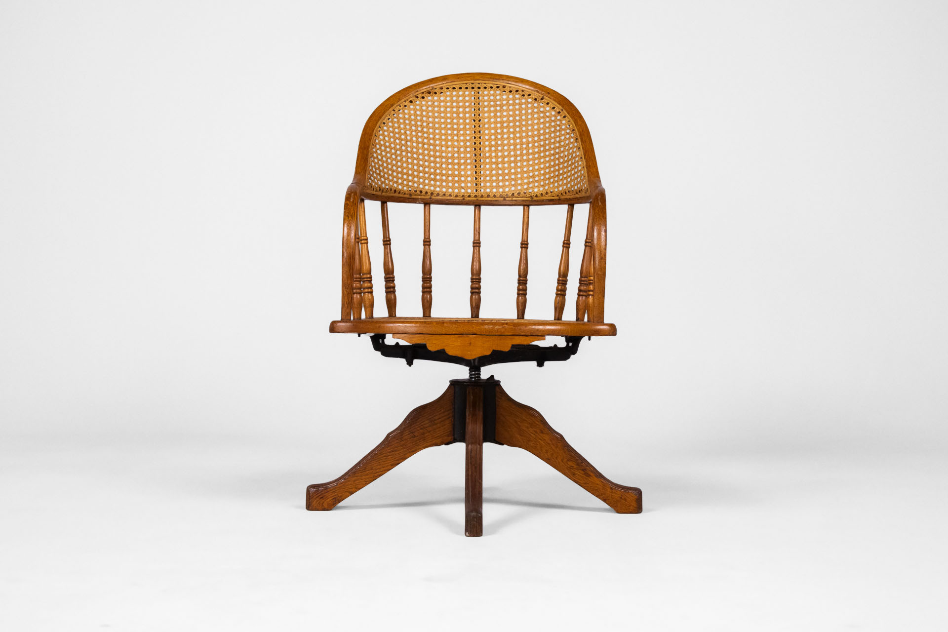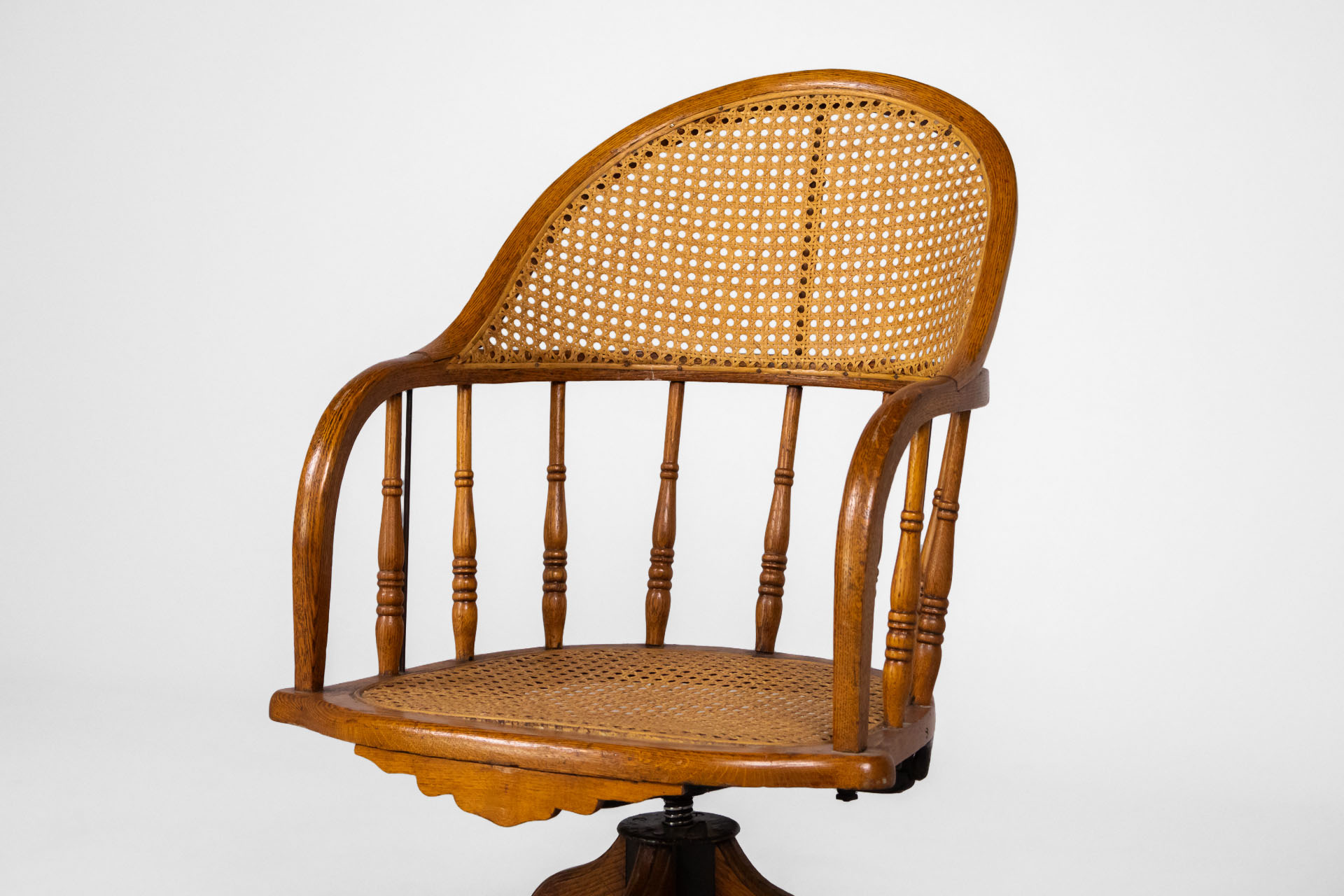Kényelmes, vintage stílusú forgószék, amely rattan ülőfelülettel és háttámlával rendelkezik. A szék masszív fa szerkezete és elegáns, ívelt formája időtlen megjelenést kölcsönöz