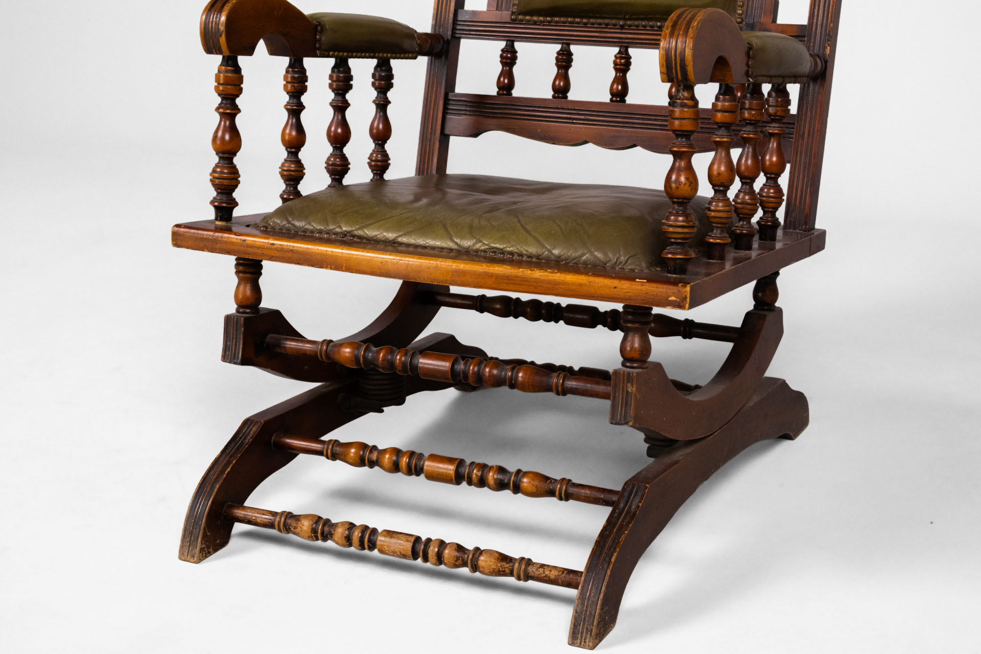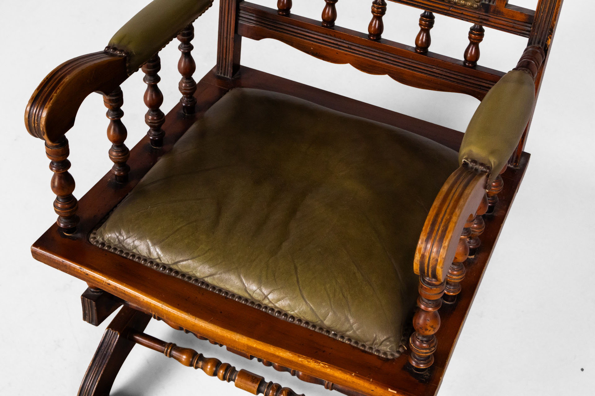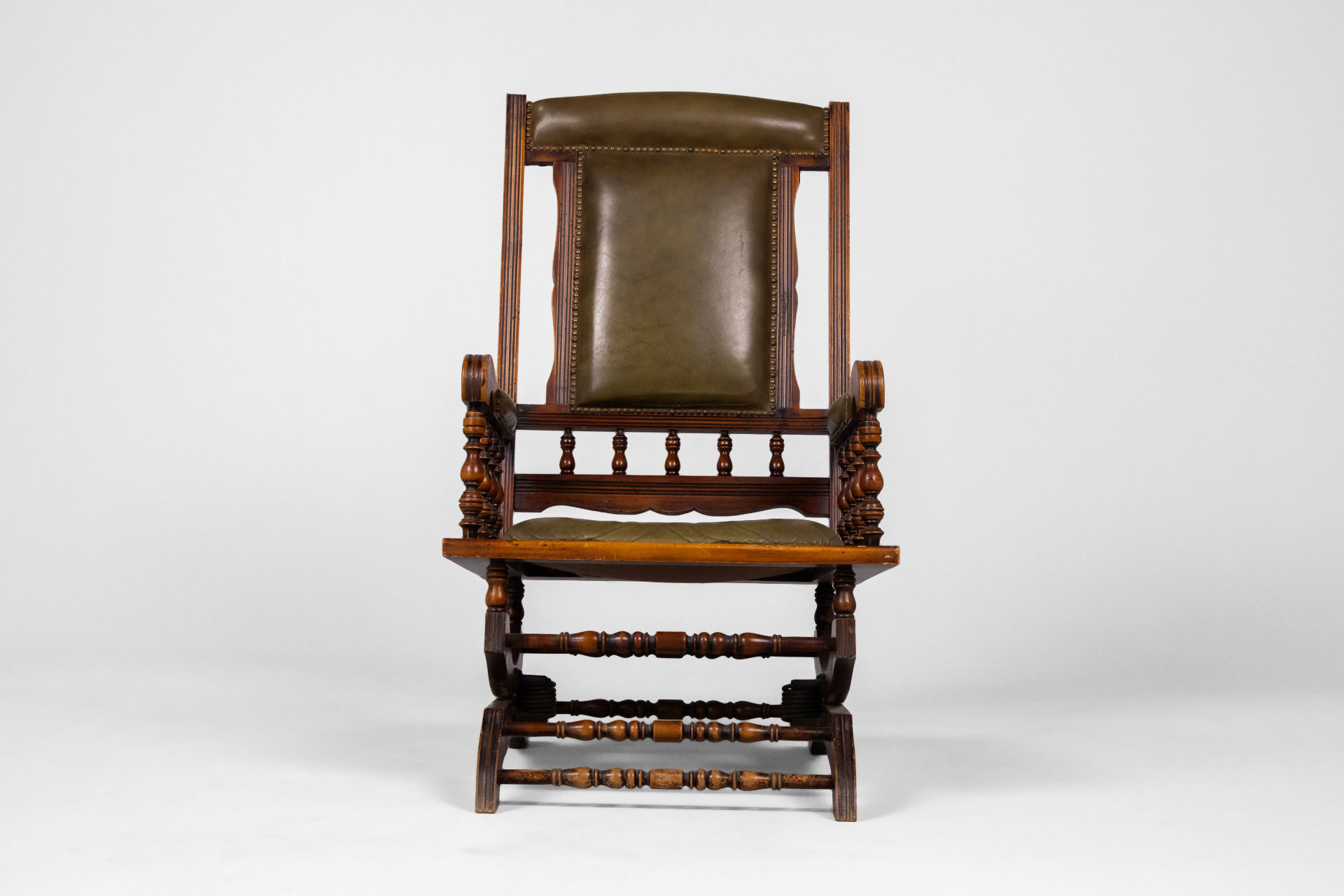 Klasszikus stílusú, elegáns hintaszék, amely masszív fa kerettel és kényelmes zöld bőr ülőfelülettel rendelkezik. A díszes faragások és a lekerekített formák időtlen megjelenést kölcsönöznek, ideális választás...