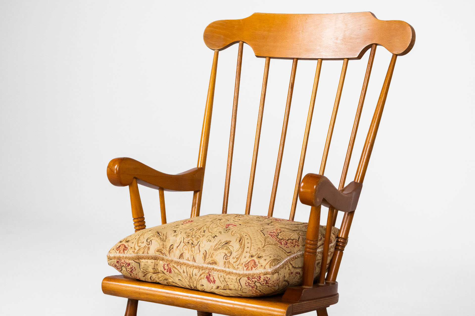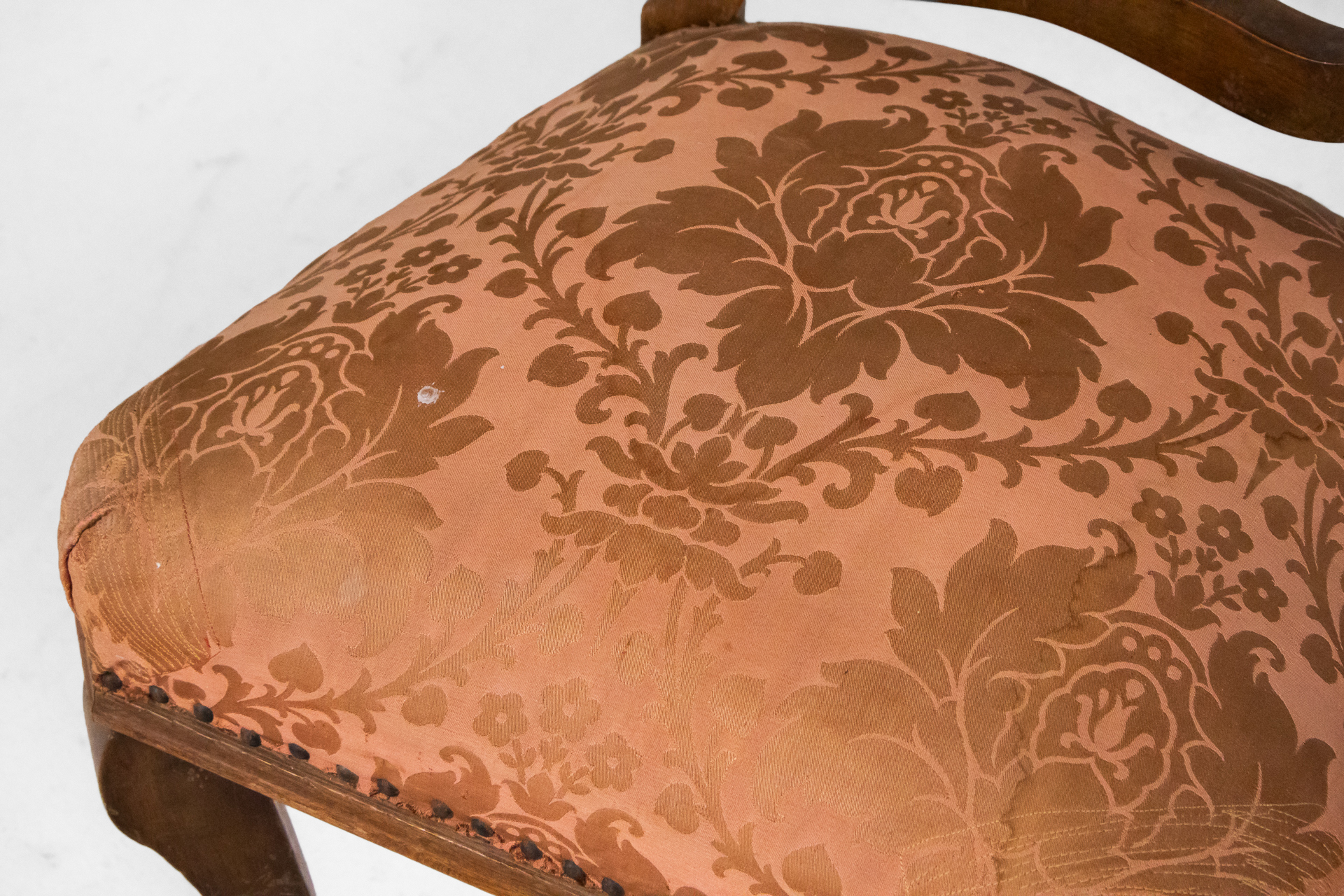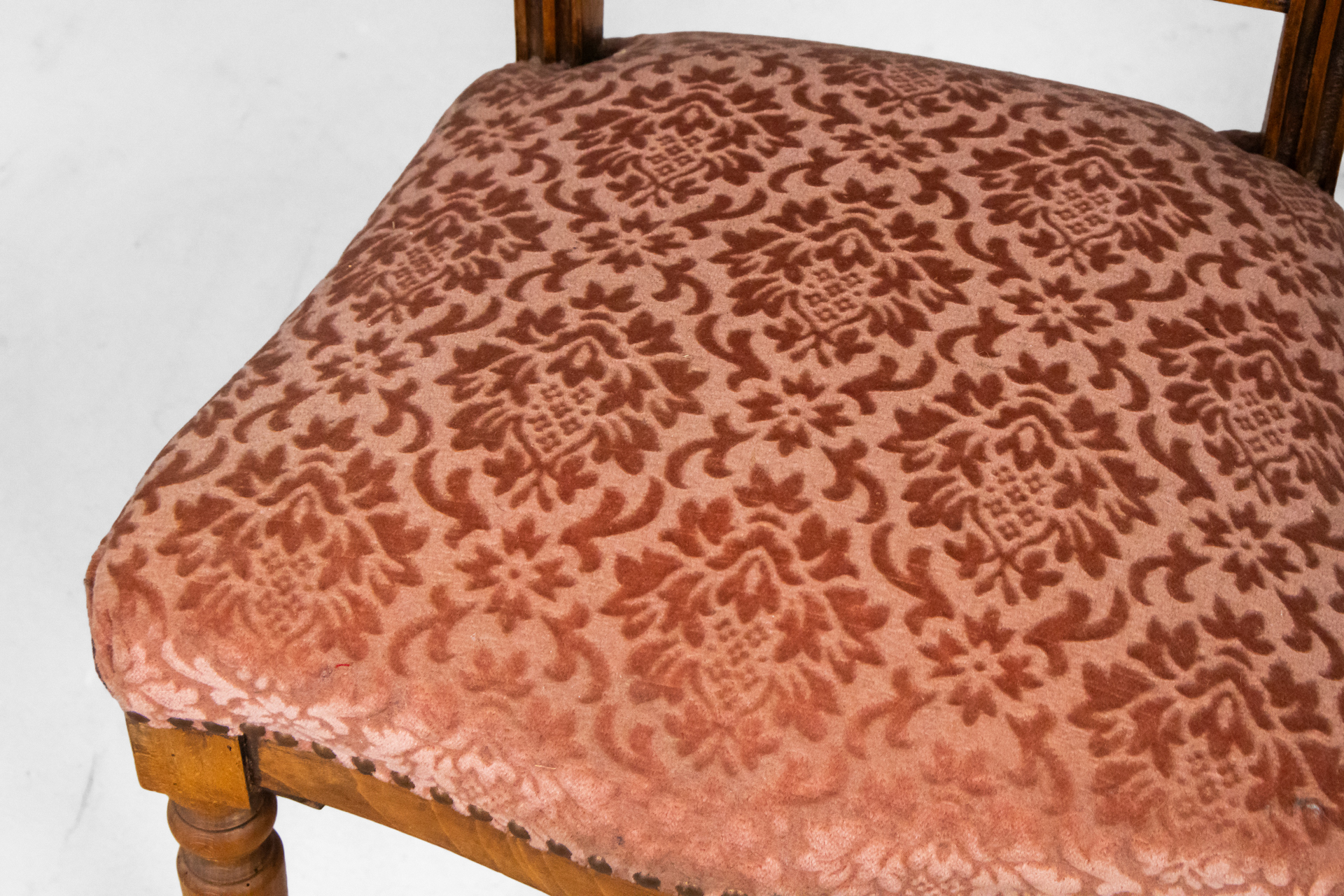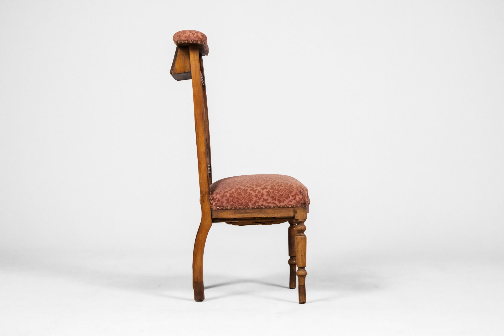 Fából készült, világosbarna szék, rózsaszín, mintás kárpittal a ülőfelületen és háttámlán
