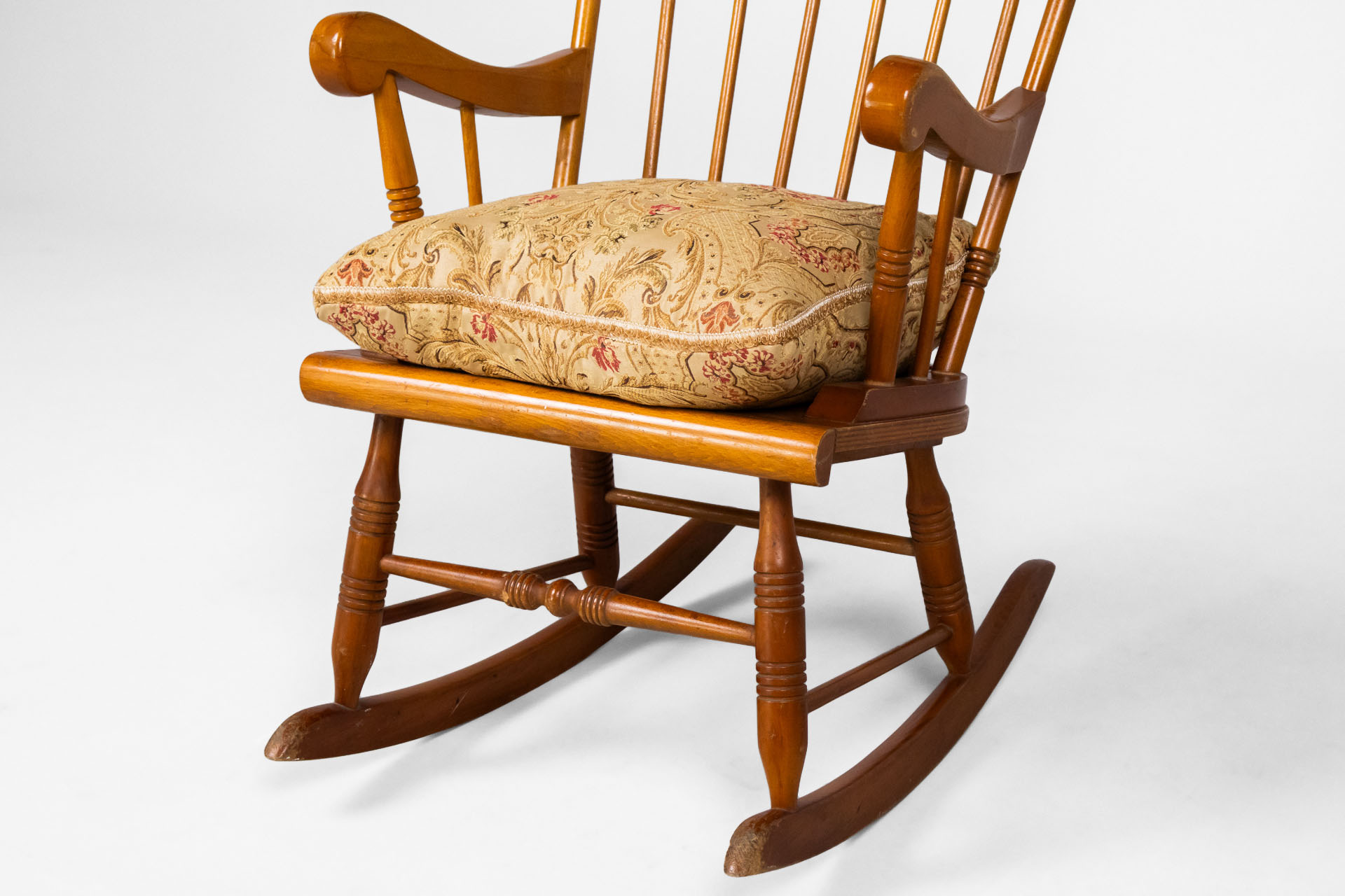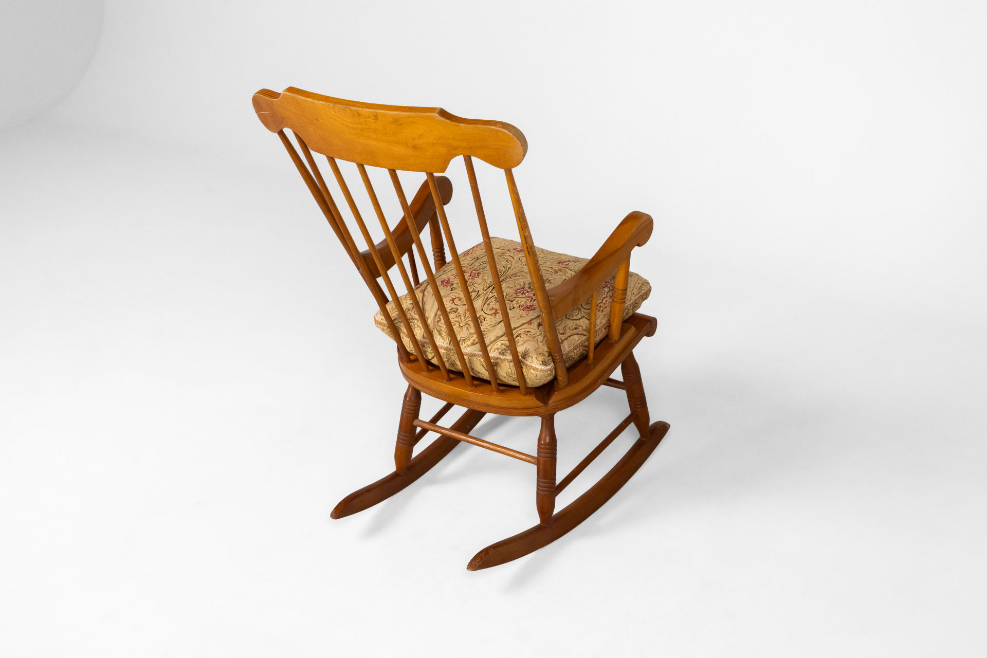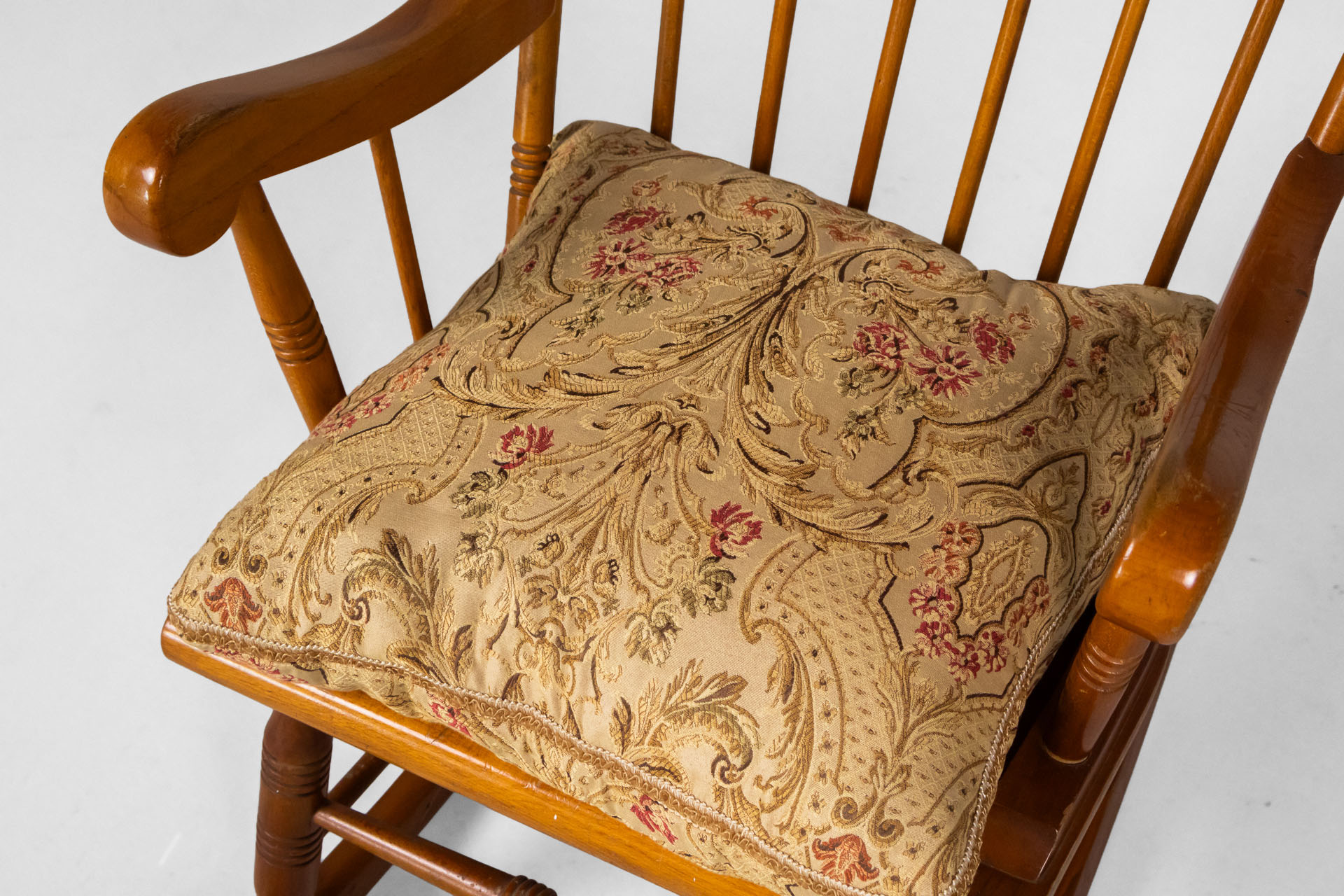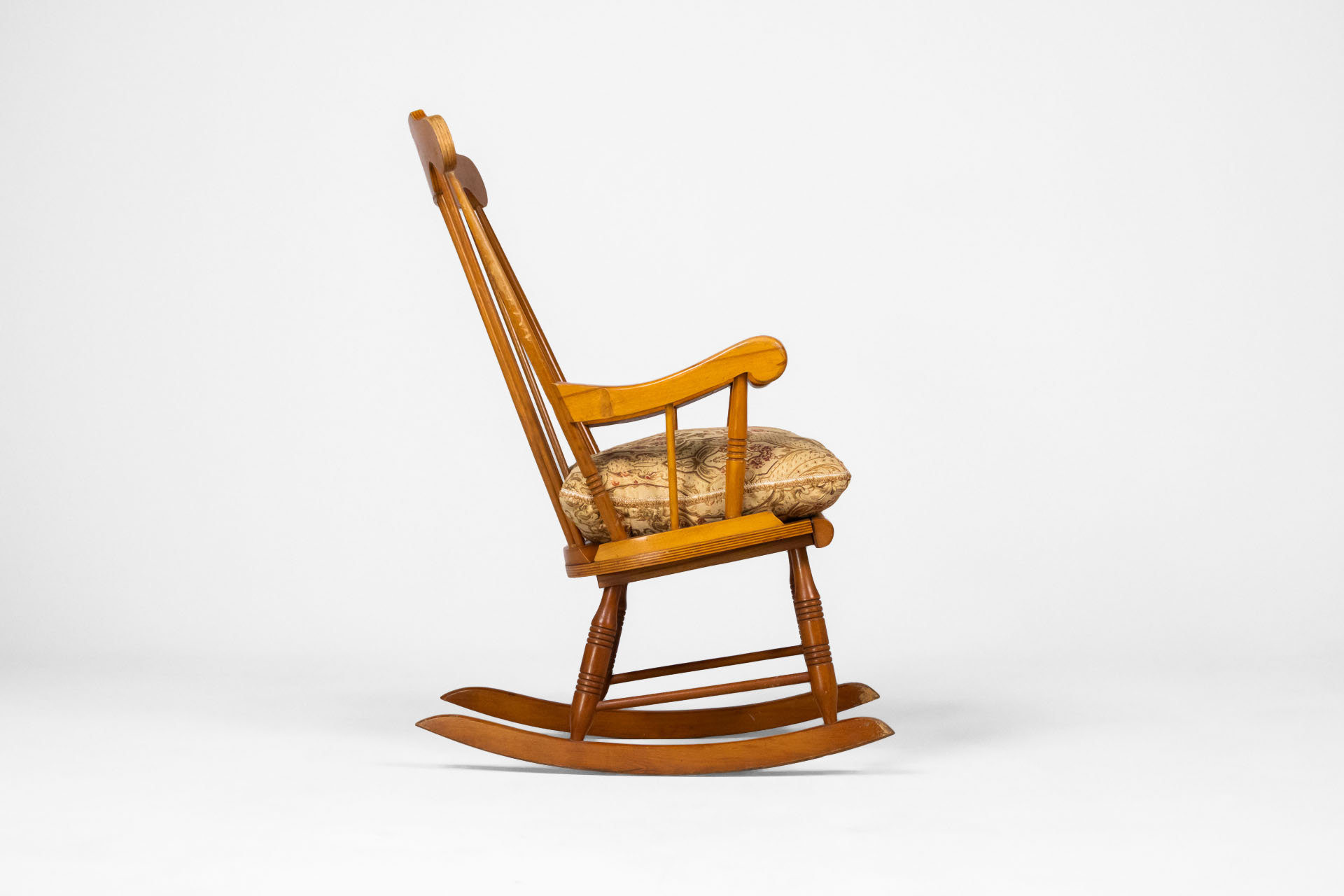 Fából készült, világosbarna szék, rózsaszín, mintás kárpittal a ülőfelületen és háttámlán