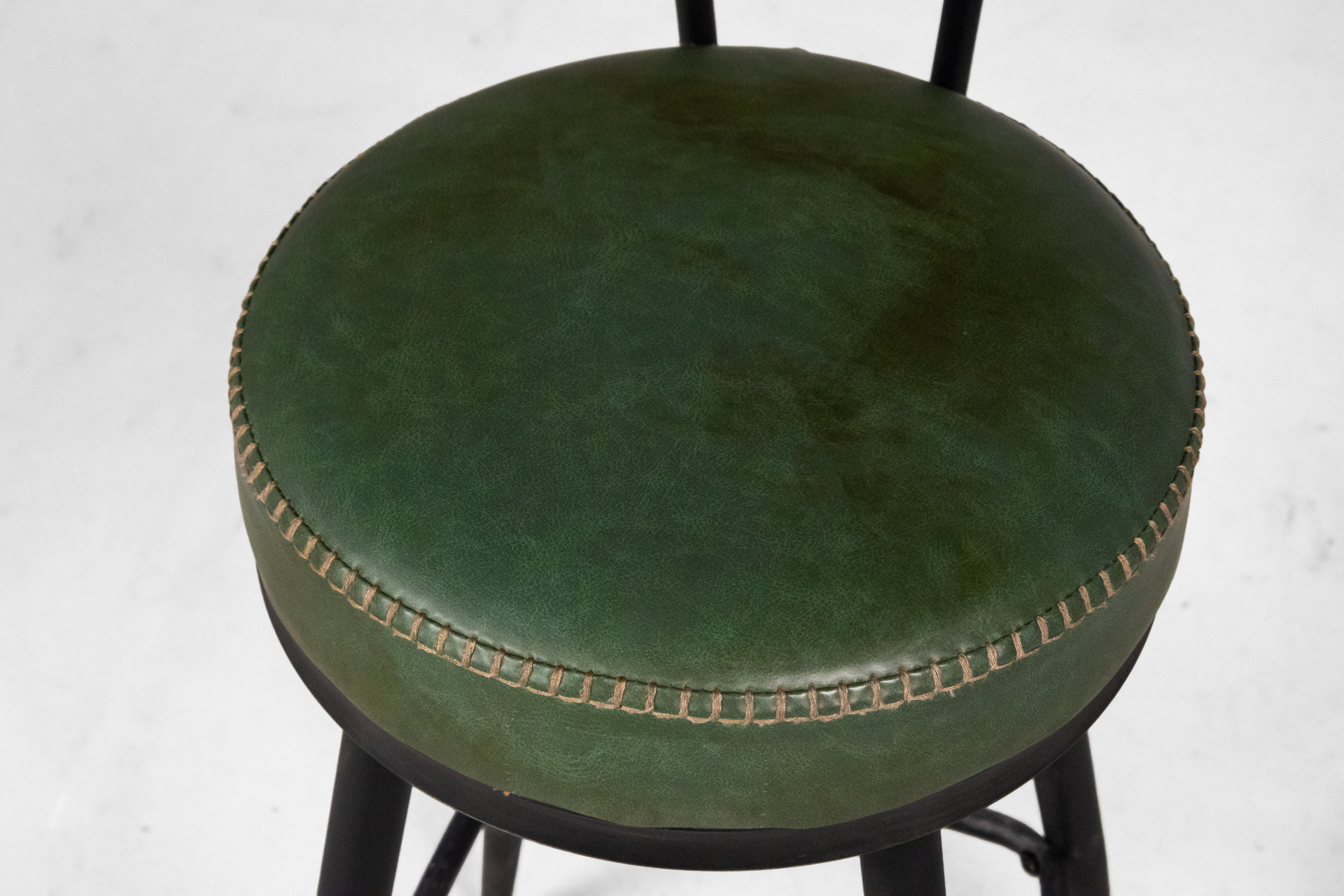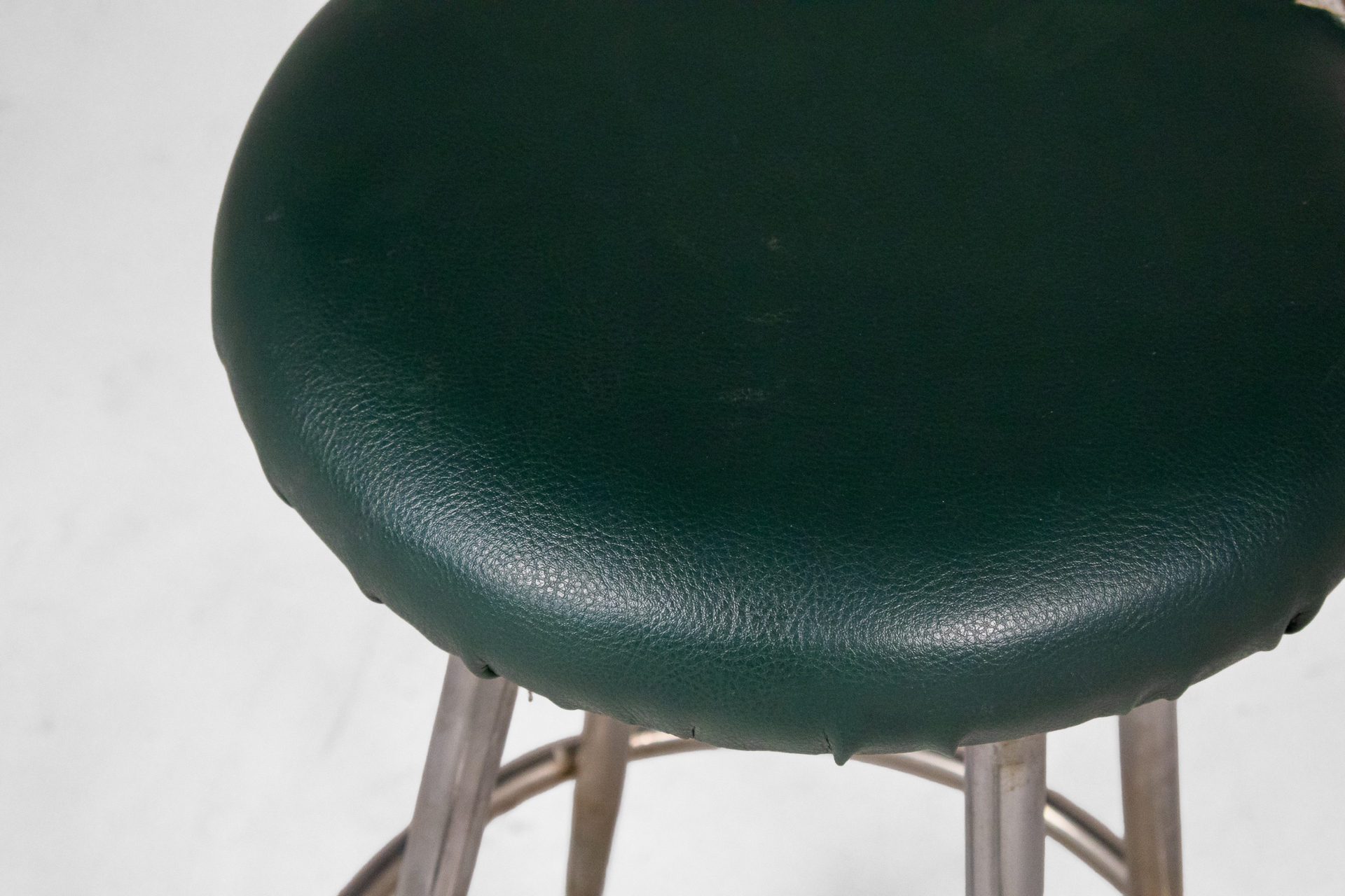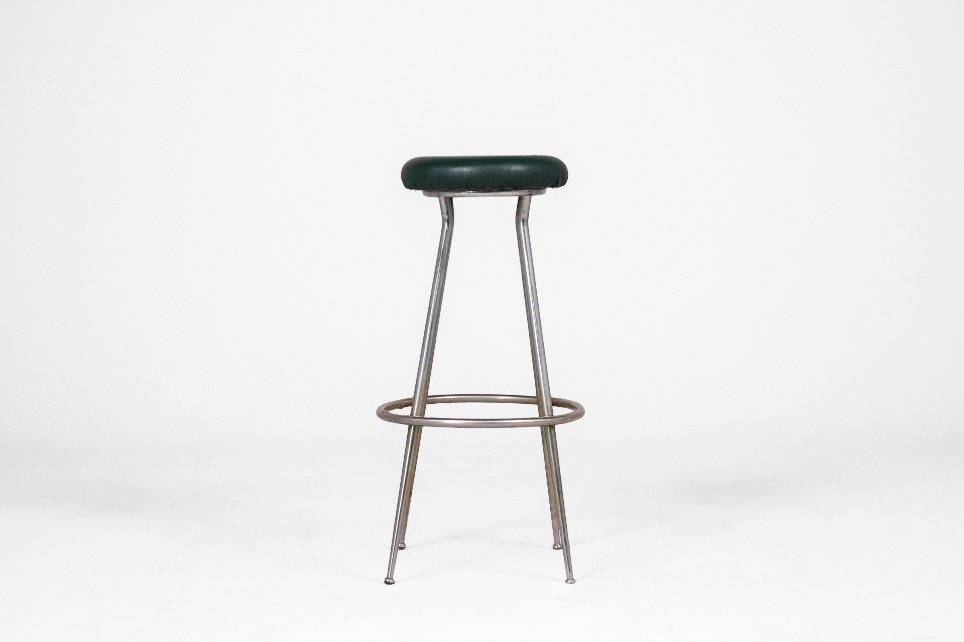 Kerek, sötétzöld műbőr ülőfelület, fémből készült, vékony lábakkal és kör alakú lábtartóval