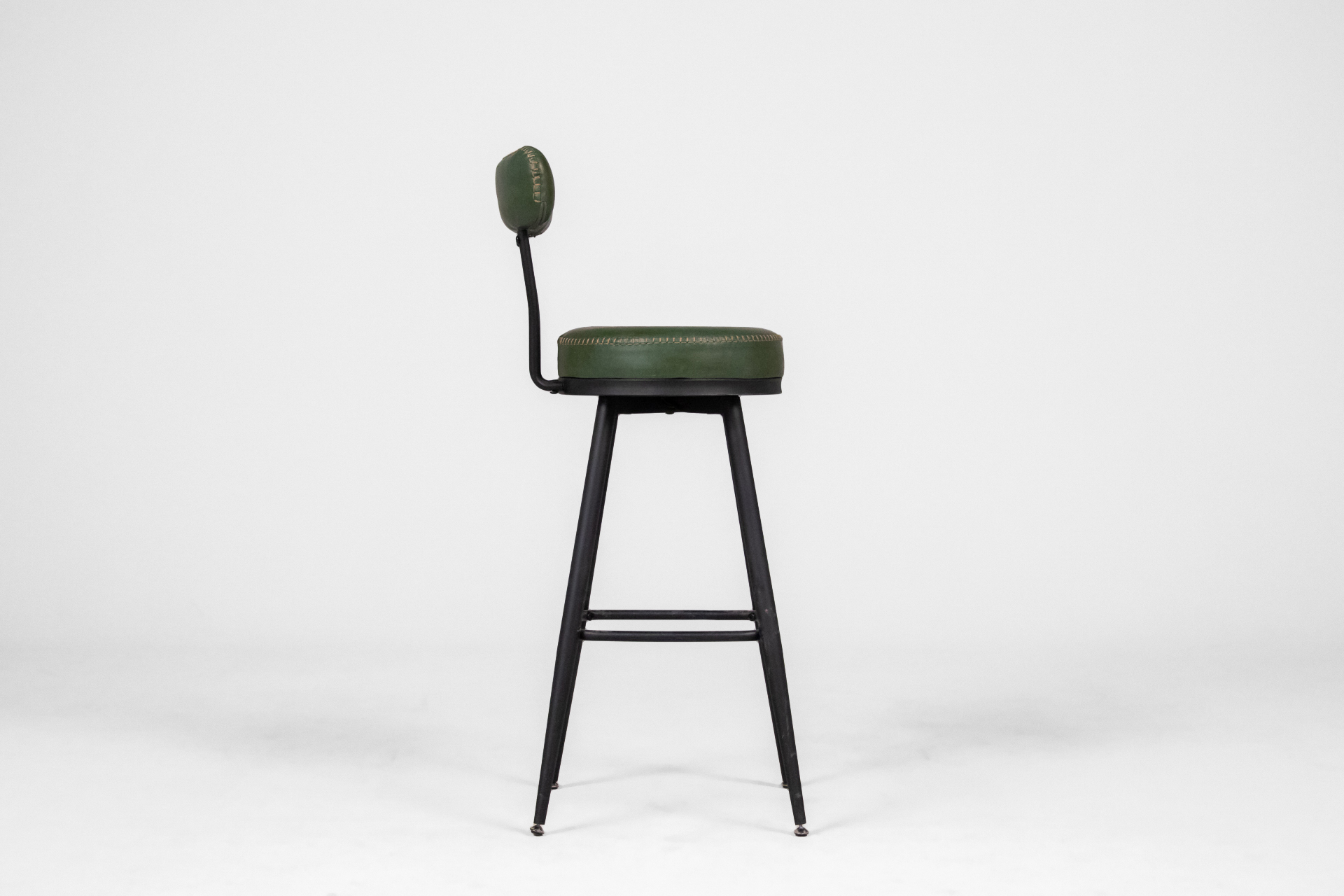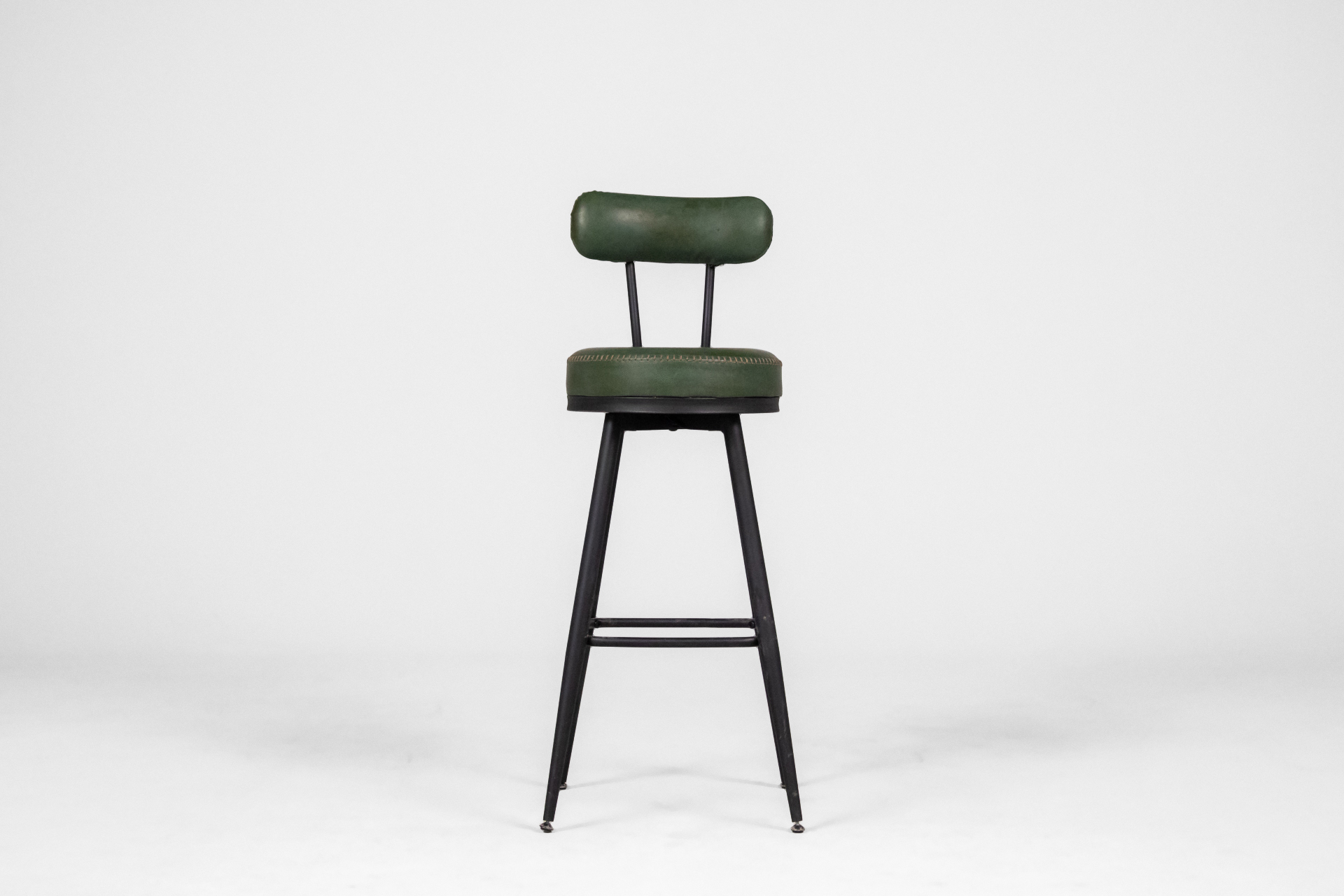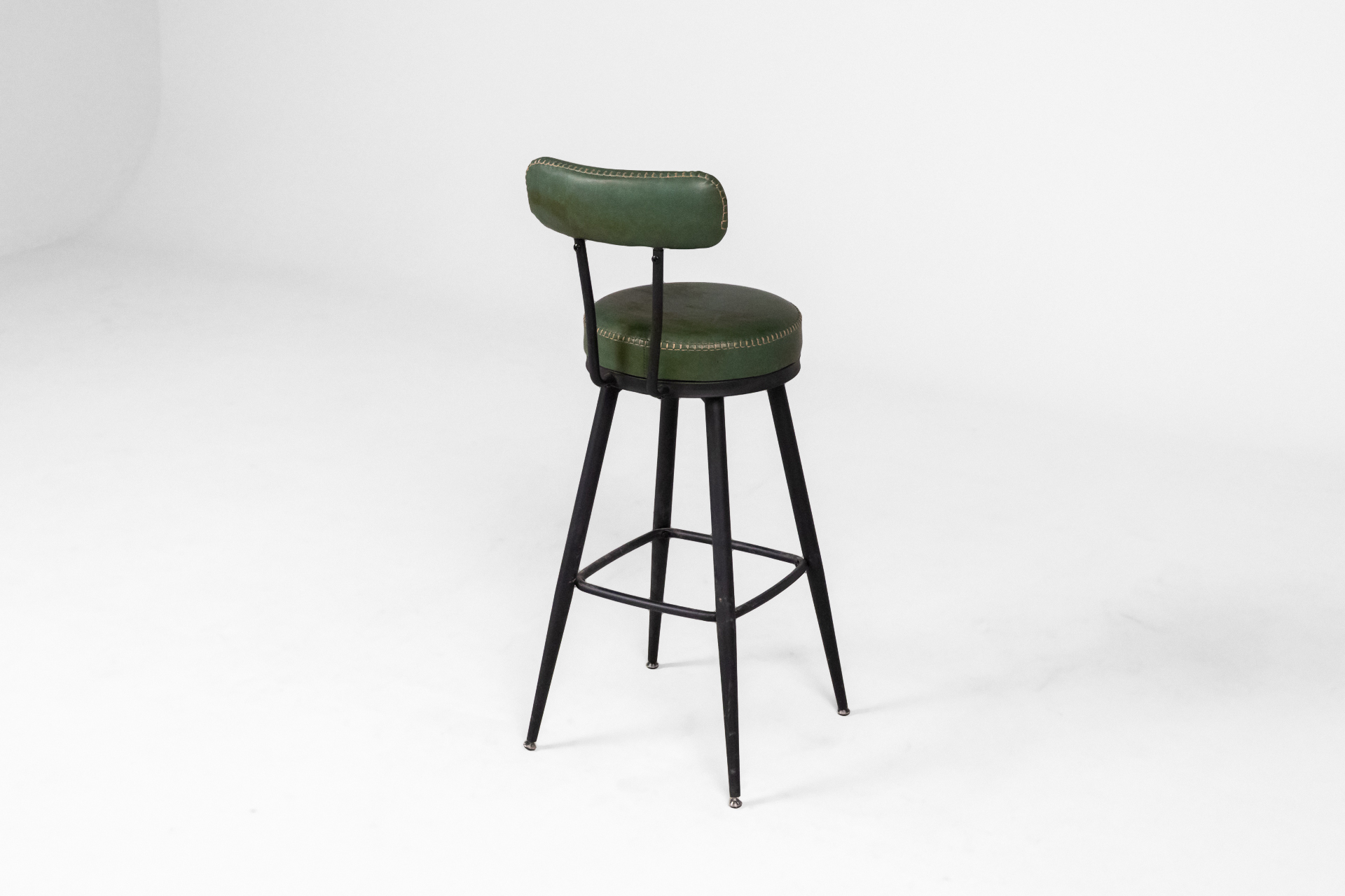 Kerek, sötétzöld műbőr ülőfelület, fémből készült, vékony lábakkal és kör alakú lábtartóval