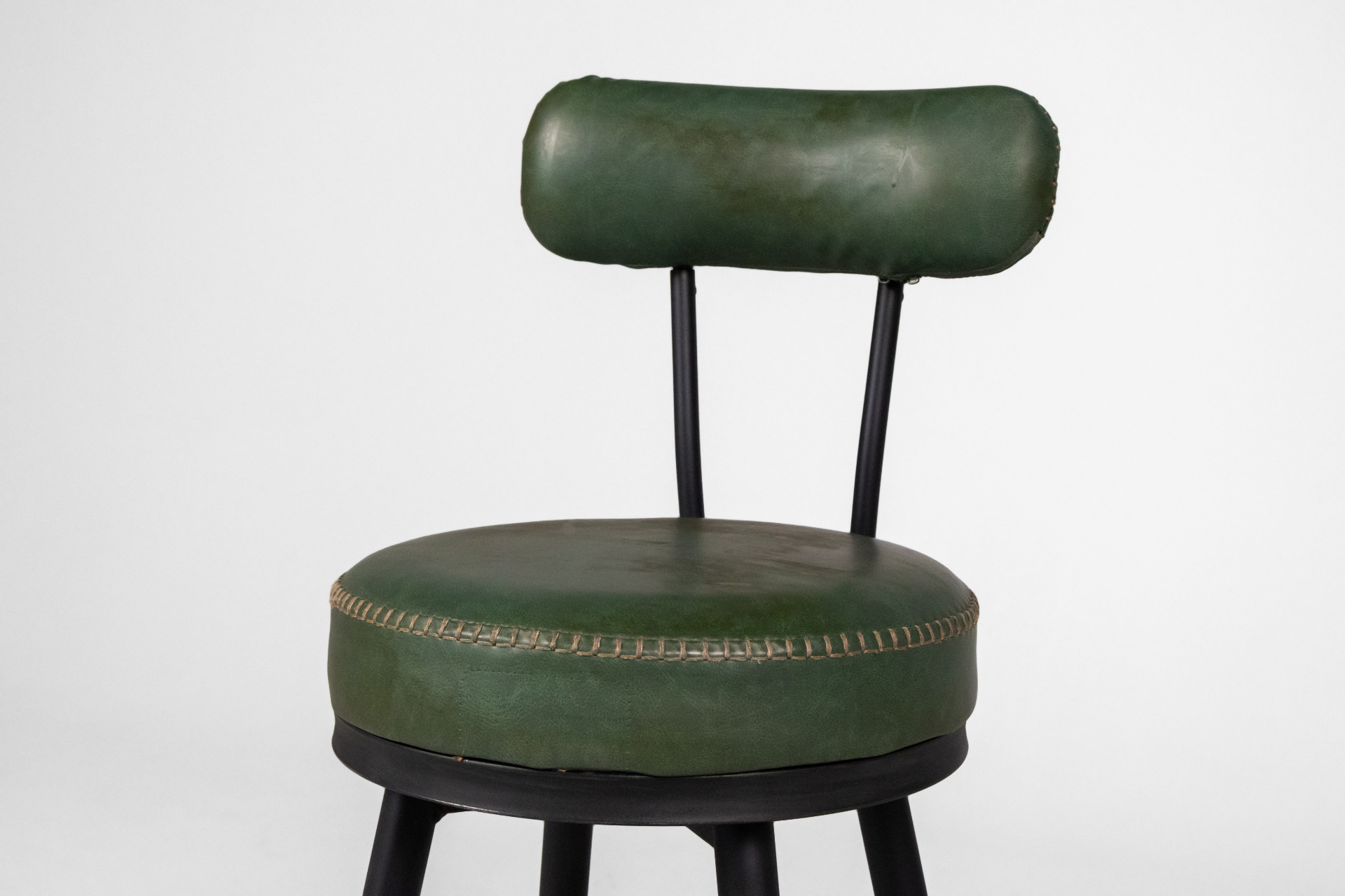 Kerek, zöld műbőr ülőfelület, fekete fém lábakkal és háttámlával