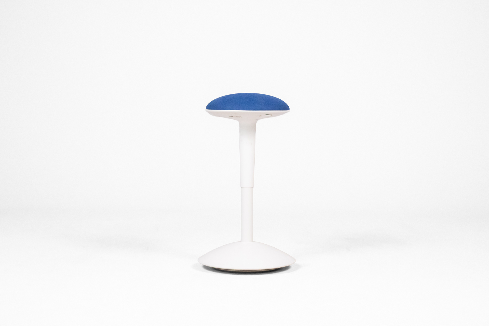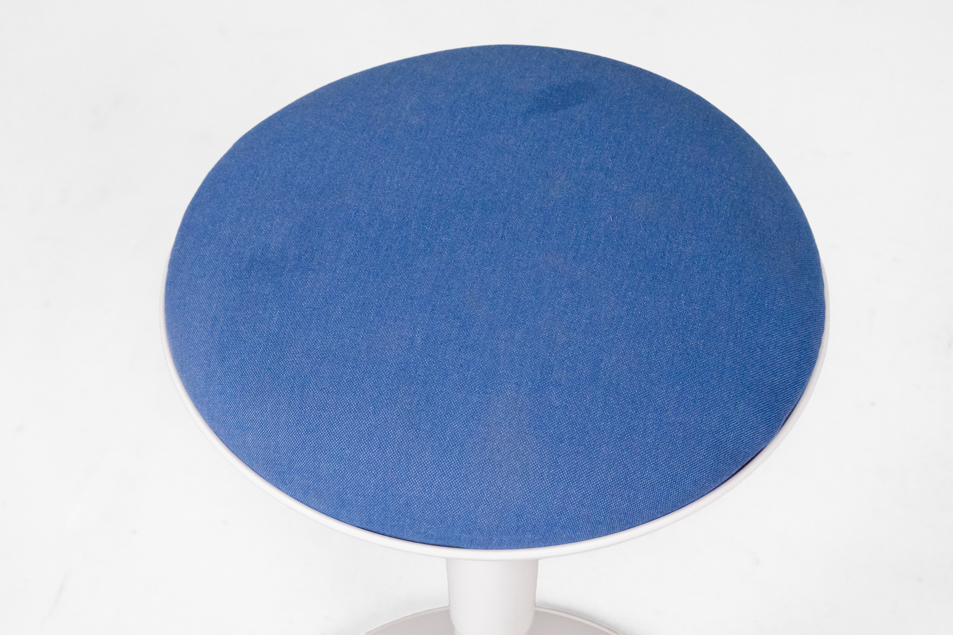 Kerek, kék szövet ülőfelület, fehér műanyag lábazattal és középső oszloppal