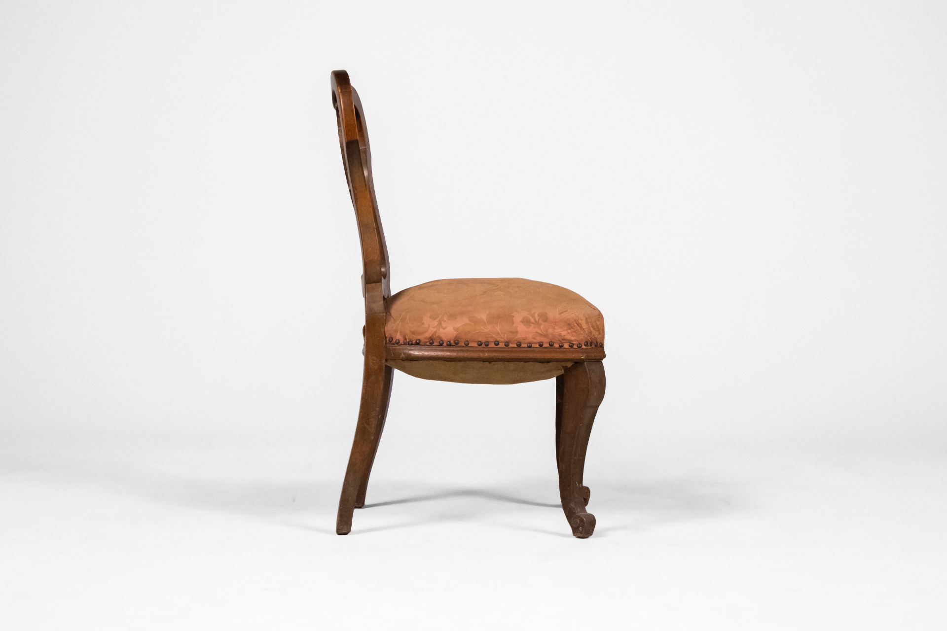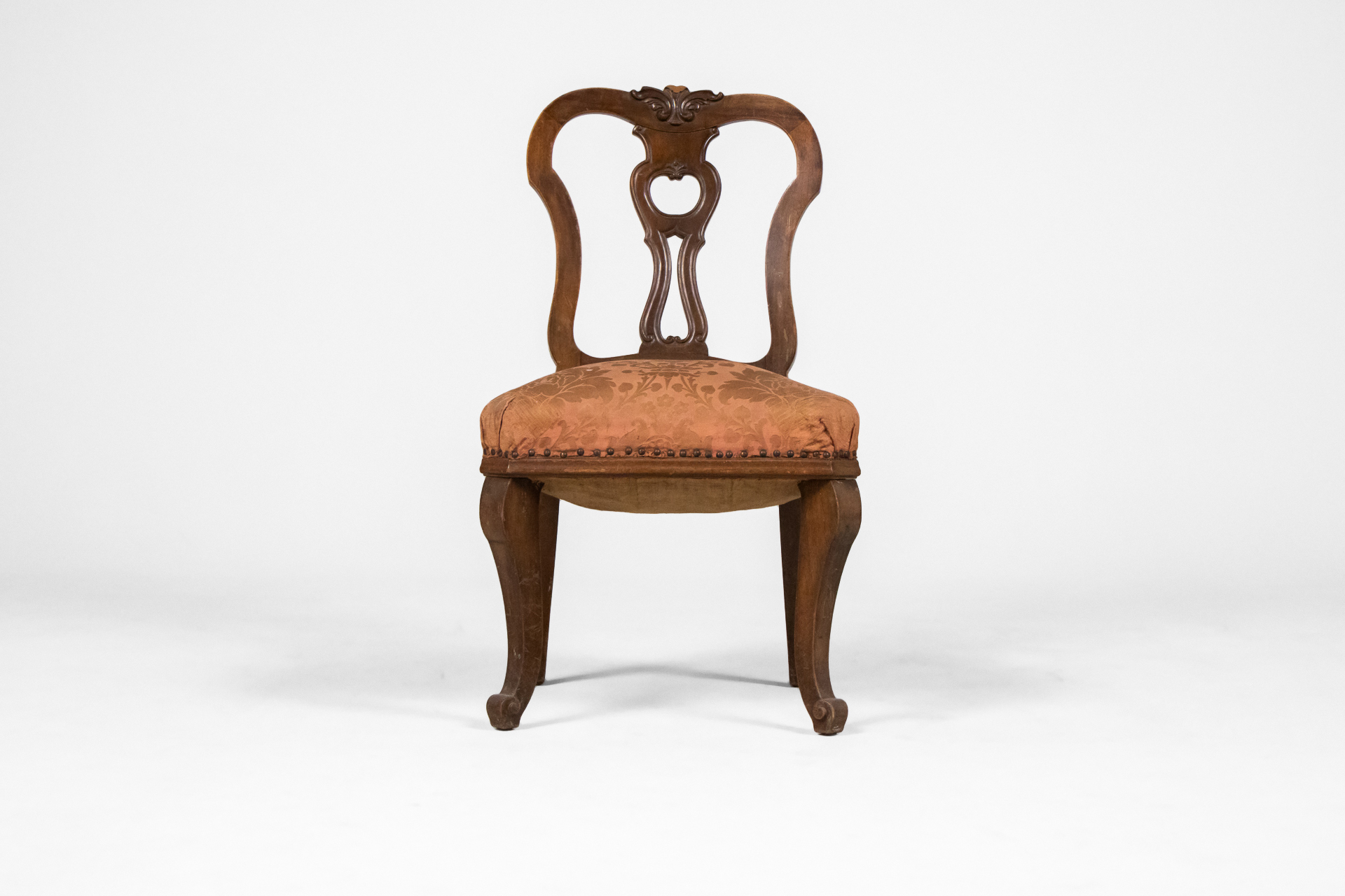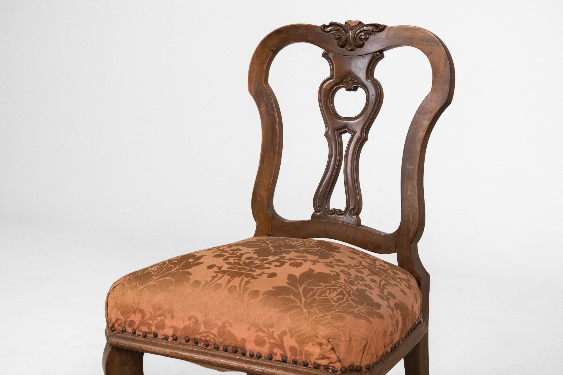 Antik stílusú, sötétbarna fa szék, díszített háttámlával és mintás, bézs szövet ülőrésszel