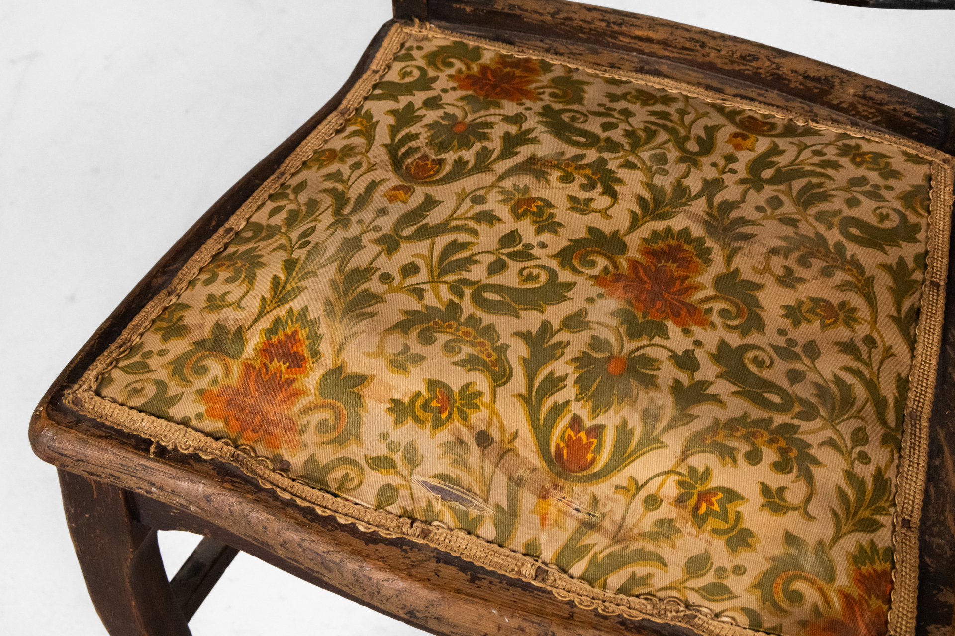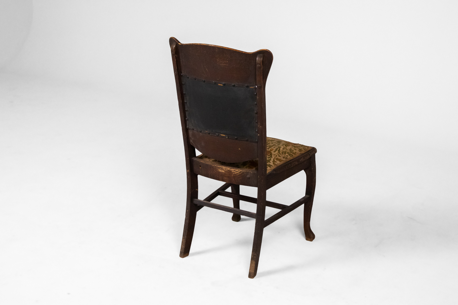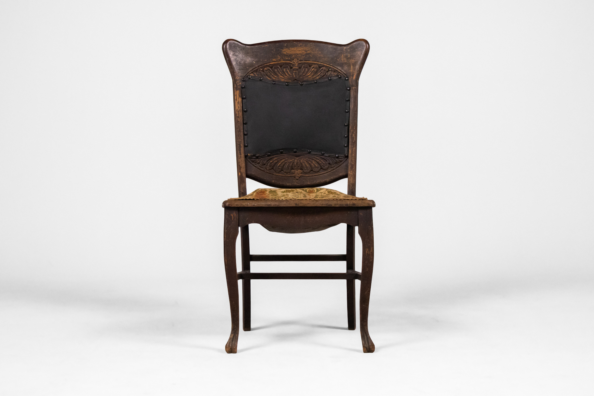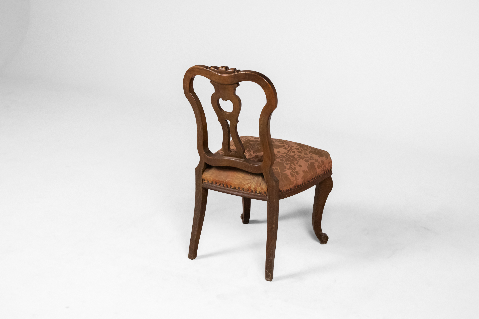Antik stílusú, sötétbarna fa szék, díszített háttámlával és mintás, bézs szövet ülőrésszel