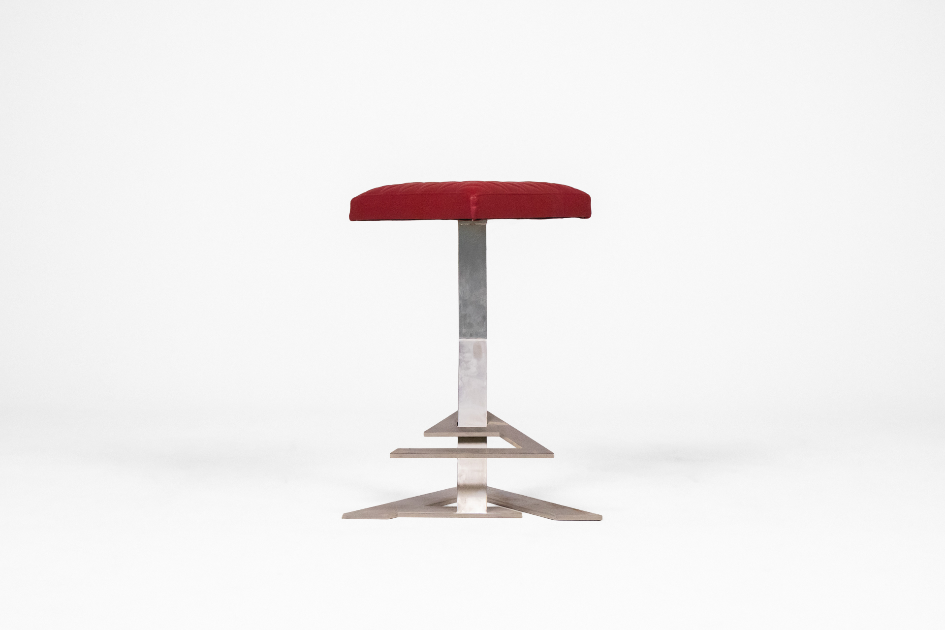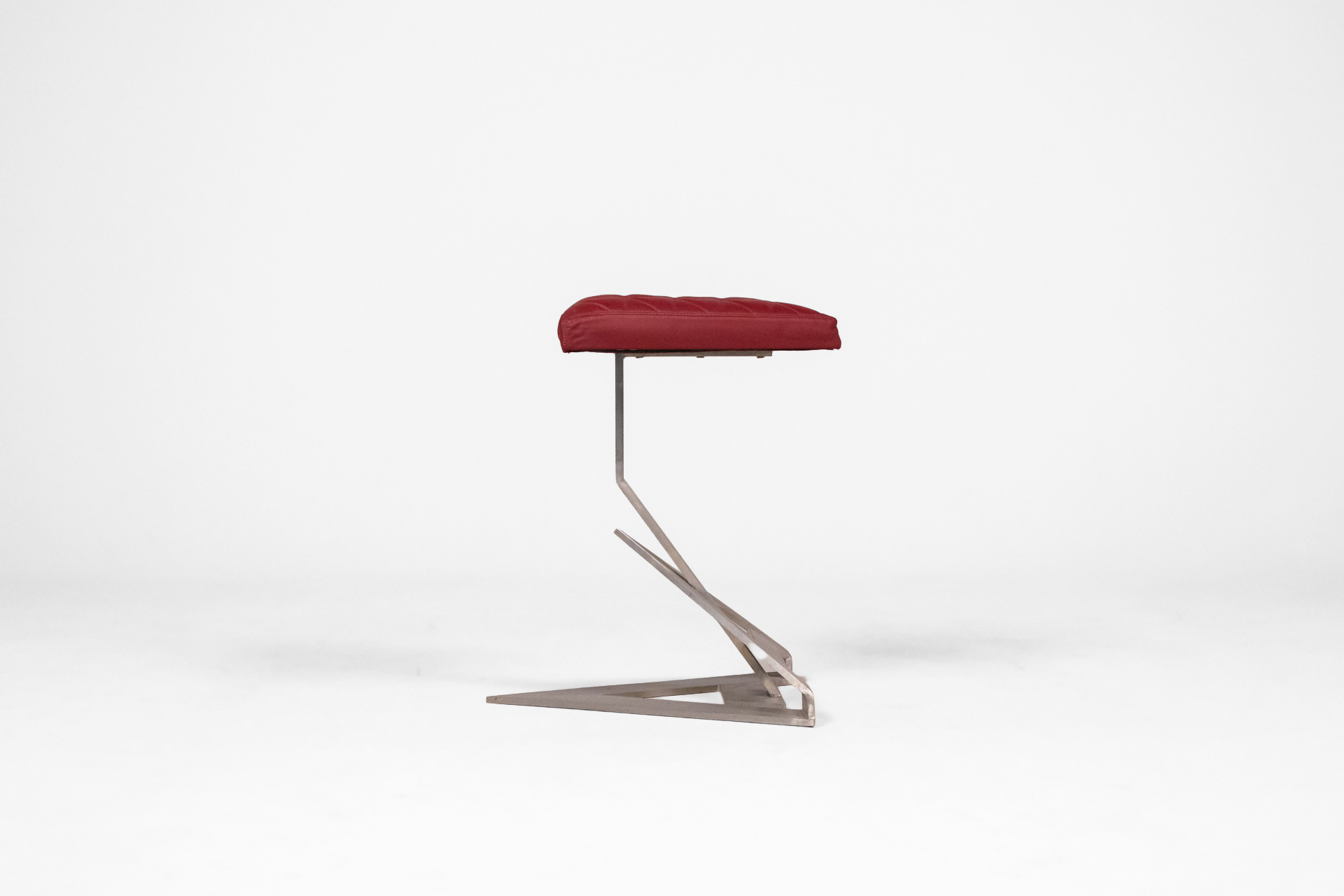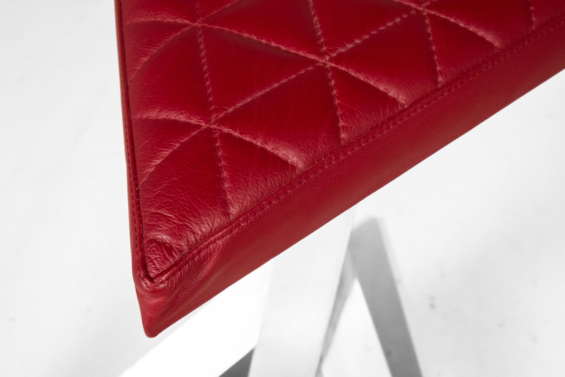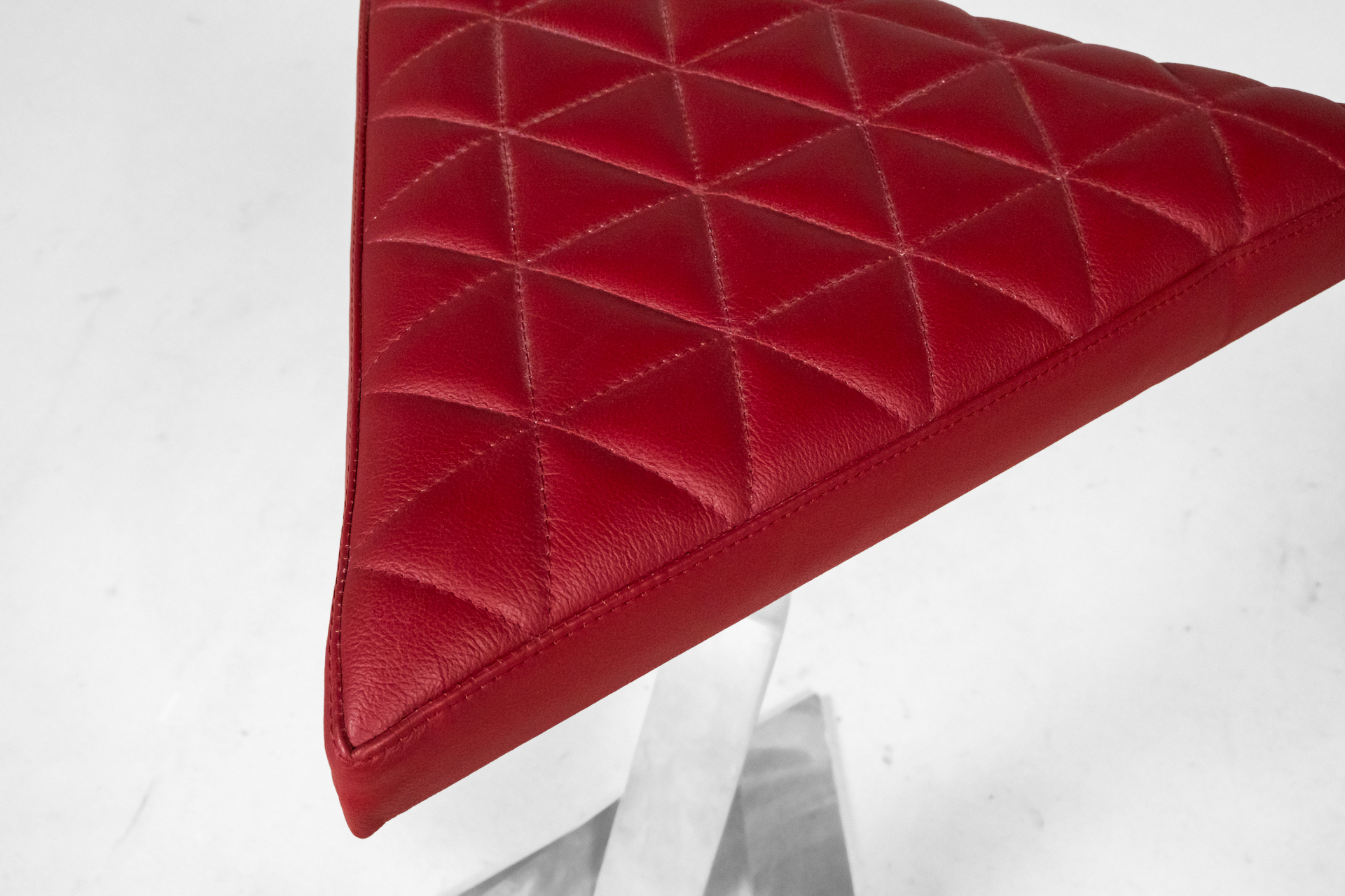 Háromszögű, piros, steppelt textil ülőfelület, fényes fém lábazattal