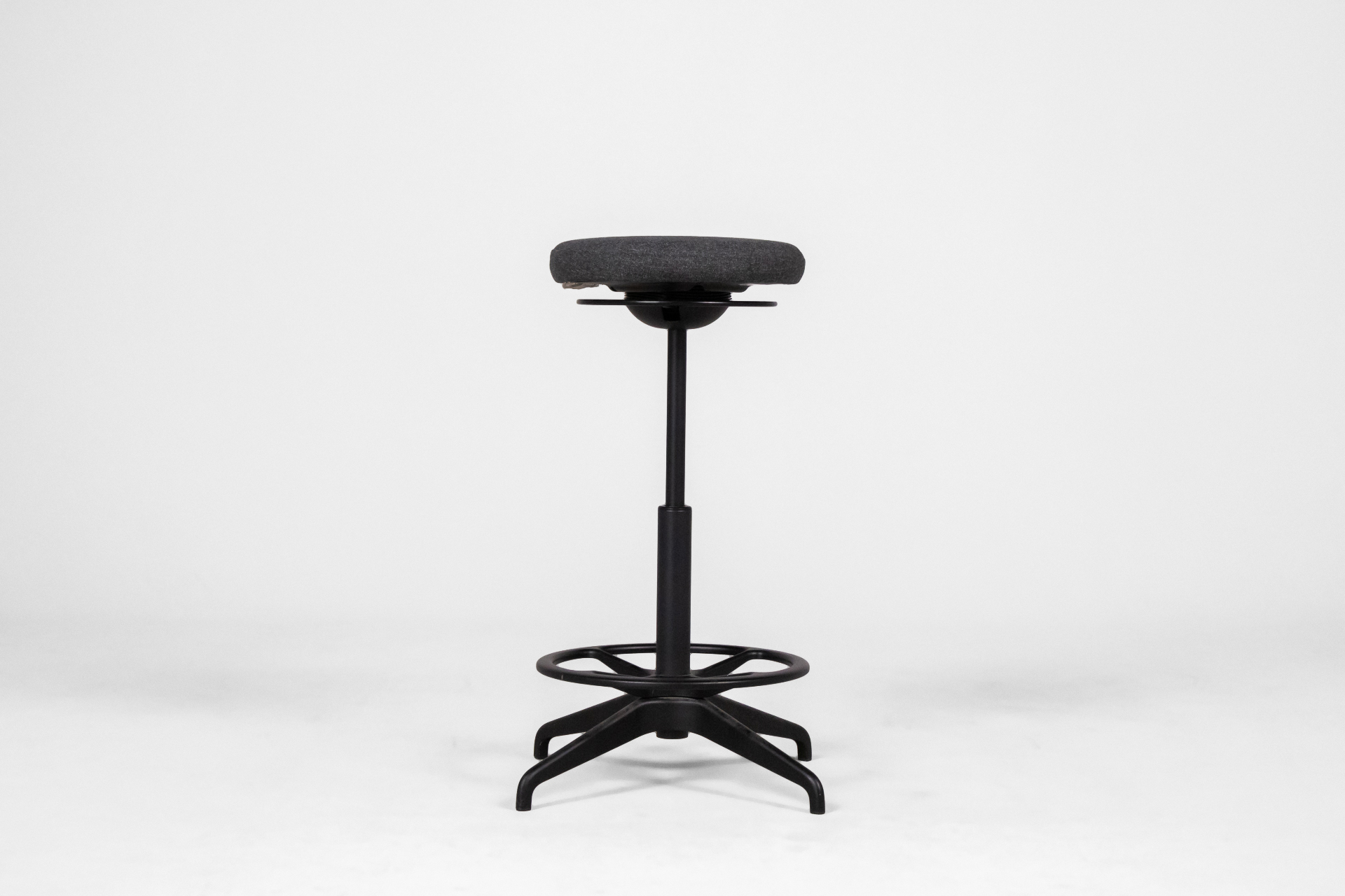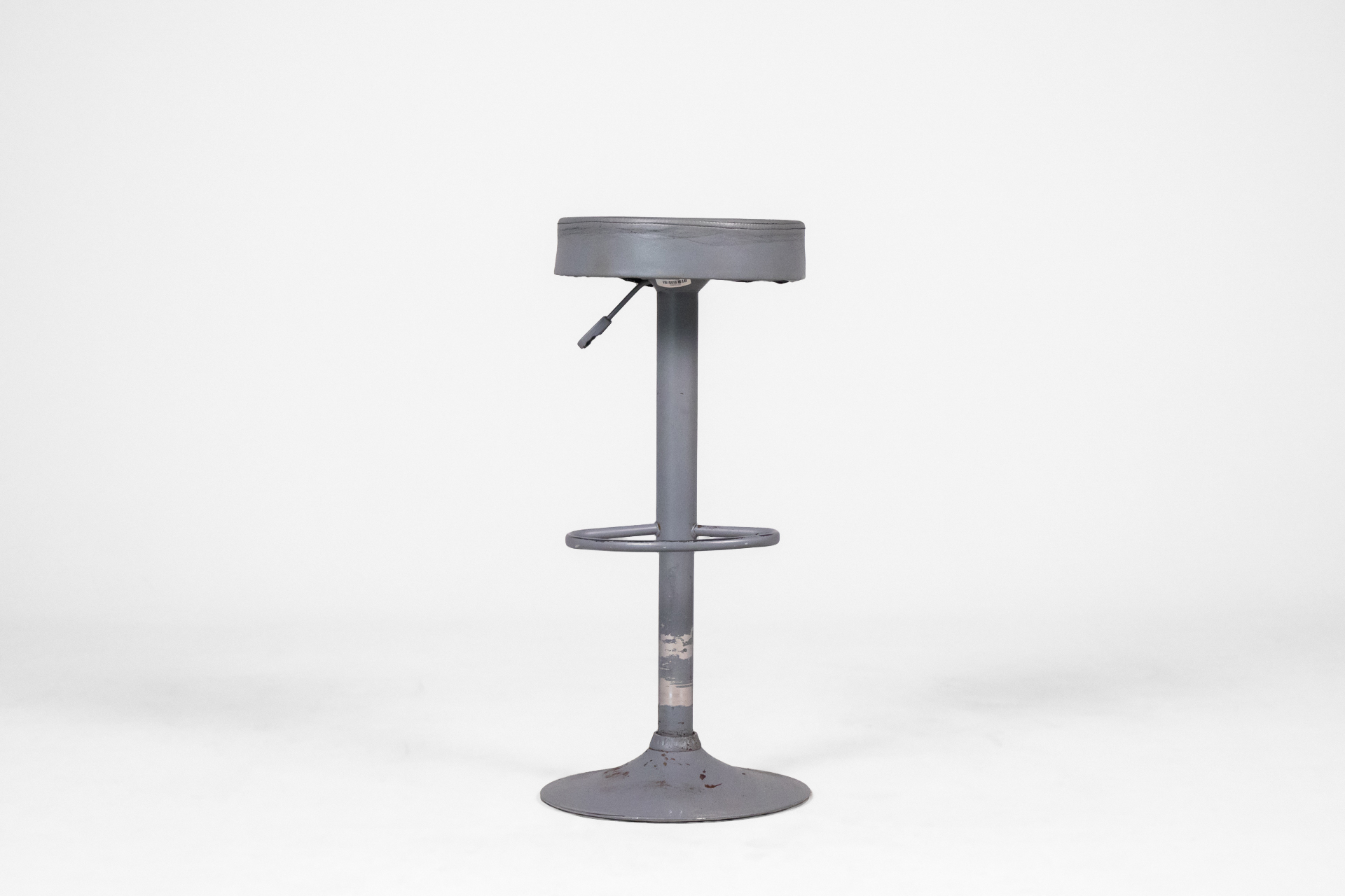 Kerek, szürke fém ülőke, állítható magasságú, kör alaplappal és lábtartóval