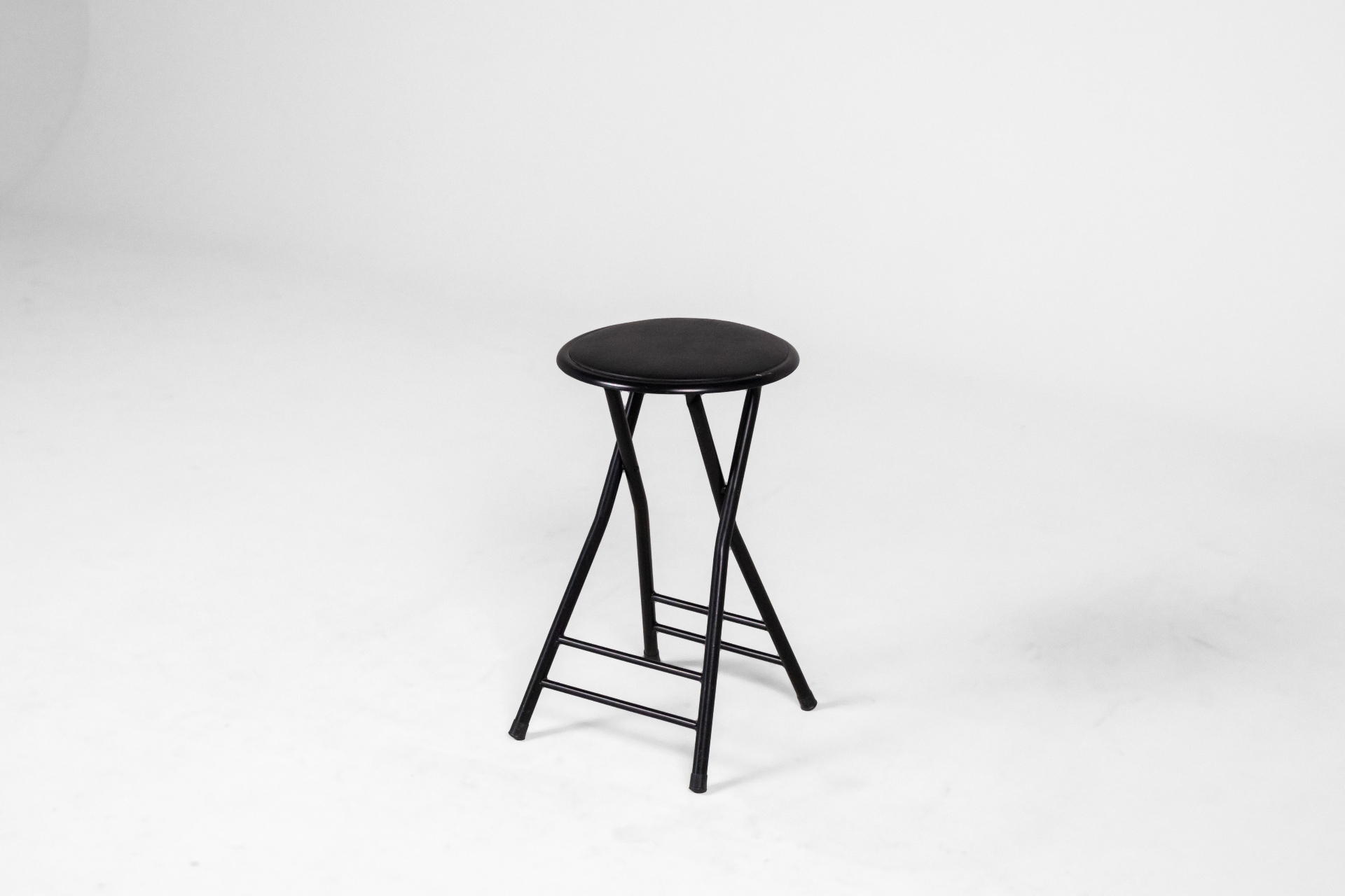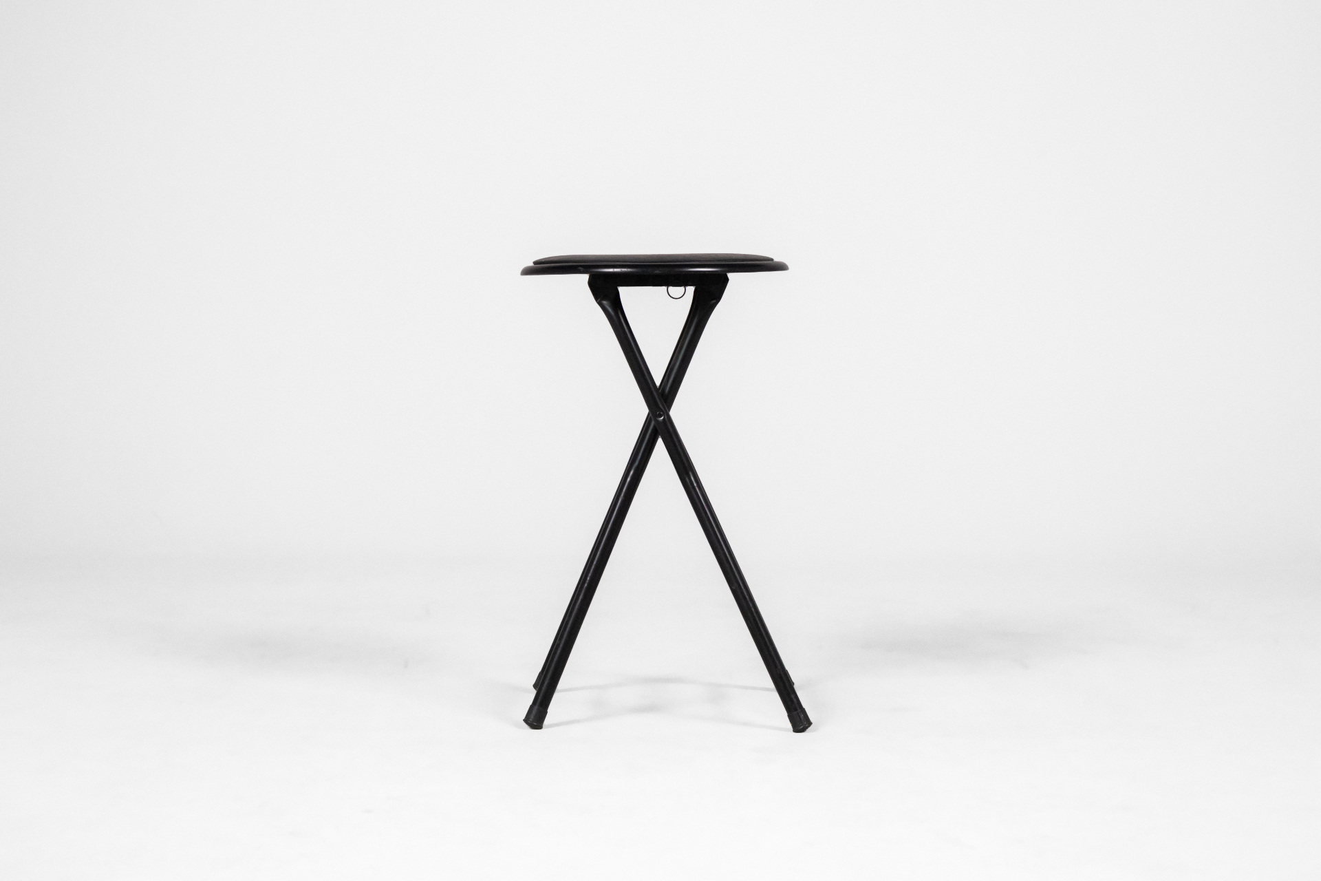 Kerek, fekete ülőfelület, vékony fém lábakon, összecsukható kialakítás