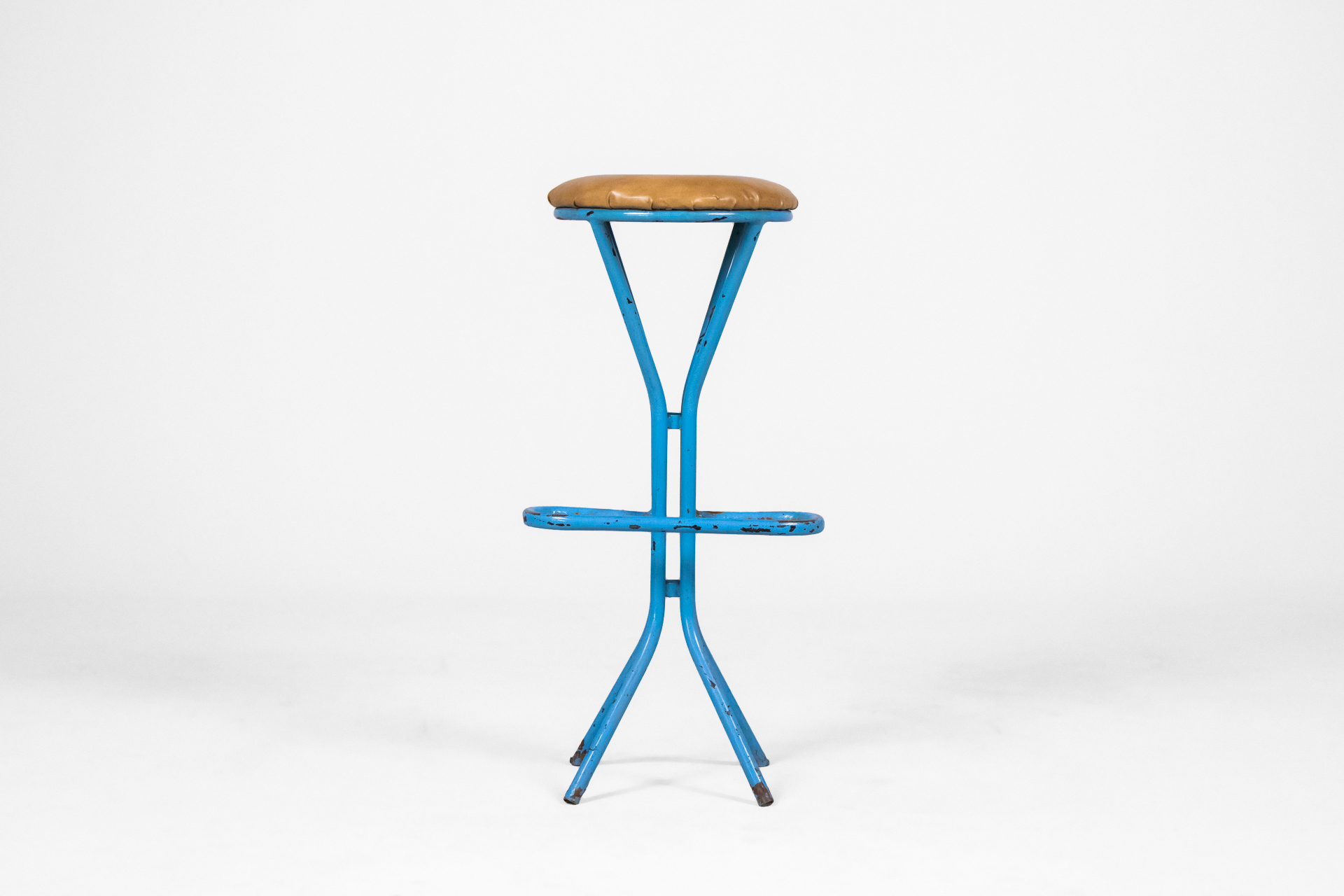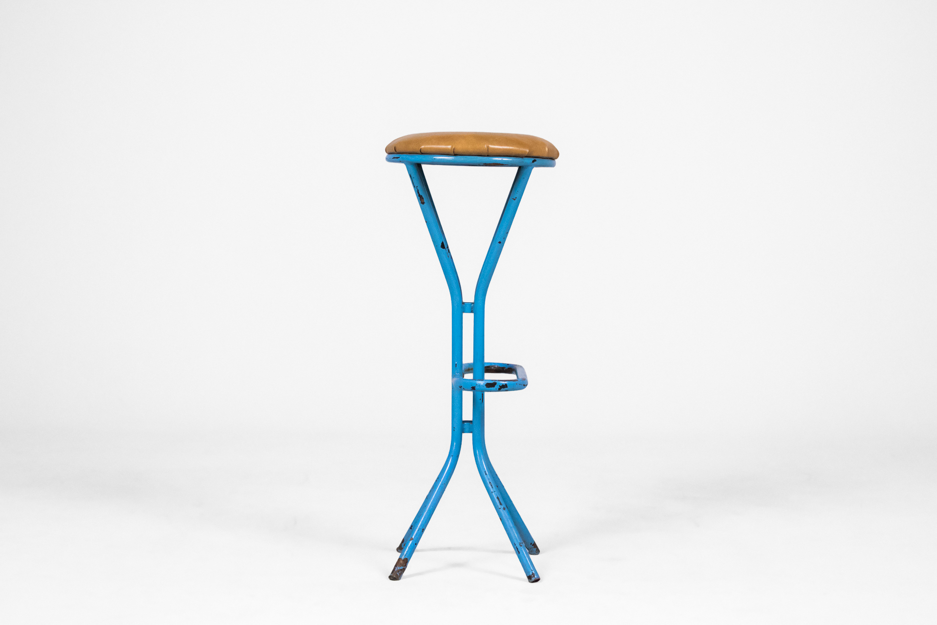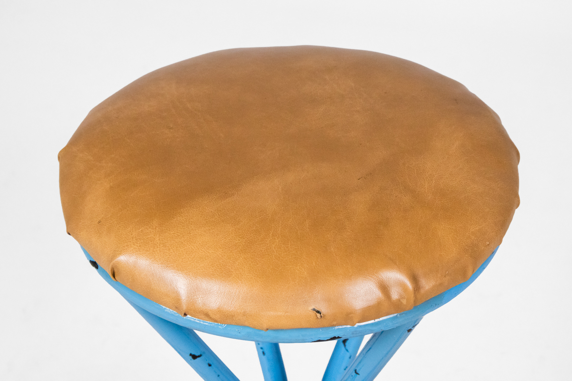 Kerek, világosbarna bőrkárpitozású ülőfelület, kék fém vázzal és ívelt lábakkal