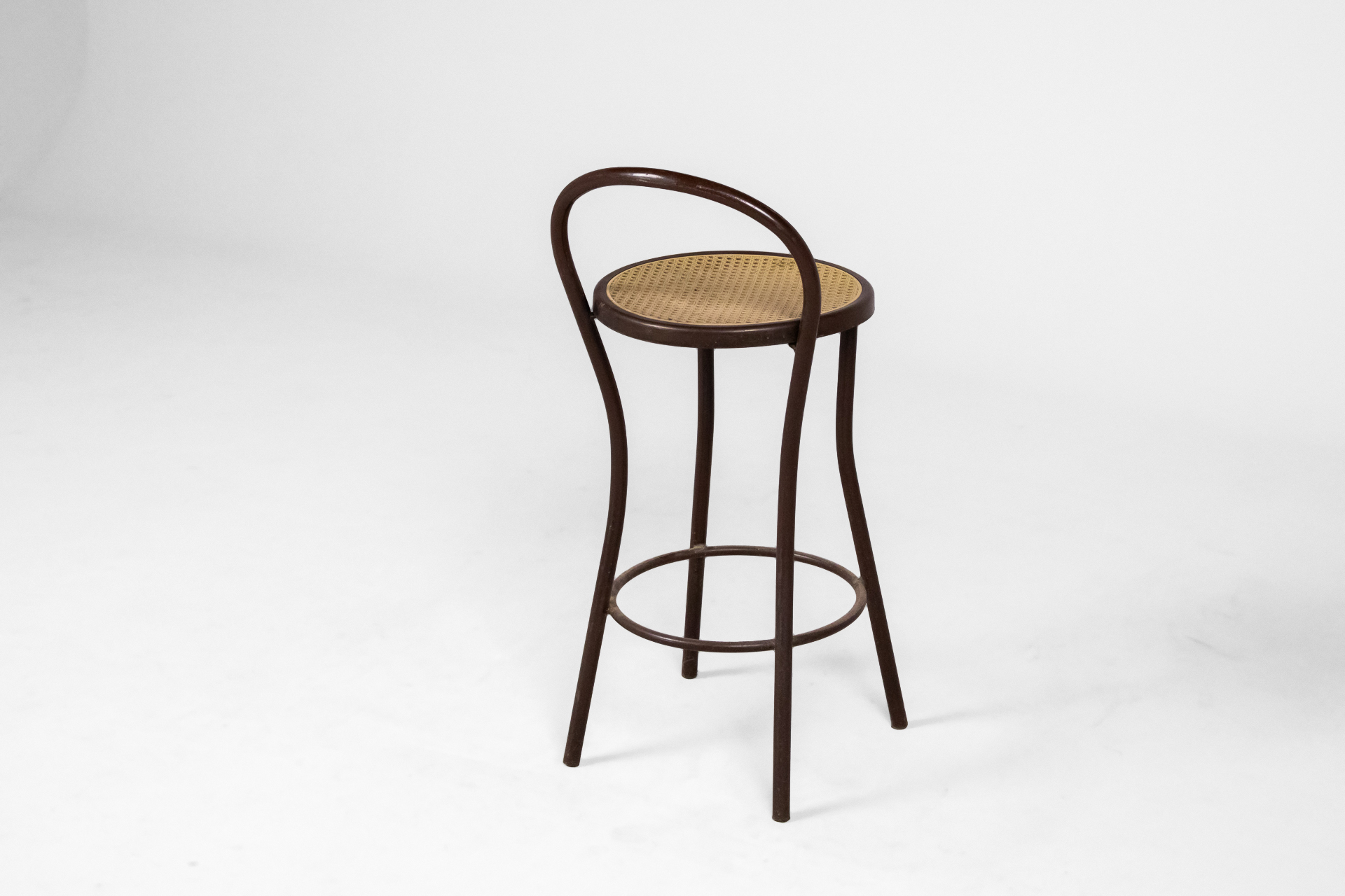Henger alakú, sötétbarna fém vázzal, fonott rattan ülőfelülettel és ívelt háttámlával