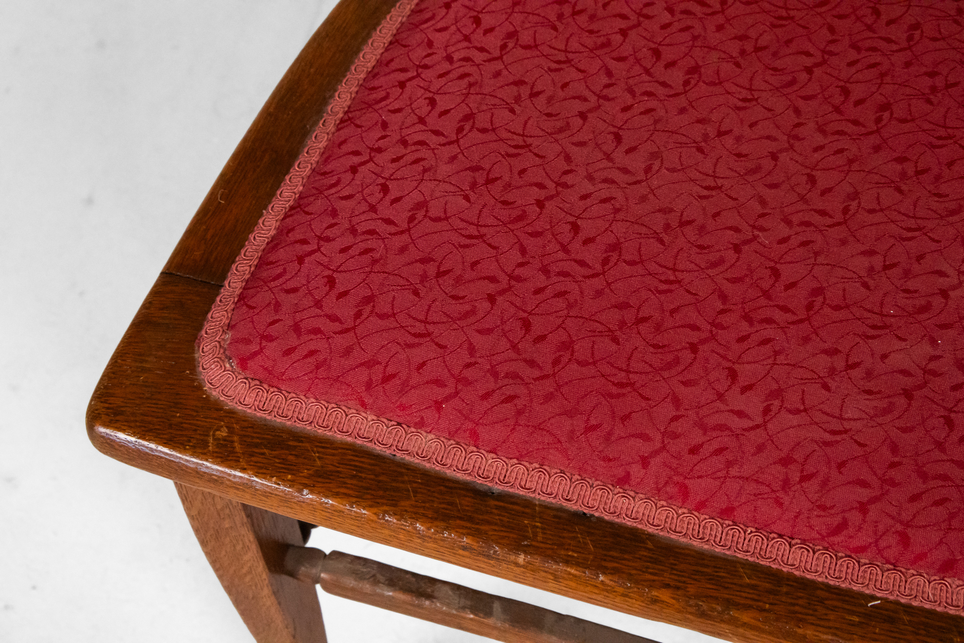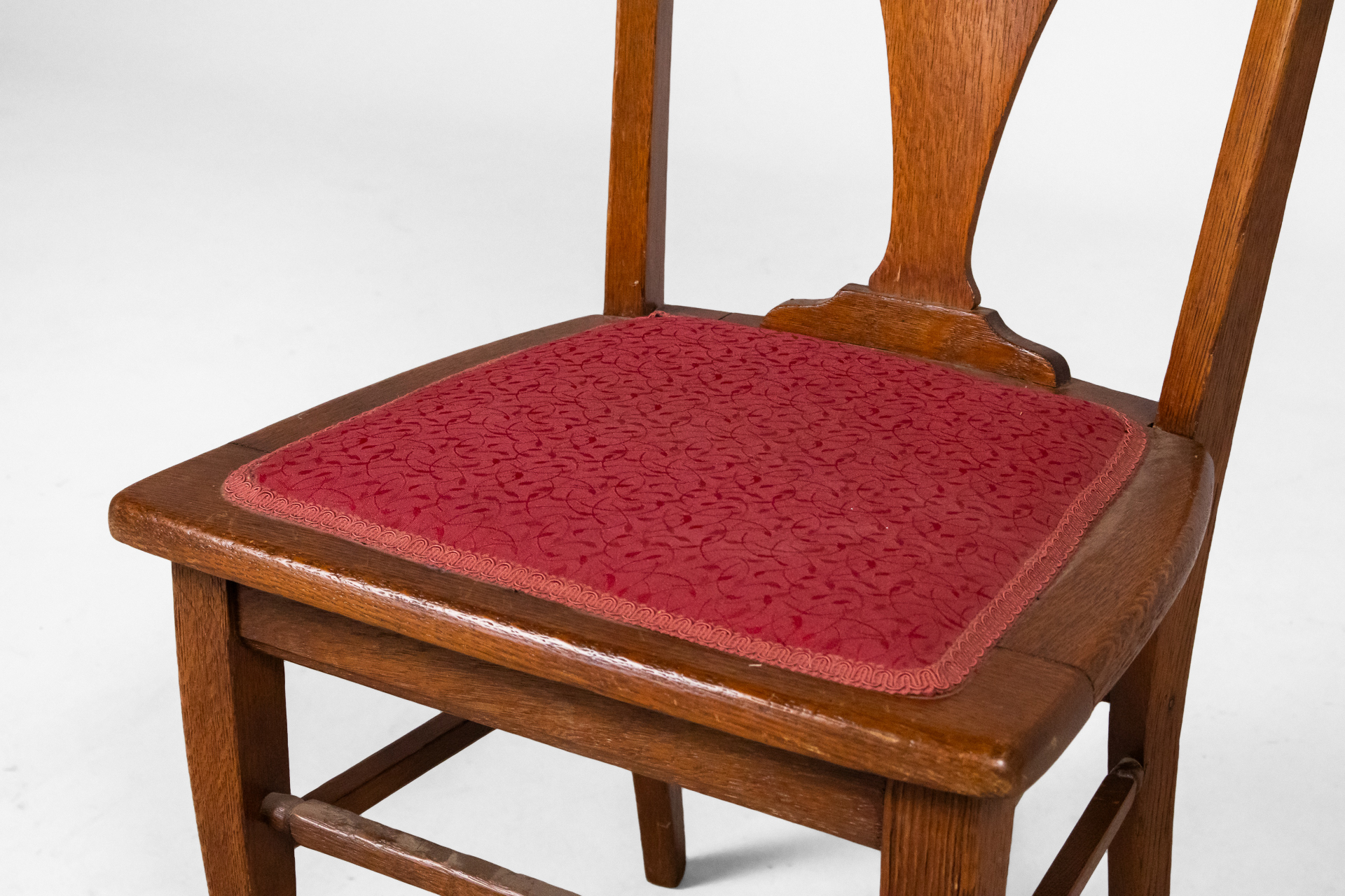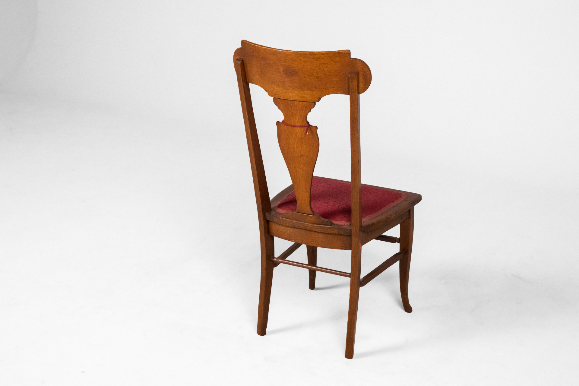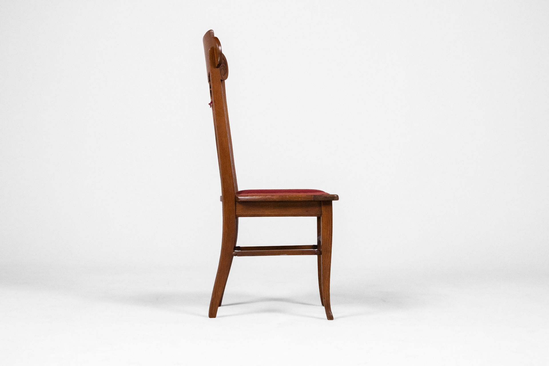 Fából készült, világosbarna szék, ívelt háttámlával és bordó kárpitozott ülőrésszel