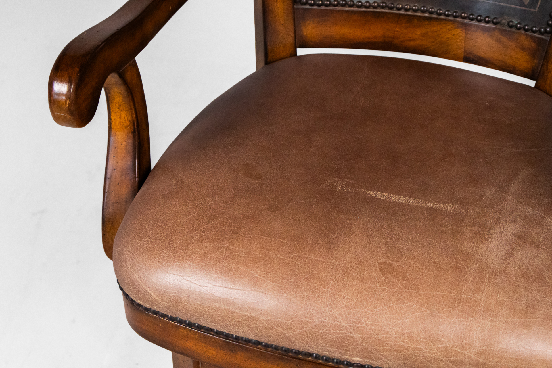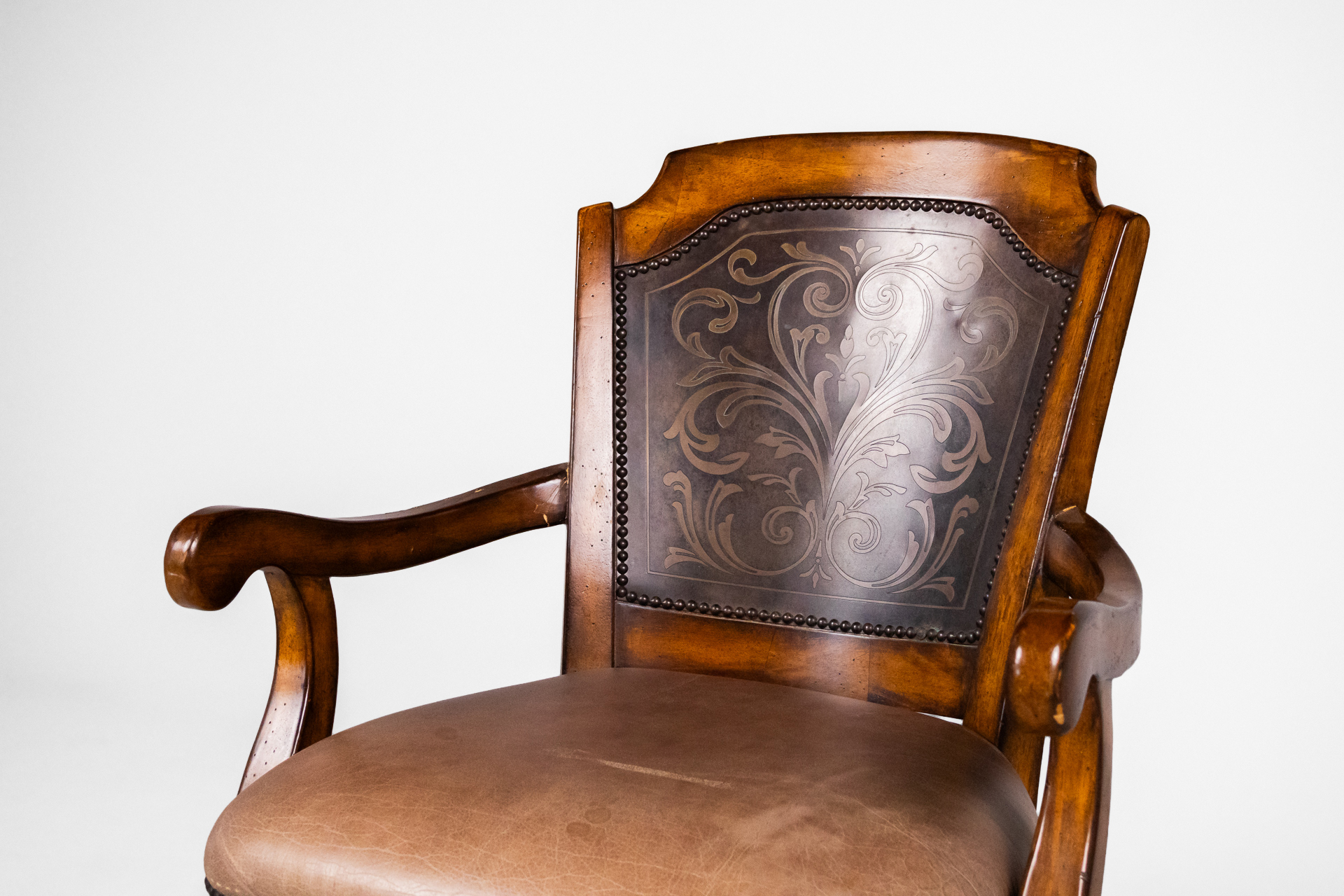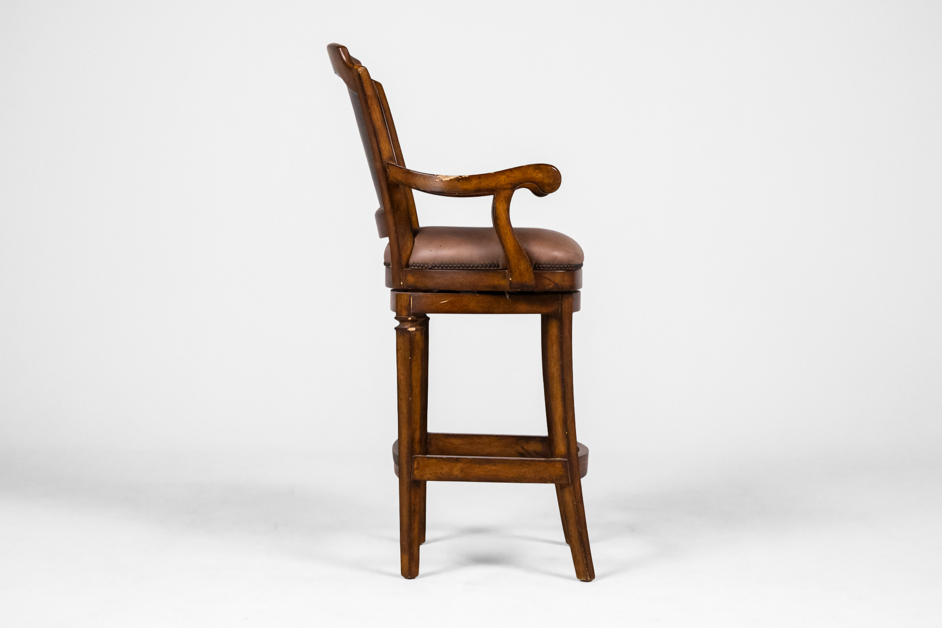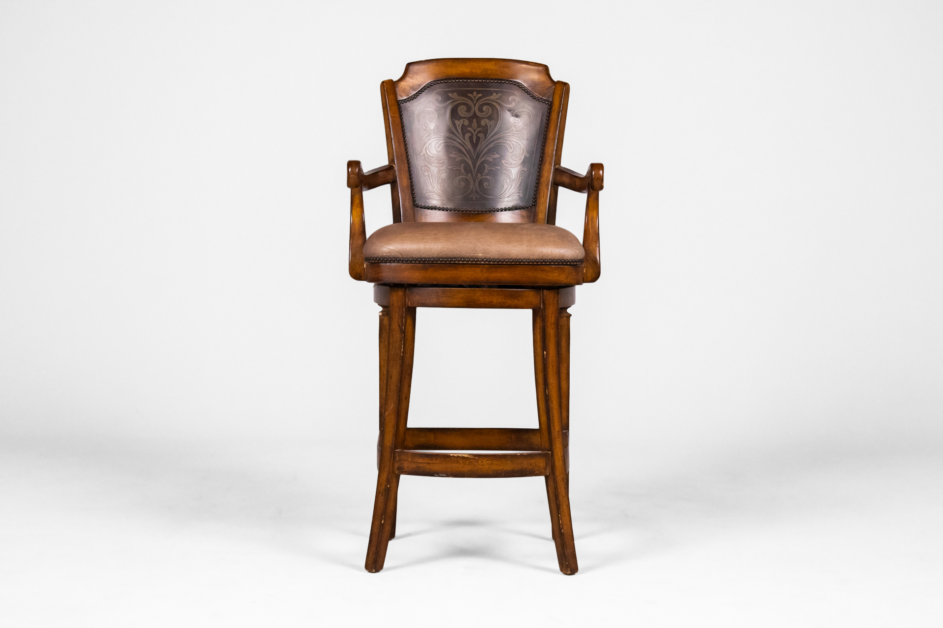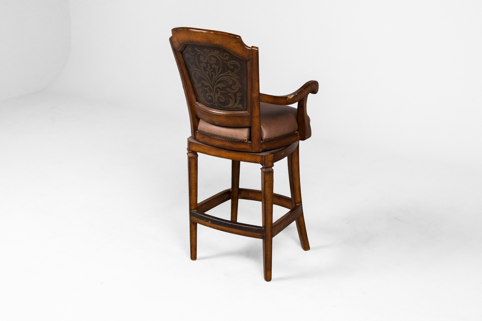 Magas, barna fa bárszék, bőrkárpitozással és díszített háttámlával