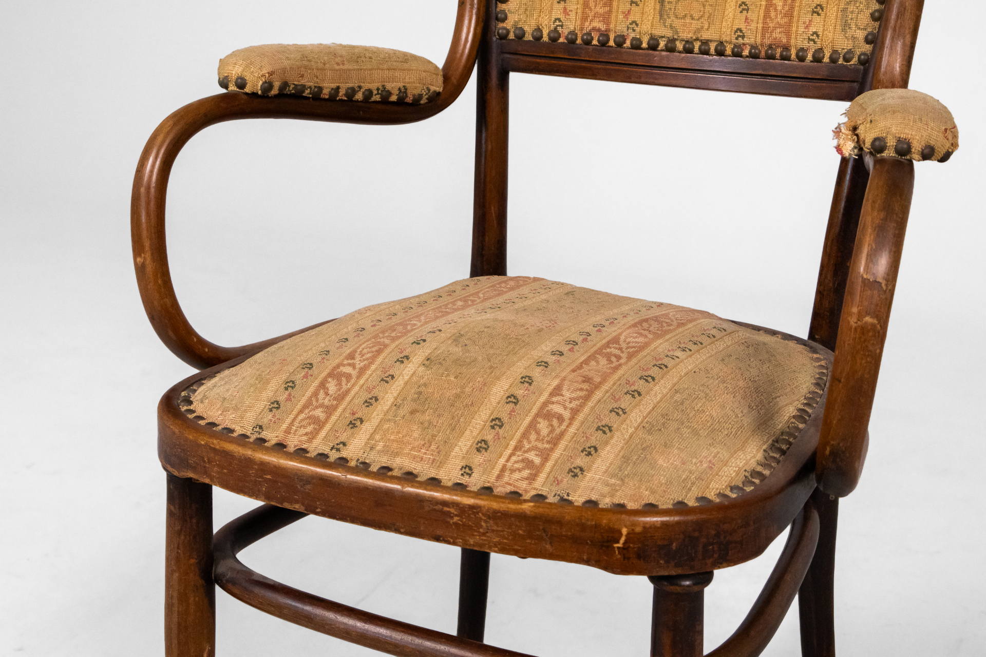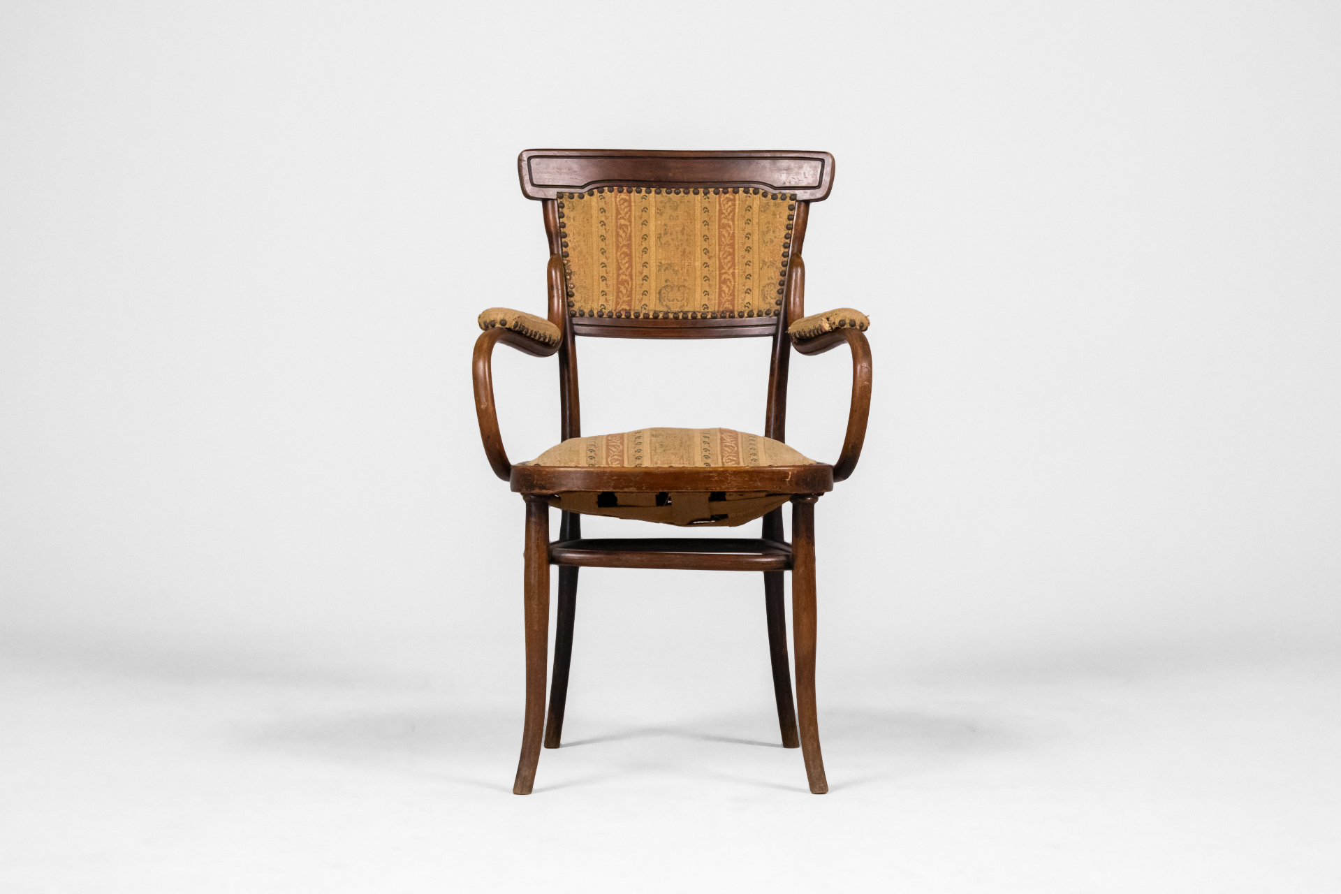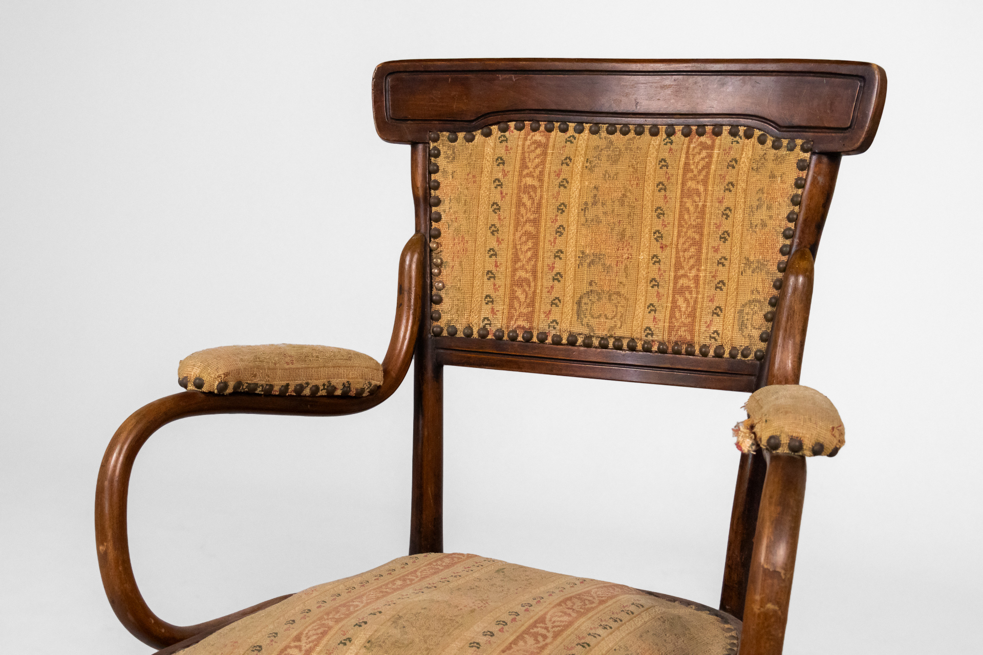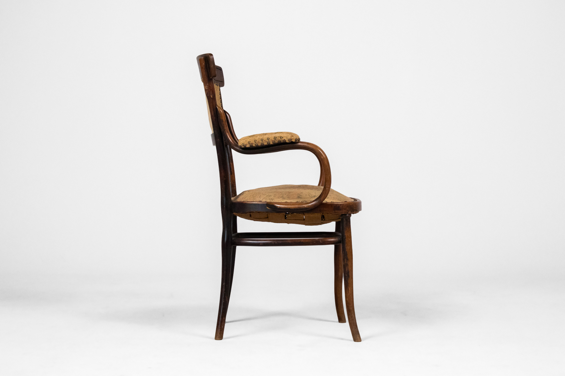 Fából készült, sötétbarna színű karosszék, ívelt háttámlával és világosbarna, mintás kárpittal