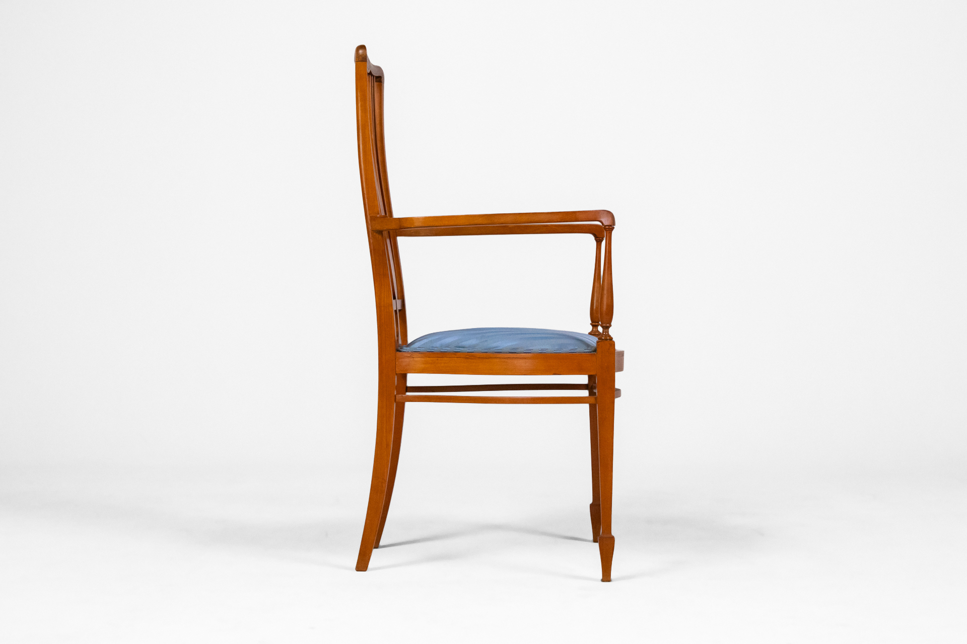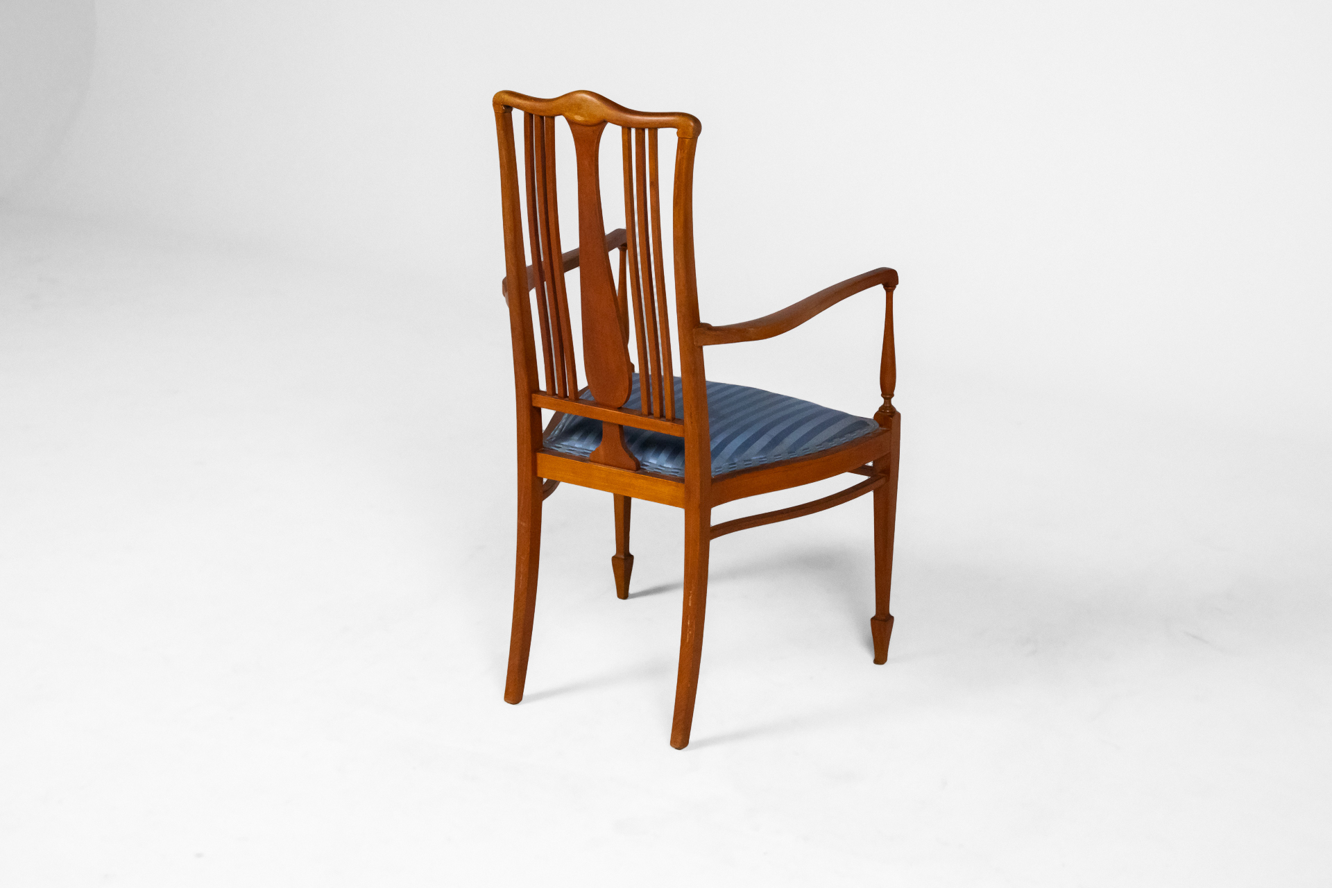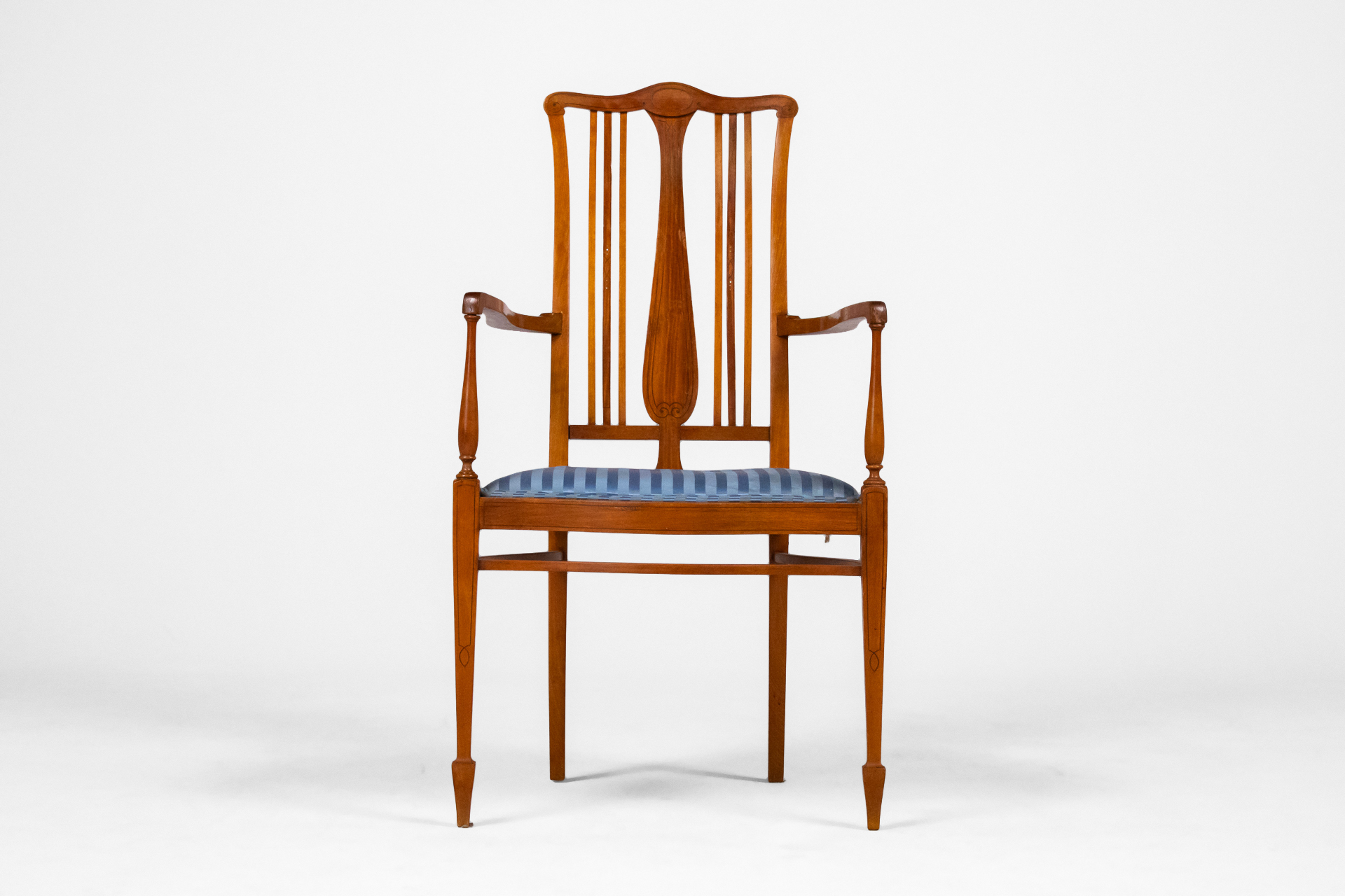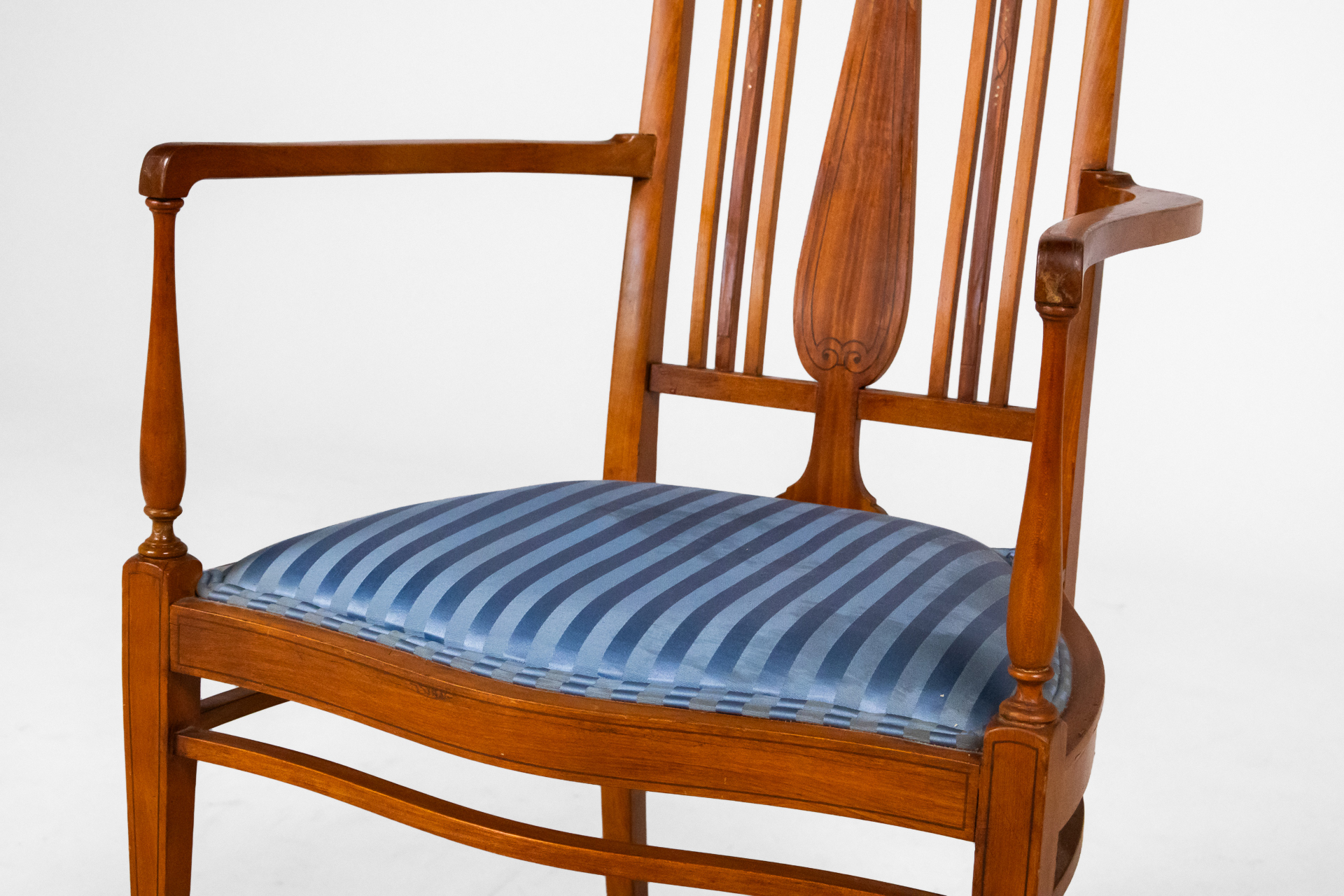 Fából készült, világosbarna szék, függőleges vonalakkal a háttámlán, kék csíkos kárpitozott ülőfelülettel